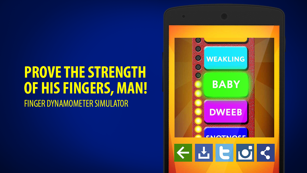 Dedo Dinamómetro Simulador - es una imitación de un dedo trazo simulador de paseo con un martillo en las ferias y en el circo! Quién eres tú - dohlyak o deportista? ¿Tiene un fuerte golpe en un dedo de la mano? Demostrar su frescura! Tratar de obtener los mejores resultados, utilice el pulgar! Una mejor dedo índice, medio o anillo? O los más fuertes meñique? PRECAUCIÓN tenga cuidado de no romper su teléfono! Dinamómetro dedo único simulador que produce resultados al azar y no mostrar su verdadero poder! Esta aplicación es una broma, y no una verdadera atracción o simulador! No trate de ganarle al objeto pesado sobre el teléfono o con un martillo! Golpee el mejor resultado, y compártelo con tus amigos en las redes sociales! Ejercicio, ejercicio diario, y entonces sus dedos, y el cuerpo entero está en un gran estado de forma! Bueno, atleta, demostrar su fuerza?...