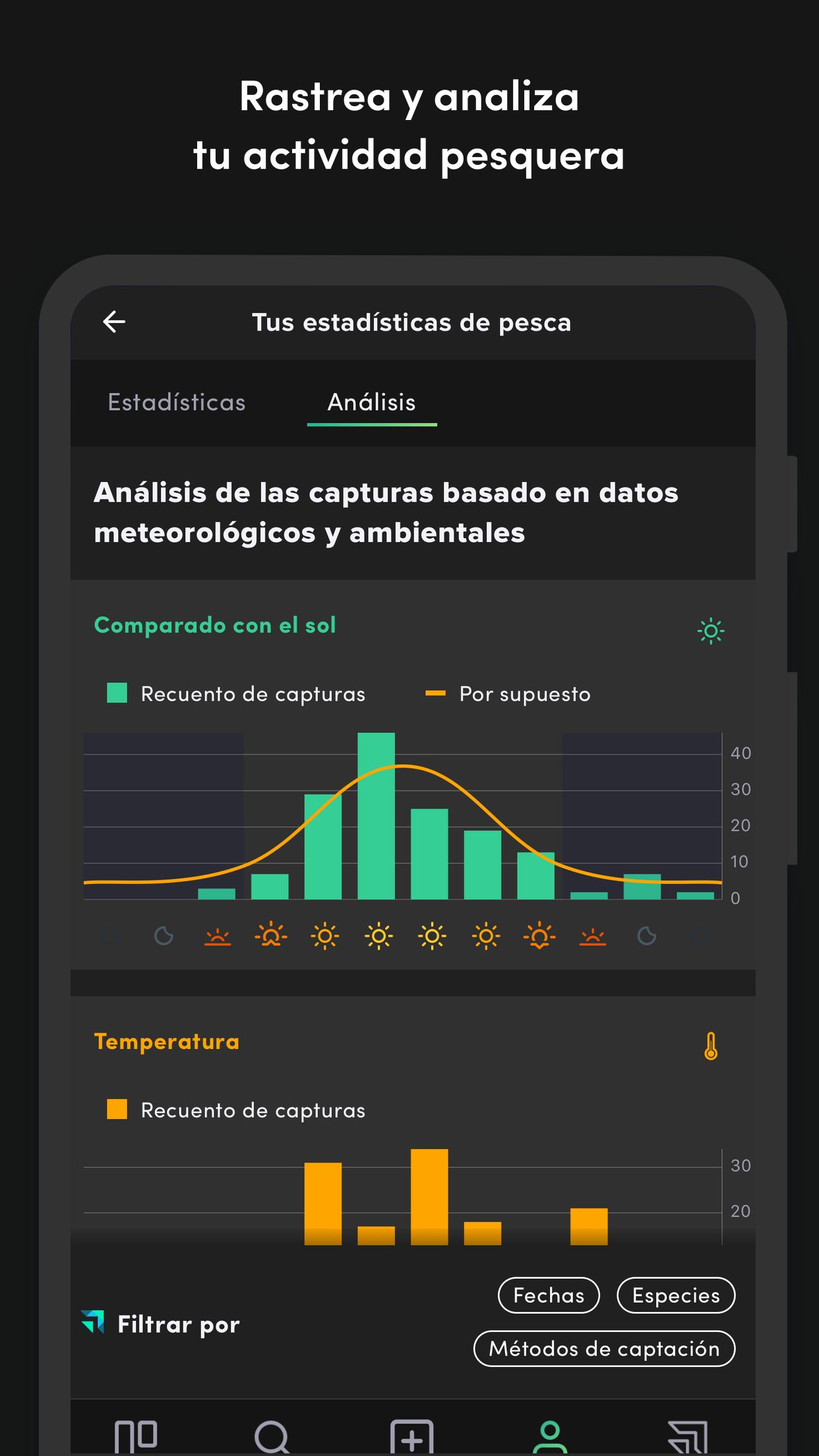 ¡Mantenga un historial de todas sus capturas y los datos meteorológicos asociados, comparta y converse con sus amigos sobre sus capturas y equipos para saber qué funciona mejor!