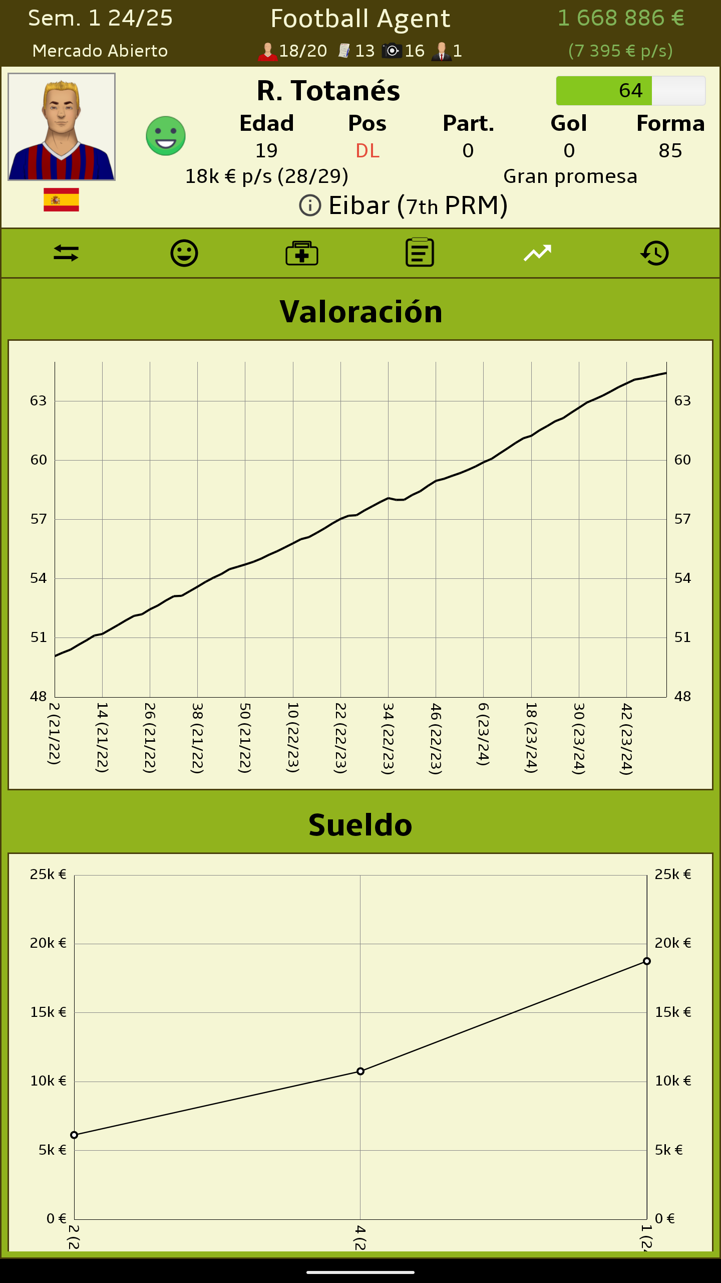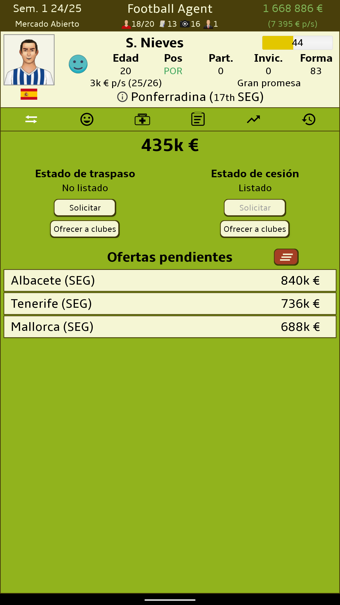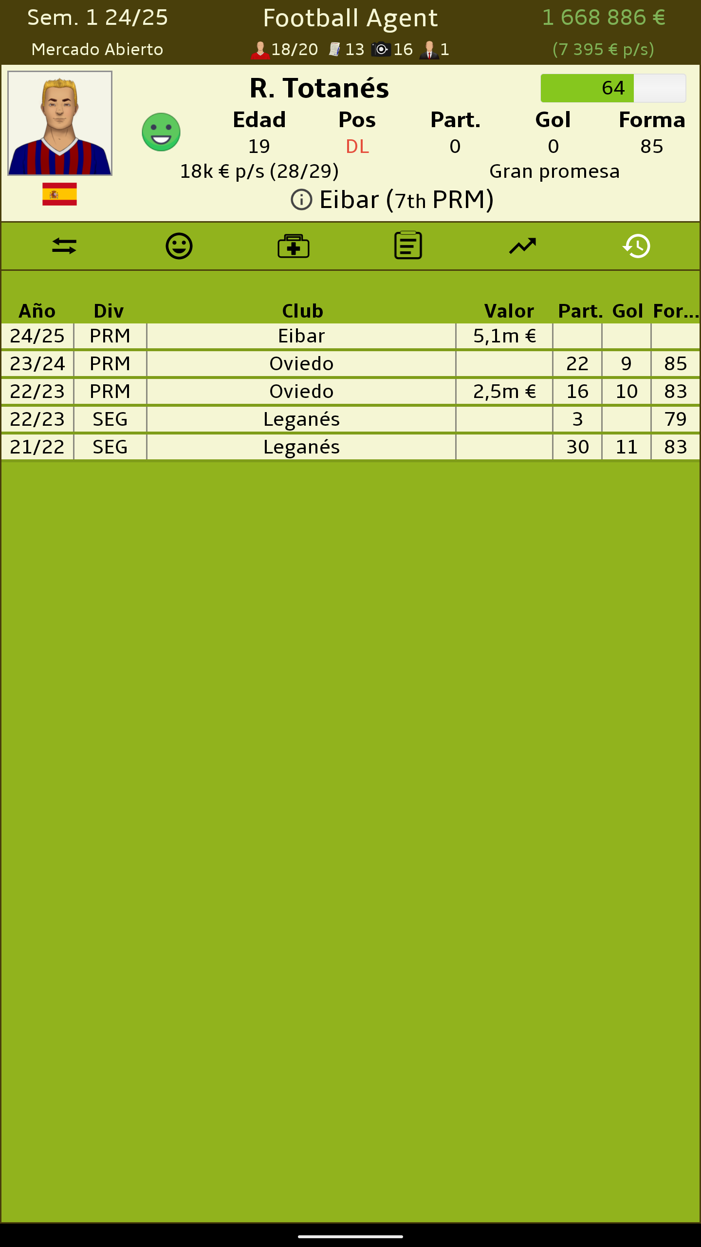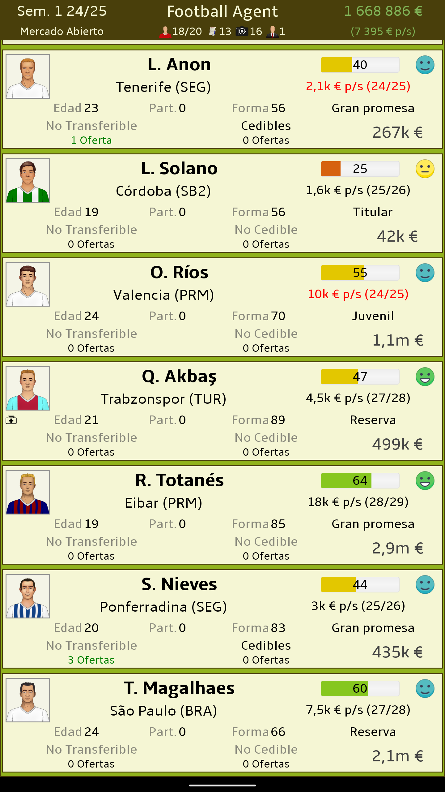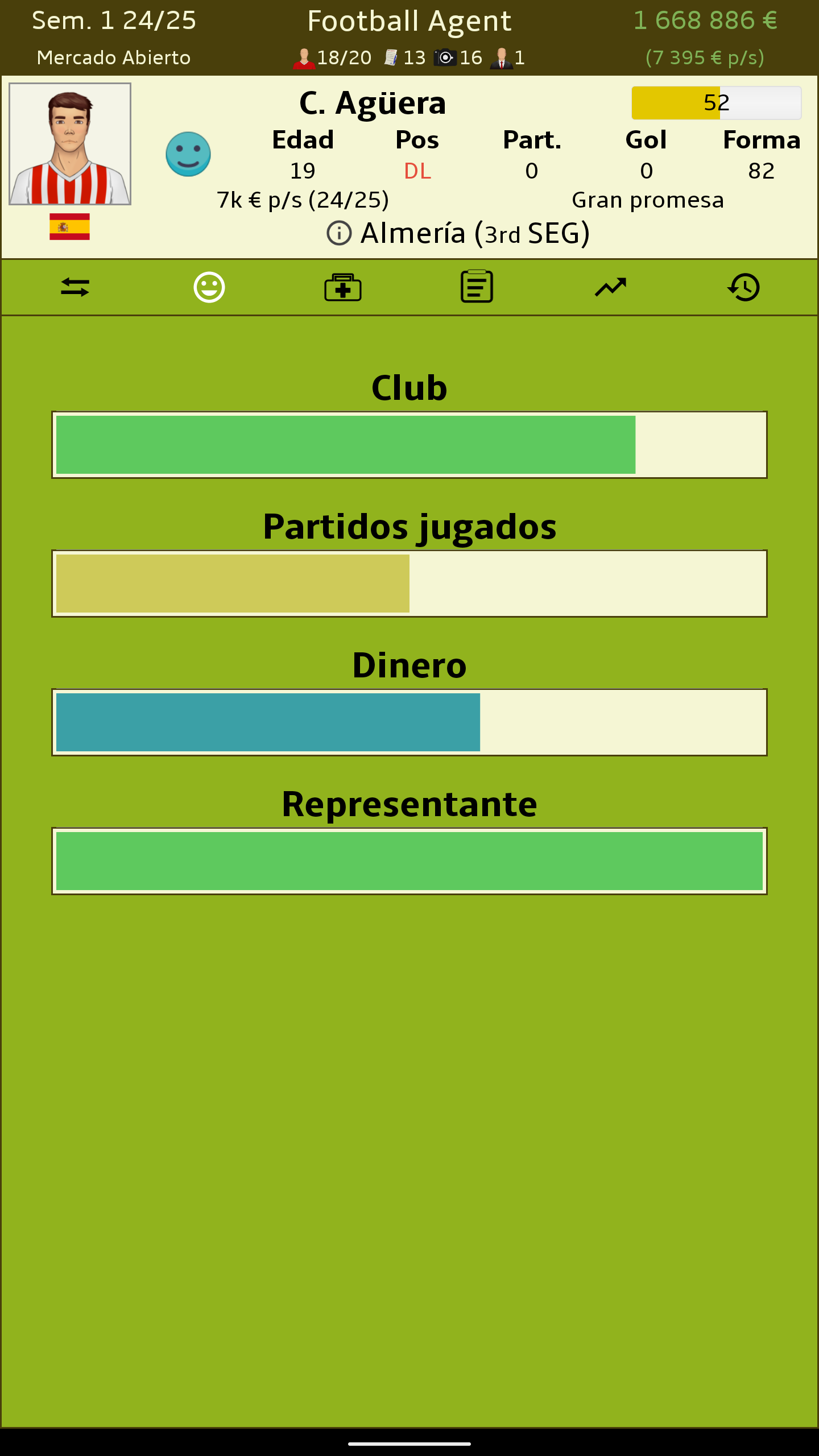 Sé la persona detras de los mayores acuerdos en el fútbol. No te importan los trofeos ni las medallas. Solo te importa el dinero y la felicidad de tus clientes. • Juega en Inglaterra, España, Alemania, Holanda, Francia, Países Bajos, Rusia, Turquía, República Checa, Polonia, Brasil, Portugal o Italia. • Negocia acuerdos en nombre de tus clientes. • Compensa la felicidad de tus clientes mientras te aseguras de obtener tu paga. • Ojea para descubrir jugadores que pueden ser las próximas superestrellas. • Mantén a tus clientes felices lidiando con sus problemas personales. • Forja relaciones con los clubes para tener los mejores acuerdos. • Multiples monedas - EUR, USD, ARS, MXN • Compárate con los demás agentes del mundo con las tablas de clasificación de Google Play. • Disponible en Español • Actualizado a la temporada 2020/21 • Create your own game world in 60+ nations with the built-in editor Want to help translate Representante de Fútbol (Football Agent)? Check out https://crowdin.com/project/football-agent