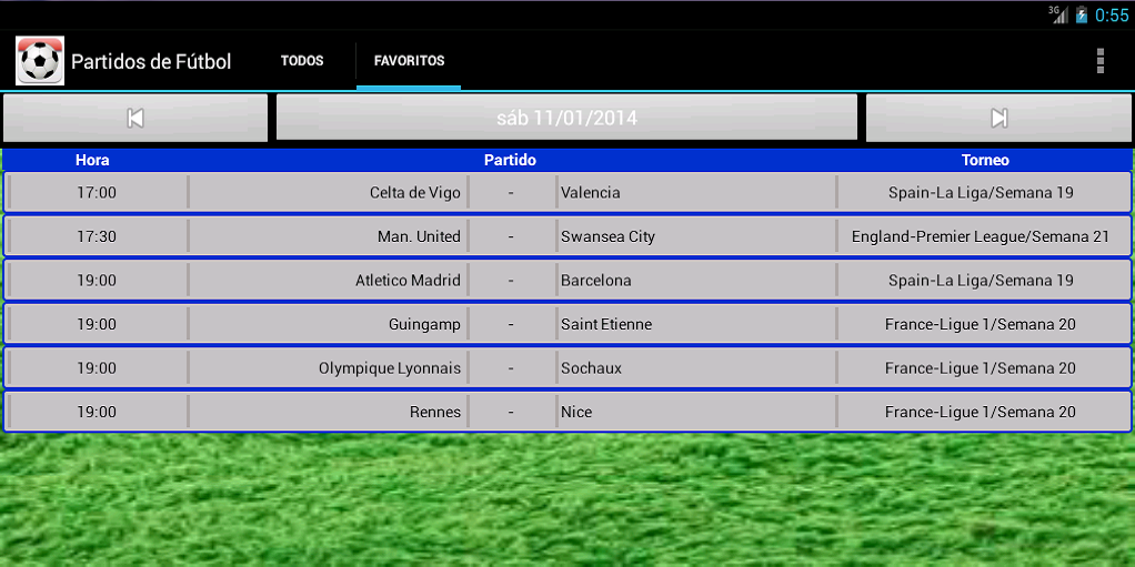 Esta aplicación es una aplicación de horarios de fútbol, que le ayuda a conocer los horarios de los partidos de fútbol y sus resultados en vivo. Puede informarse acerca de los partidos de hoy, o sobre los partidos de cualquier fecha en específico.