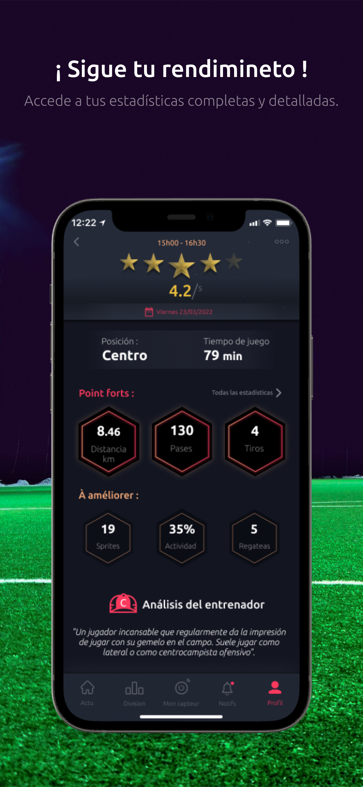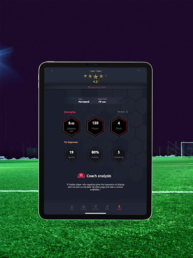 Nuestro sensor, el Meteor, te permitirá tener tus estadísticas como tus km recorridos, tu velocidad etc. ¡ Adamás de estas estadísticas físicas, podrás ver tu numéro de pases, de tiros, tu potencia de tiro y muchas más estadísticas técnicas !