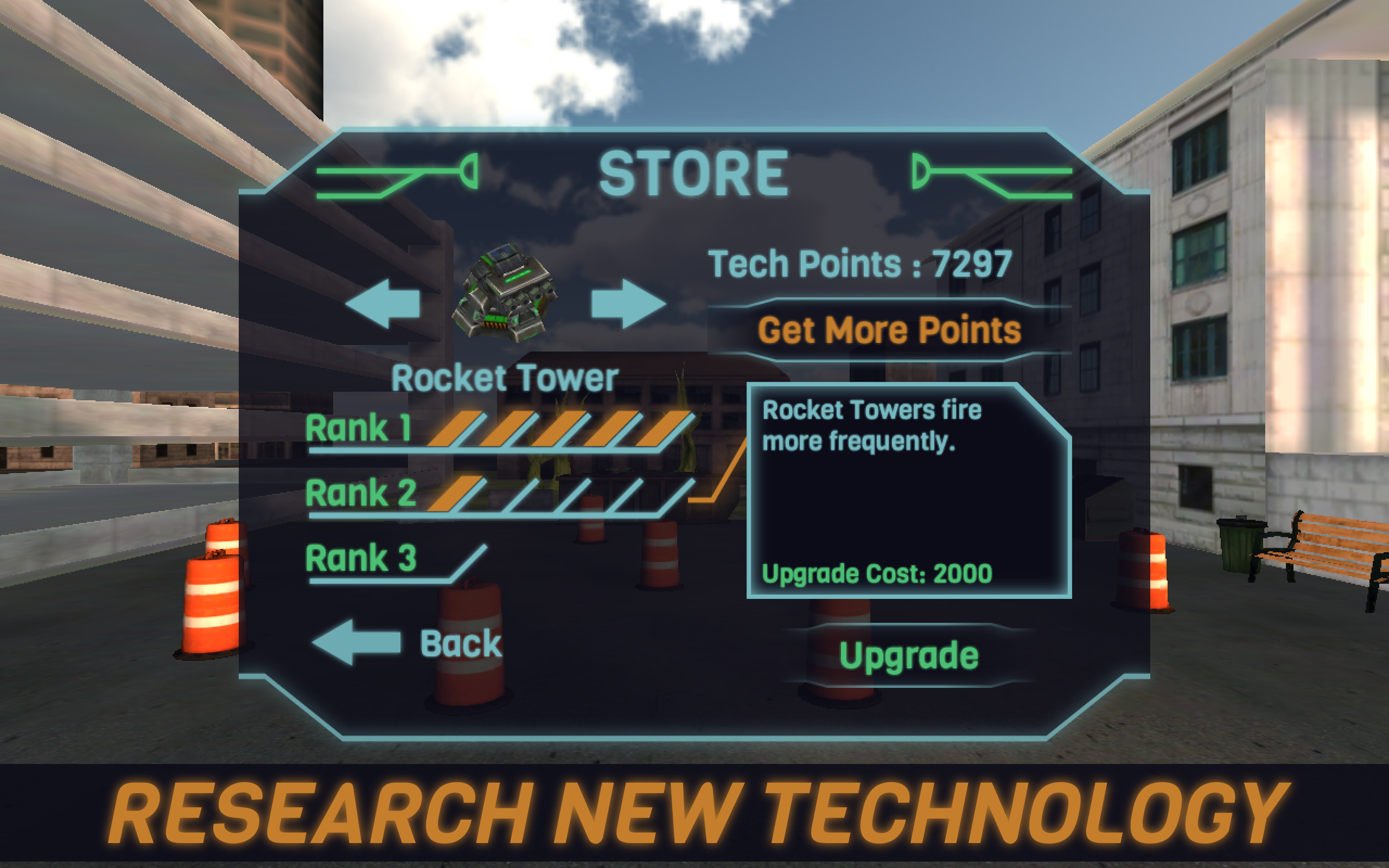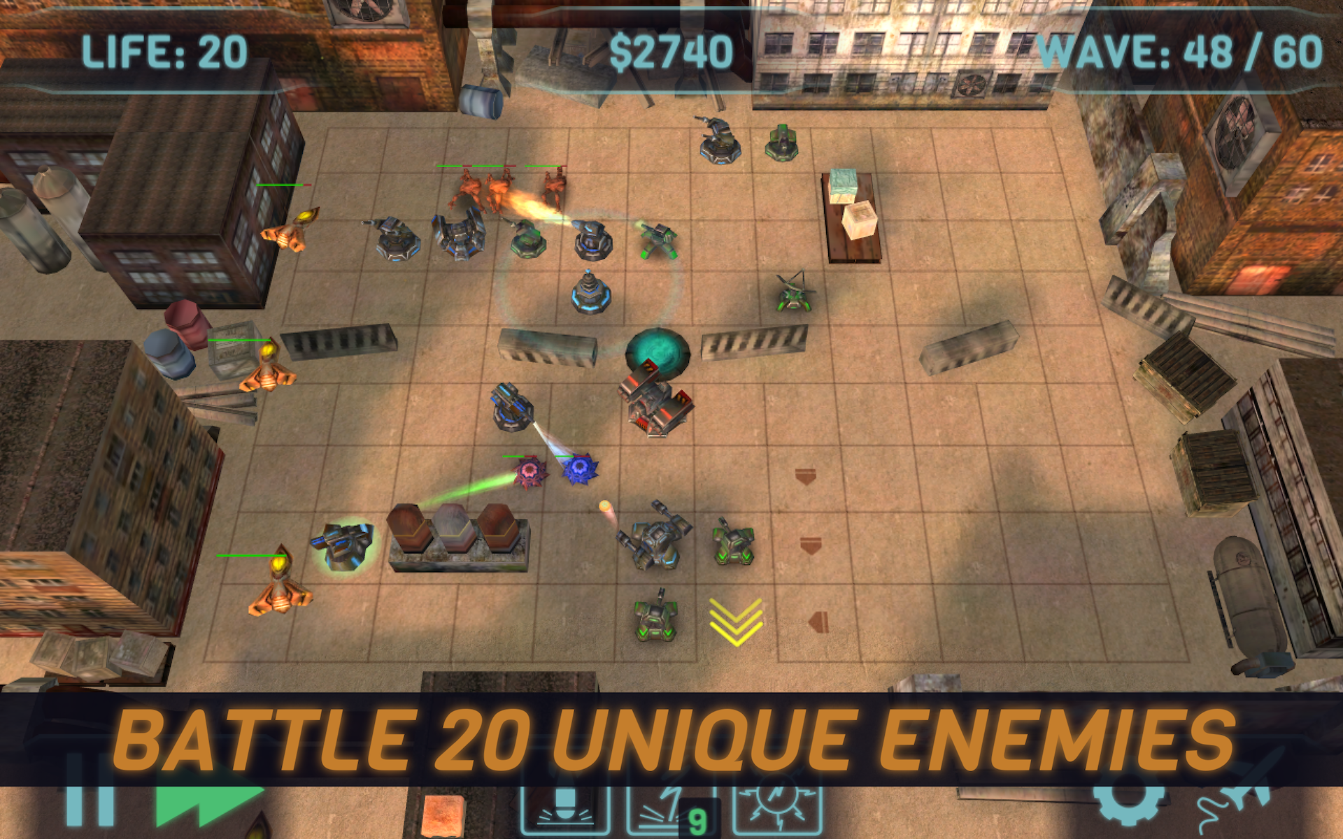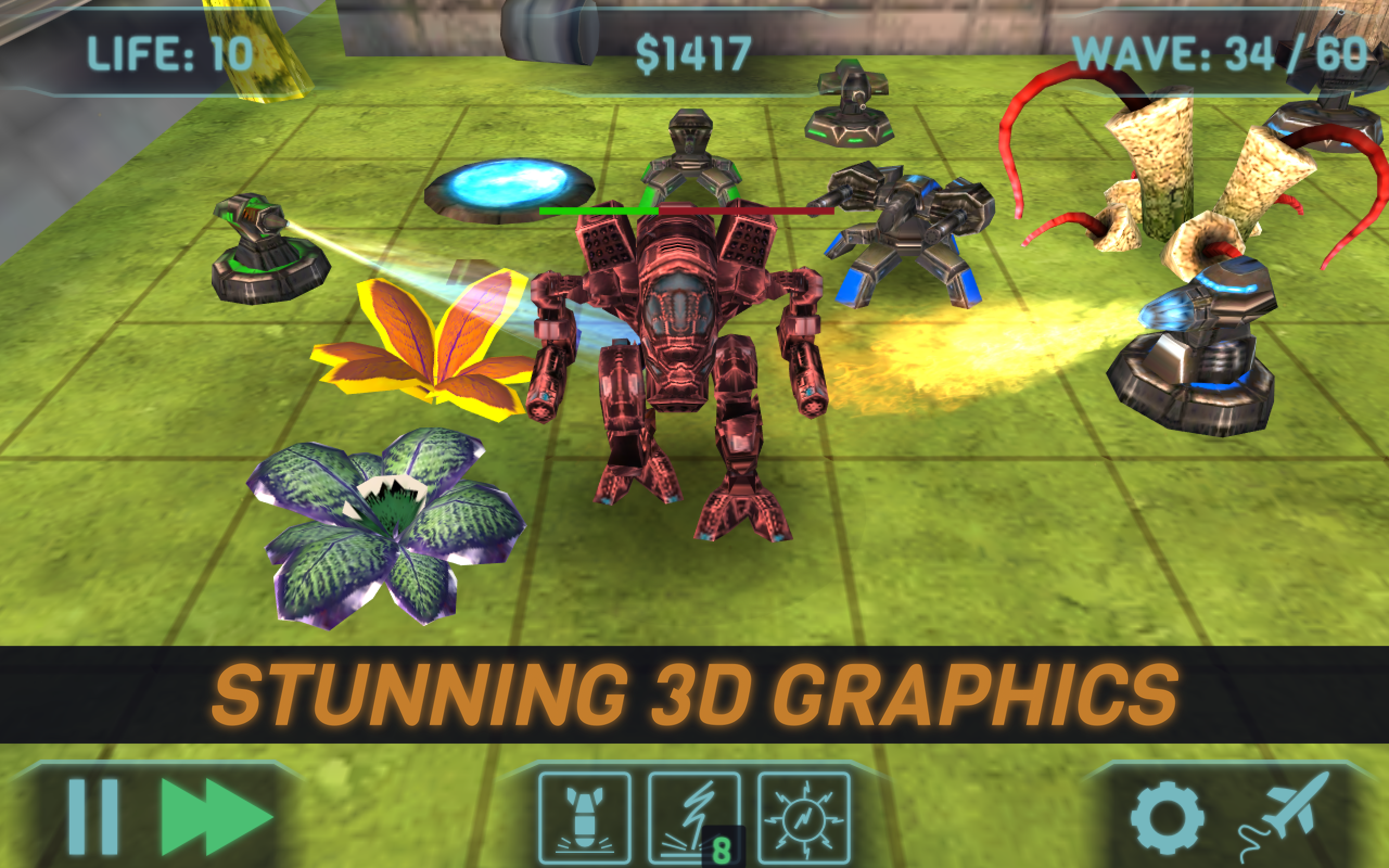 The invaders struck without warning! Defend your world against an alien onslaught spanning a dozen battle zones across four days of combat, each more difficult than the one before. With a complete arsenal of towers to build and upgrade, you must shape the invaders’ paths across the battle grid and eliminate them before they breach the containment zone. Unleash the power of 5 activated abilities to destroy your enemies, raining destruction down upon them in stunning 3D graphics! With every defeated invader, you’ll acquire Tech Points that can be used to permanently upgrade your towers, unlock new abilities, and activate power-ups.