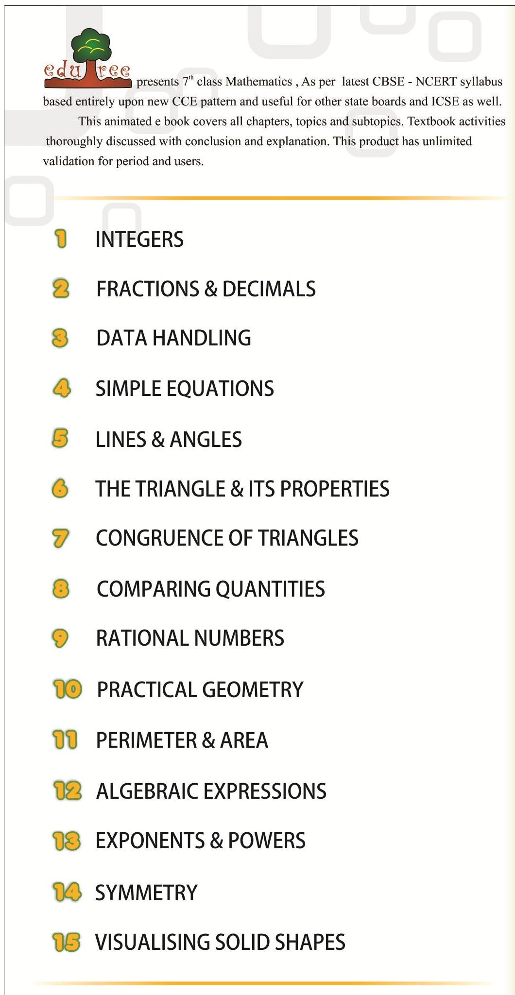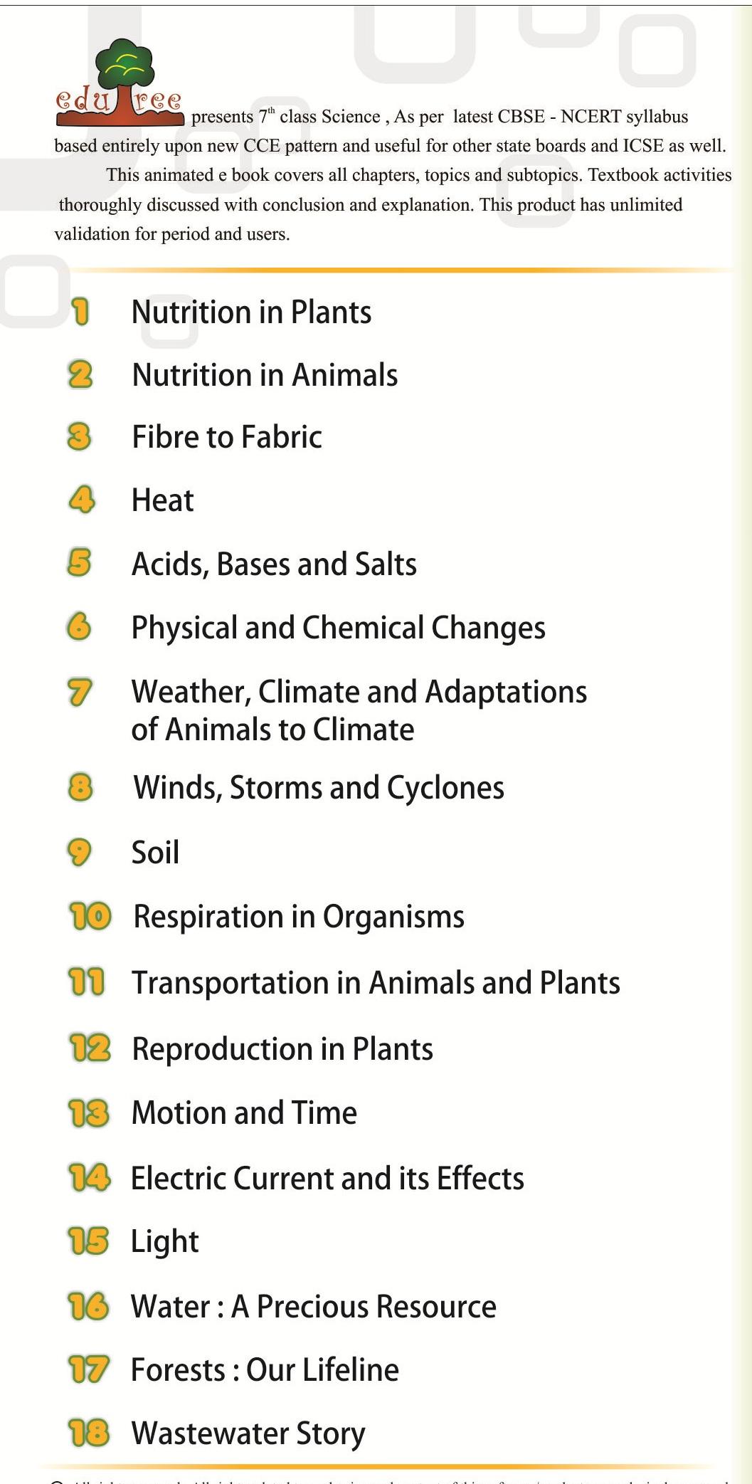 CBSE 7th 100% Animated SCIENCE &MATHS (7+8=15 HRS DURATION) www.edu-tree.com ======================================================= CBSE-7th SCIENCE WE HAVE COVERED ALL NCERT -18 CHAPTERS pls ref -ALL chapters given in THIS APP screenshots =================================================== CBSE-7th MATHS WE HAVE COVERED ALL NCERT -15 CHAPTERS pls ref -ALL chapters given in THIS APP screenshots