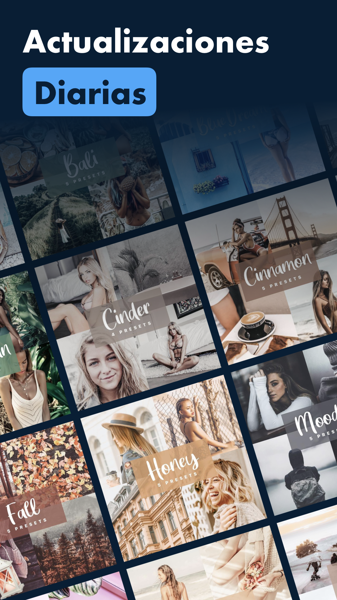 • ¿Le gustan las fotos con ciertos tonos? Use Azure, Bright & Airy, Black & Whites, Blue Dream, Caramel, Cinder, Cinnamon, Creamy, Mousse, Nude Tones, Pale Rose, Powder Packs