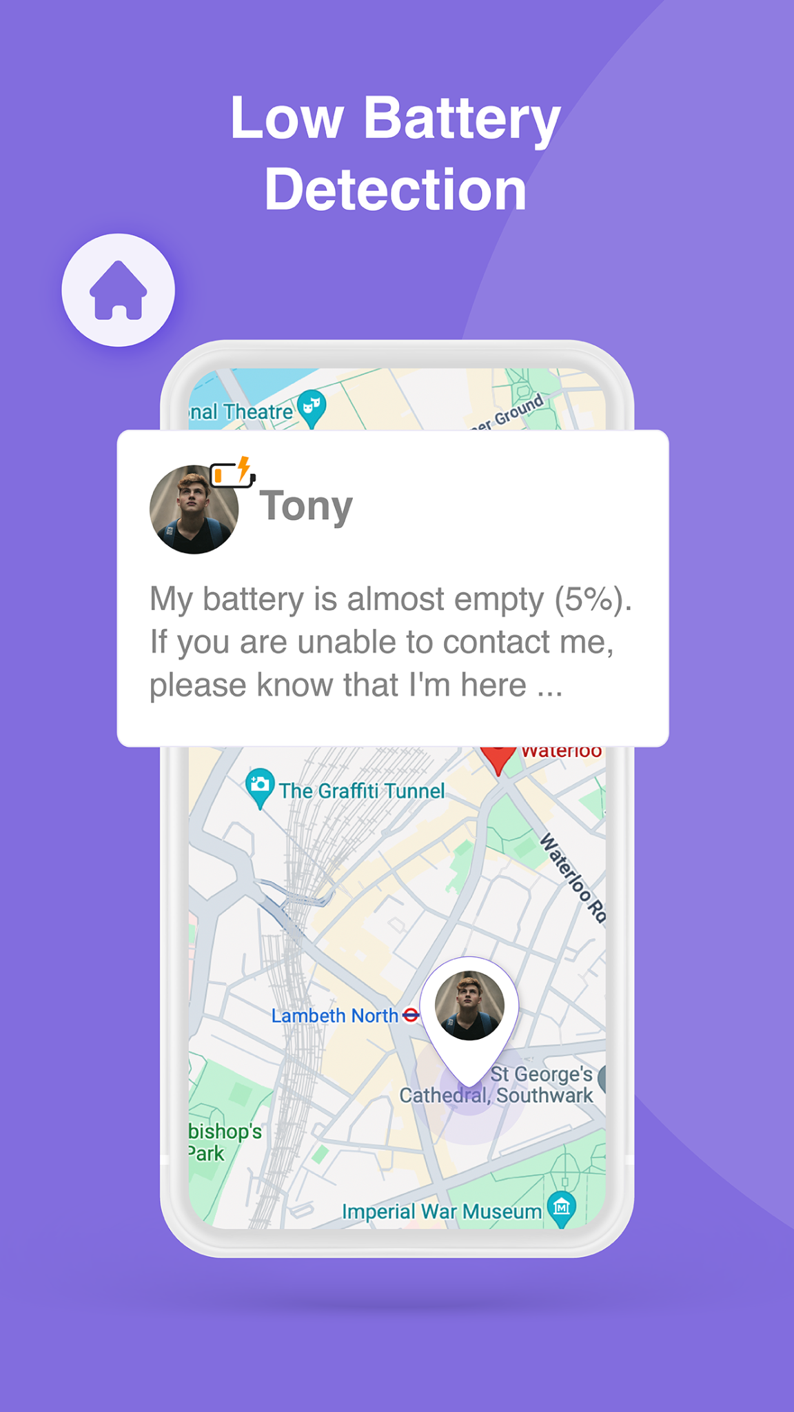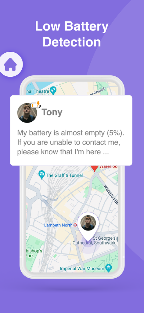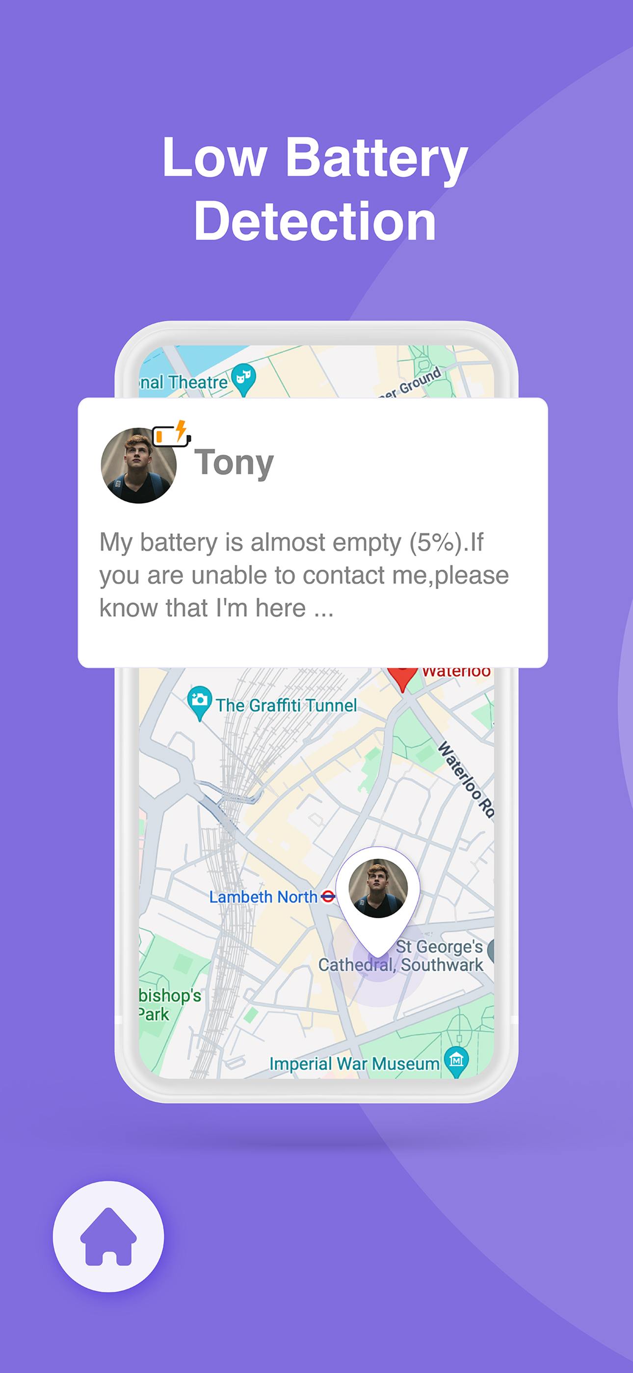 En situaciones críticas en las que la batería del teléfono del usuario está baja, Friend Tracker envía automáticamente un mensaje a los contactos especificados. Esta función mejora la seguridad al informar automáticamente a los allegados del nivel de batería del usuario, lo que permite una intervención inmediata en caso necesario.