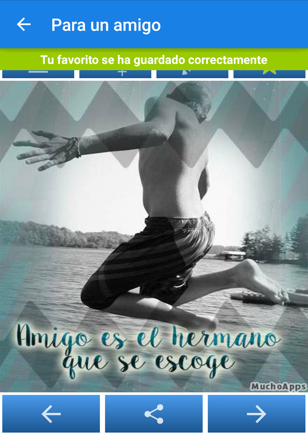 Frases de amistad es una aplicación que contiene una recopilación con las mejores frases para amigos que puedes encontrar en la actualidad. Hemos creado estas imágenes de amistad para que puedas compartirlas con todos tus seres queridos y con tus mejores amigos que tienes en la vida. Ellos se lo merecen, así que lo mejor que puedes hacer es tener un detalle con ellos, diciéndolos todo lo que les quieres. Si no se te ocurre qué decirle a tus amigos o amistades, esta aplicación te ayudará, ya que contiene muchas frases sobre la amistad y su significado. A continuación te explicamos algunas características de esta aplicación: * Hemos creado y seleccionado las que a nuestro parecer, son las mejores frases de amigos. * Encontrarás diferentes categorías: para un amigo, para una amiga, de decepción de amistad, de amistad y amor, poemas de amistad, mensajes de ánimo para un amigo, amistad a distancia, etc. De esta forma podrás elegir los mensajes más apropiados para cada momento. * Hemos creado un completo editor para que puedas añadir textos a los diseños que más te gusten. Elige el tamaño de letra, color y ubicación para personalizar todas las imágenes a tu gusto. * Podrás añadir los diseños que más te gusten a favoritos, para poder encontrarlos de una forma mucho más rápida y sencilla cada vez que vuelvas a utilizar la aplicación. * Podrás utilizarlas para recordar a todos tus seres queridos todo lo que les aprecias. Incluso podrás usar estos mensajes en el día de la amistad o el día del amigo, ya que ese día es una ocasión perfecta para tener un detalle con tus mejores amistades. * Podrás enviar o compartir estos mensajes de amistad a través de tu teléfono o tablet de una forma rápida y sencilla. Podrás enviarlos a través de email, sms o cualquier aplicación que tengas instalada, como por ejemplo aplicaciones de mensajería o redes sociales. * La aplicación estará disponible para que la utilices en cualquier momento y su uso es de lo más sencillo. Tan sólo tendrás que utilizar las flechas para pasar a las siguientes frases y utilizar el botón central para compartir las que más te gusten. * Aplicación 100% en español. Encontrarás todo un repertorio de frases de amistad en español. Esperamos que esta aplicación sea de vuestro agrado. De ser así, os agradeceríamos mucho que valorarais la aplicación dándonos una buena puntuación, ya que eso nos ayudará a seguir mejorando y nos dará los ánimos para seguir subiendo más imágenes de amigos. Además de frases, también podéis encontrar poemas de amistad y versos de amistad. Nota legal: Todas las tarjetas de amistad que se encuentran en esta aplicación han sido creadas por diseñadores en exclusiva para MuchoApps, por lo que está prohibido el uso comercial de cualquier imagen que se encuentre dentro de este programa sin el previo consentimiento de MuchoApps. Para algunos montajes, se han utilizado imágenes de dominio público, ya que las mismas no se encuentran identificadas de ningún modo que indique la existencia de derecho de explotación reservado sobre las mismas. Cualquier persona física o jurídica que fuera propietario de alguna de las imágenes contenidas en la misma, puede acreditarlo accediendo a http://muchoapps.com/ , y escribiéndonos un mensaje a través de la sección “Contacto”, comprometiéndonos a la inmediata retirada de dicha imagen una vez comprobada, en su caso, la titularidad de la imagen protegida.