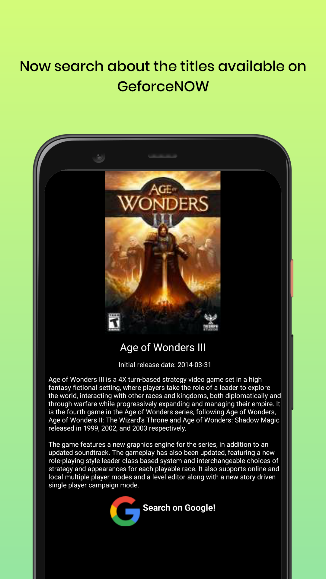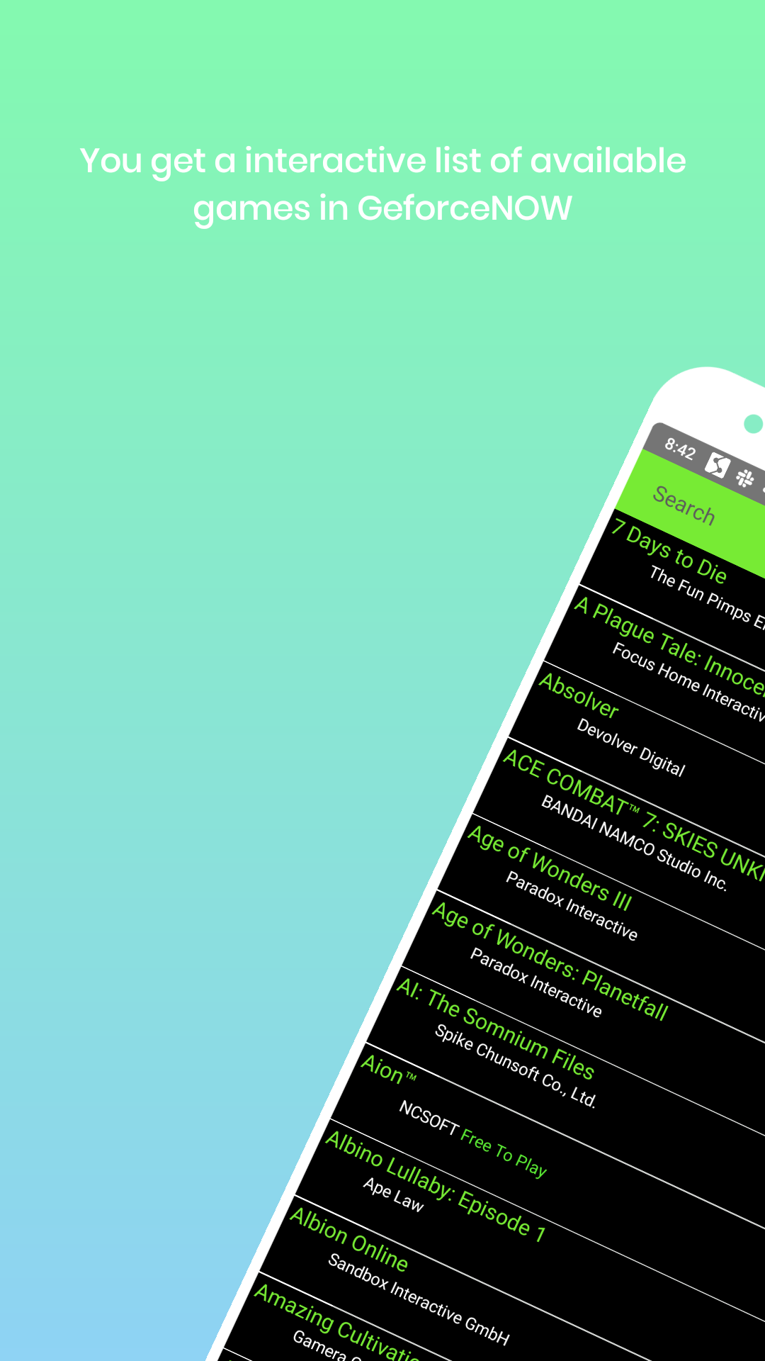 Esta aplicación le proporciona la última lista actual de todos los juegos disponibles en la plataforma Nvidia Geforce Now. caracteristicas: 1. Una interfaz limpia y fácil de usar. 2. Lista de todos los juegos disponibles a tu alcance. 3. Busque entre sus títulos favoritos. 4. Gratis para jugar juegos marcados 5. Obtenga detalles de los juegos. Descargo de responsabilidad: No pretendemos de ninguna forma replicar el uso no autorizado de ningún material con derechos de autor. Esto solo pretende ser una lista de juegos disponibles en dicha plataforma con fines educativos.