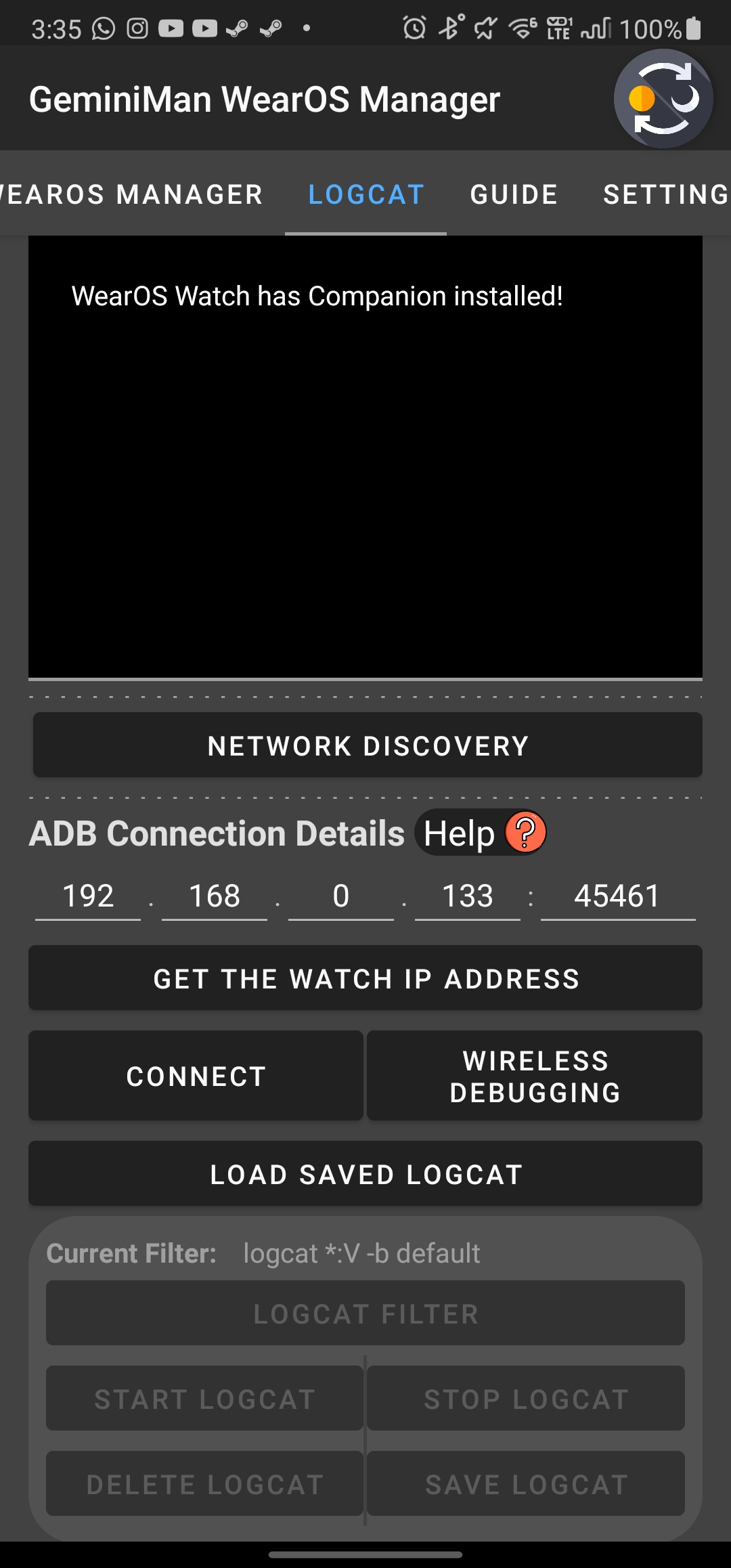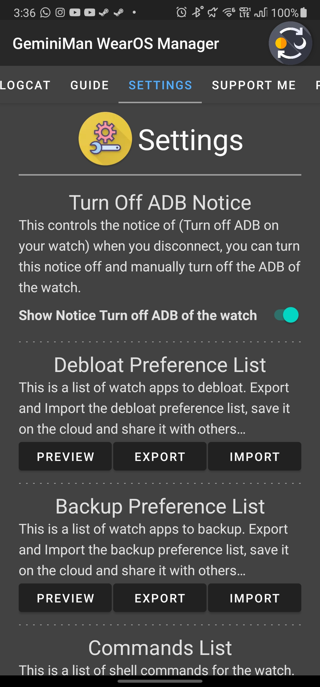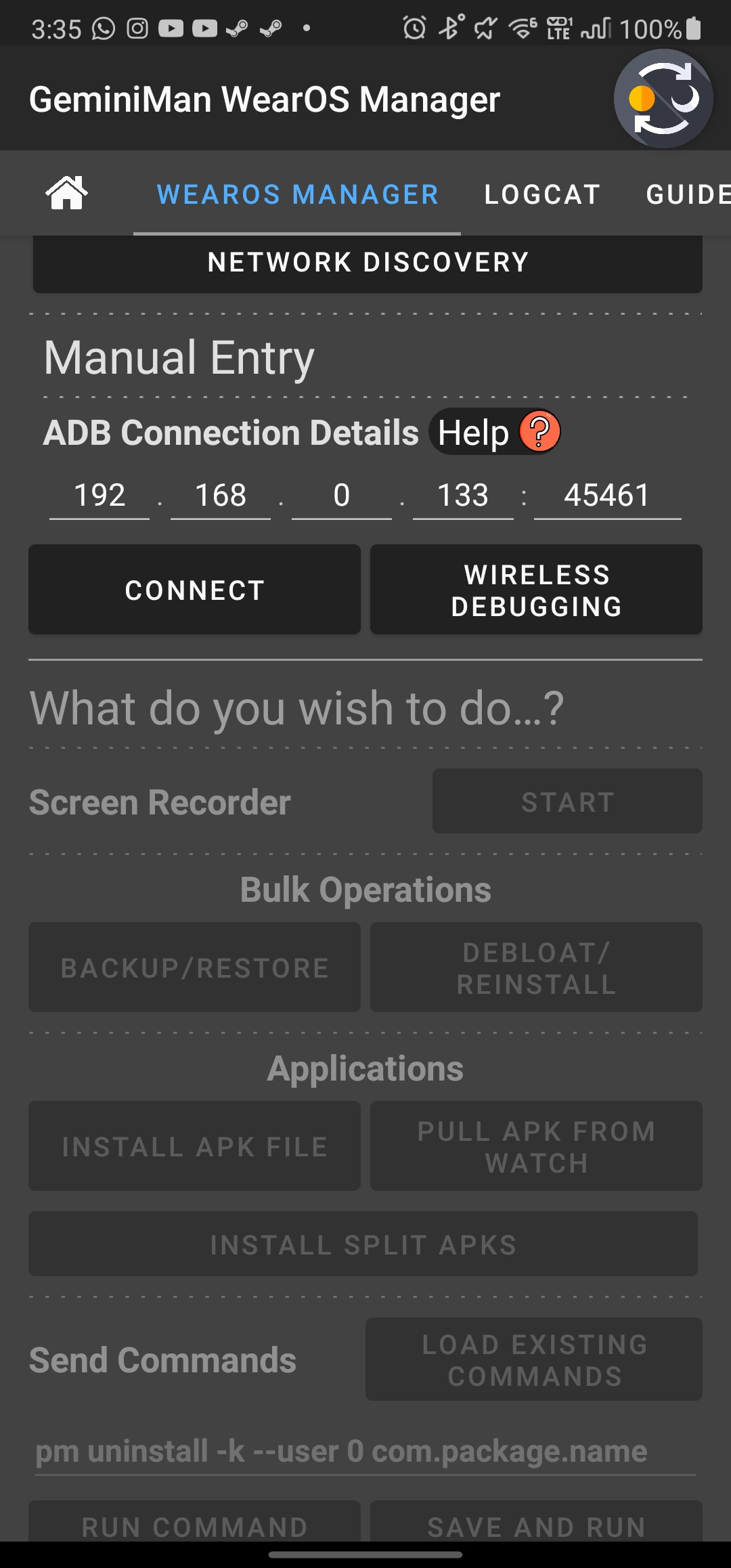 GeminiMan WearOS Manager es una herramienta de aplicación que le permite realizar varios comandos ADB a través de Wi-Fi con su Wear OS Watch... * ACTUALIZACIÓN IMPORTANTE de 4.5.*: - Network Discovery: si no desea ingresar ninguna IP o puerto, escanee con Network Discovery mientras su reloj está en la pantalla de depuración inalámbrica. Solo necesita proporcionar un código de emparejamiento si desea realizar el emparejamiento antes de conectarse... - La copia de seguridad maneja APK divididos; También puedes extraer cualquier APK dividido... - Exportación e importación de copias de seguridad tienen animación... - Mucho pulido hecho... * ACTUALIZACIÓN IMPORTANTE de 4.*.*: - Lógica ADB pulida, ejecuciones ligeramente más rápidas y eficientes de todo... - La depuración inalámbrica ahora es compatible... - Cambiar de aplicación no afecta el adb, aunque no es recomendable cambiar... - Expandir y contraer el diseño de los comandos de shell para una mejor vista del registro... - Desplazamiento de la vista de registro mejorado... - Tiempo agregado para grabación de pantalla. Puedes ver cuánto tiempo has grabado en tu reloj, 180 segundos como máximo y añadir una cuenta atrás en el botón de parada... - Puedes nombrar la carpeta de respaldo... - Y como siempre, matando muchos bichos para ustedes... No olvide informar cualquier problema que encuentre. Información general: - La aplicación Watch, como independiente, solo puede mostrar la dirección IP, pero se recomienda tenerla y usarla junto con la aplicación del teléfono. Permite que la aplicación del teléfono obtenga la dirección IP directamente (si la IP es 0.0.0.0, mostrará un mensaje "conéctese a Wi-Fi", y si la depuración del reloj está desactivada, le indicará que "active la depuración") ... - La aplicación del teléfono también puede mantener activa la pantalla del reloj durante toda la conexión adb para evitar interrupciones al activar el reloj usando la aplicación del reloj... - La aplicación del teléfono también puede obtener una lista de aplicaciones instaladas en su reloj, lo que facilita la eliminación y la copia de seguridad, ya que puede ver los nombres e íconos de las aplicaciones con una guía detallada de seguridad para la eliminación (rojo, naranja y verde)... - La herramienta es muy amigable y tiene un registro de actividad desde que presionas ADB Connect hasta que te desconectas. Todas las operaciones realizadas se registran para que sepa qué se ha realizado y pueda rastrear dónde falló. El registro se borra cuando abandonas la actividad... Puedes realizar operaciones simples: * Instalar APK en el reloj WearOS... * Extraer APK del WearOS Watch... * Realice varios comandos de Shell para mejorar su experiencia con WearOS Watch, desde desinstalar APK hasta modificar DPI, etc. La herramienta ADB ofrece guardar comandos de shell sin límite, por lo que siempre puede cargar un comando de shell guardado y ejecutarlo con facilidad... Proporciona operaciones complejas como: * Grabe la pantalla de su reloj ... * Desbloquear varias aplicaciones de reloj... * Copia de seguridad de varias aplicaciones de reloj... * exportar configuraciones y preferencias para compartir con tus amigos... * Cree un logcat y realice un seguimiento de las actividades del reloj, capture las causas del fallo de la aplicación del reloj y mucho más... ¿Problemas de traducción...? La aplicación está traducida por Google, no dudes en enviarme un correo electrónico si deseas ayudar con las traducciones, los créditos se mencionarán en el selector de idioma... NOTICIA IMPORTANTE: *** Esta herramienta fue creada y desarrollada principalmente para relojes Wear OS. Ha sido probado en Samsung Watch 4 y 6 Classic; Otros usuarios han informado que la aplicación funciona en otros relojes... *** Esta herramienta hipotéticamente puede funcionar con cualquier dispositivo que admita la depuración a través de Wi-Fi, pero tenga en cuenta que verá constantemente el mensaje (No hay ningún reloj WearOS conectado) -> (Esto, sin embargo, puede cambiar en el futuro, dependiendo de características que Google presenta para que las utilicen los desarrolladores, por ejemplo: Google hizo que la detección de Android TV fuera muy fácil, es posible agregar una condición if y marcar Watch o TV)... *** Si tiene problemas, envíeme sus comentarios directamente o por correo electrónico para que pueda solucionarlo... La aplicación está disponible para teléfono y reloj... Fue desarrollado con pasión y manejado con amor y cuidado ♡... Espero que les guste... No dudes en comunicarte conmigo si tienes alguna sugerencia... ~ Categoría: Aplicación