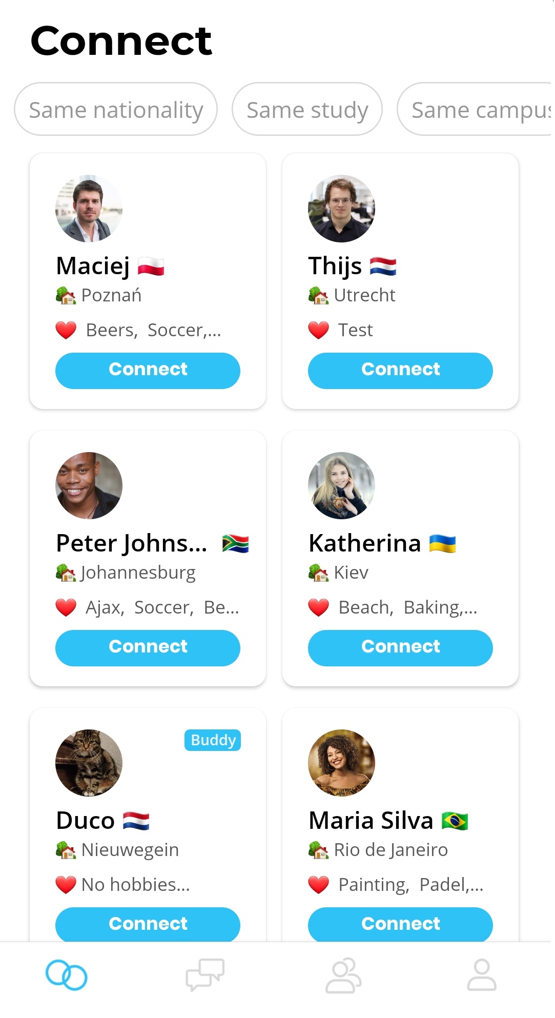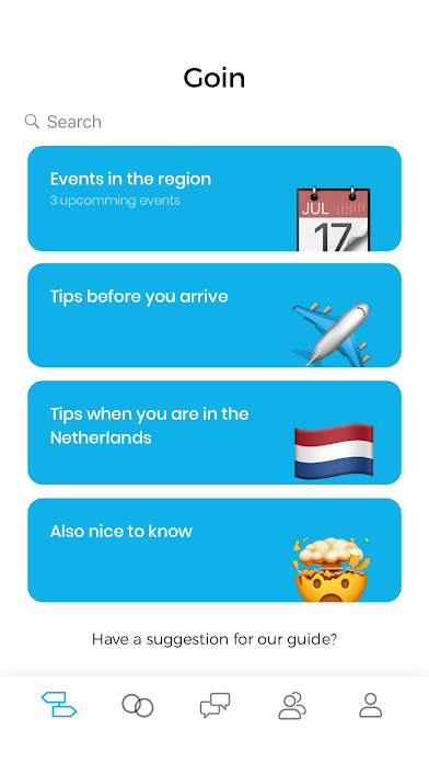 ¡Conoce a tus futuros compañeros de clase! ¿Vas a estudiar al extranjero? ¡Consulta hoy quiénes serán tus futuros compañeros de clase! Filtra según el estudio, la nacionalidad y más para hacer conexiones incluso antes de llegar. Haga preguntas a las personas que están pasando por las mismas dificultades y arregle todas sus tareas pendientes, ¡pero ahora juntos! Unirse a grupos Únase a grupos para explorar actividades con estudiantes de ideas afines. Elige entre grupos deportivos, divertidos, de estudio o profesionales. ¡Encuentra los eventos a los que puedes asistir en los grupos u organízalos tú mismo! Por ejemplo, ¿te gusta el fútbol? Únase al "fútbol 4x4" y únase a sus eventos. ¿Más en una copa el viernes por la noche? Únase a "Bebidas para estudiantes internacionales" y no se pierda la diversión. ¡Conéctese con otros estudiantes antes de su llegada! Consulta la guía de llegada Creamos una colección simple de cosas agradables, cosas que debe hacer y que debe hacer. No es la información básica a la que estás acostumbrado, solo algunos consejos realmente prácticos de los internacionales que vinieron aquí antes que tú.