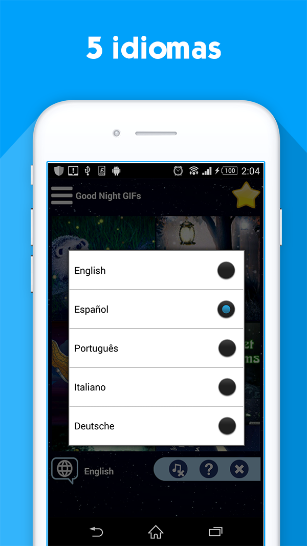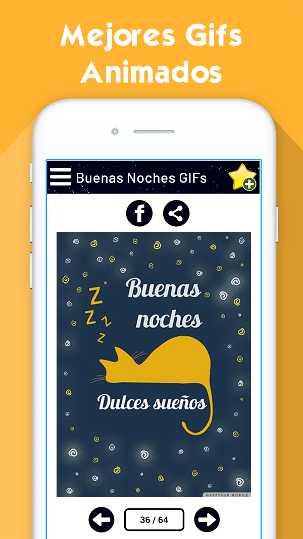 Buenas noches gif es la mejor colección de gif de buenas noches con movimiento. Cada gif tiene lindas animaciones, bellas imágenes y mensajes cálidos. Especialmente la aplicación admite en 8 idiomas: inglés, español, portugués, alemán, italiano, francés, malayo y ruso. Nuevos gifs añadidos regularmente. ¡Enviemos imágenes de buenas noches a sus seres queridos para que se sientan felices y tengan linda noche! *** Principales características *** ★ La aplicación tiene cientos de increíbles gif de buenas noches: - 20+ Buenas noches amor: amor gif con frases de buenas noches para tu amor. - 60+ Buenas noches gif animandos: lindo gif con frases para desear a tus amigos y seres queridos una linda noche y dulces sueños. Llegas a encontrar bellas imágenes de la luna, las estrellas y personajes encantadores en el mundo de las fantasías y los sueños. ★ Comparte fácilmente el gifs favorito en Facebook, Whatsapp y otras redes sociales. ★ Guarde la imágenes de buenas noches con mensajes en la tarjeta SD. ★ Agregue / elimine las imágenes de buenas noche desde / hacia la sección de favoritos para que sus imágenes favoritas sean más fáciles de buscar más tarde. ★ Busque buenas noches gif bendiciones por lista o vea en detalle de forma rápida y conveniente.