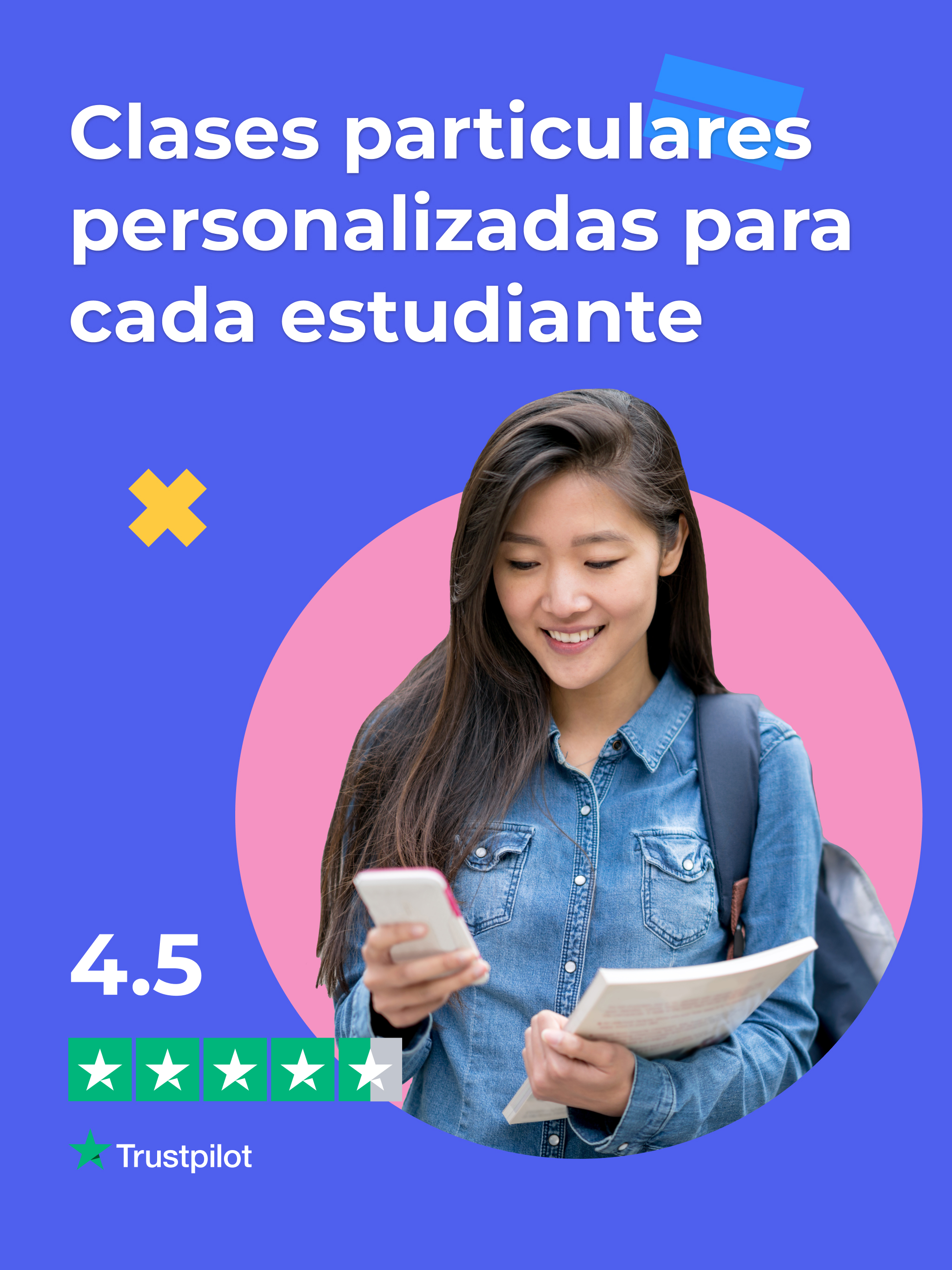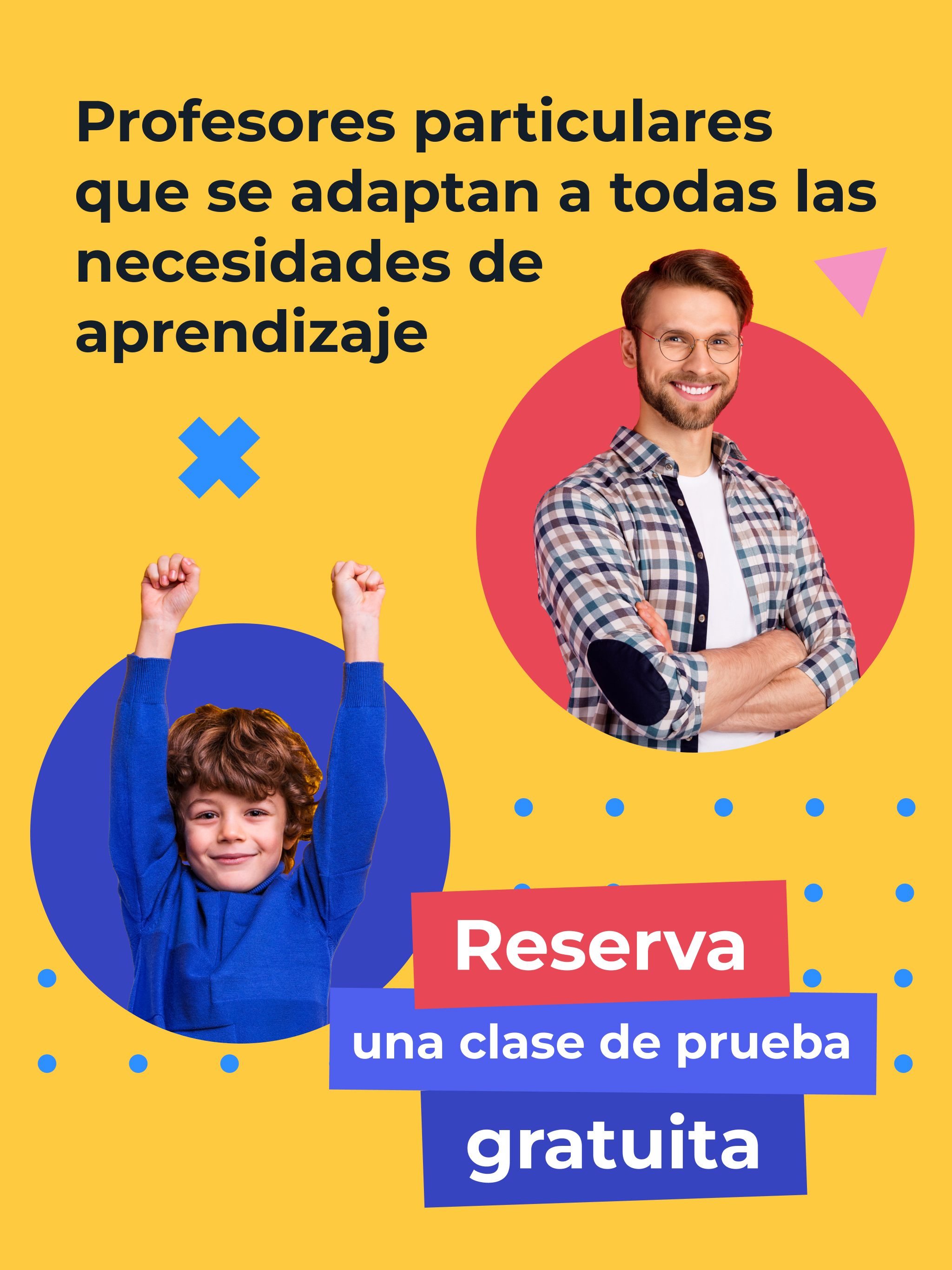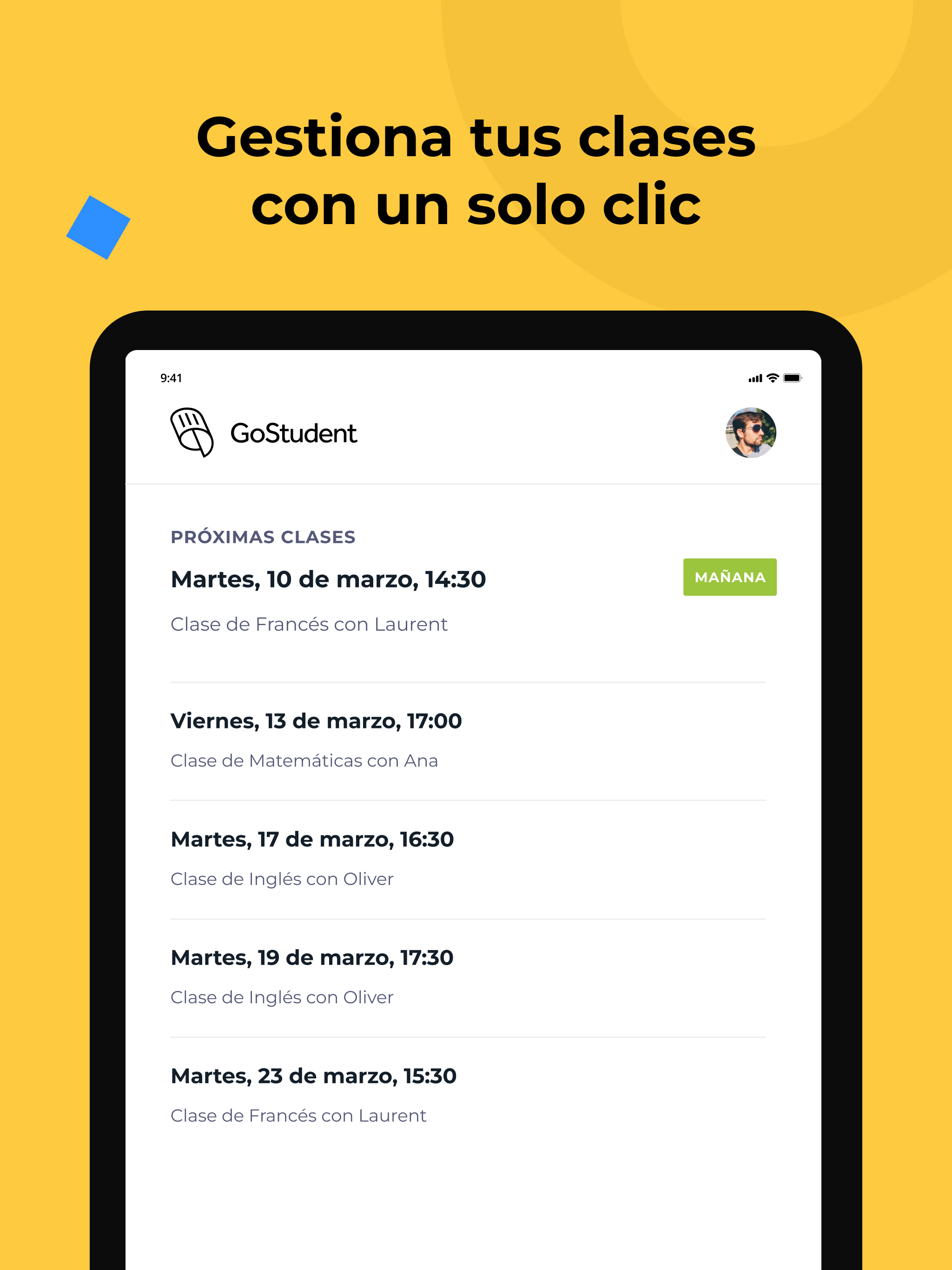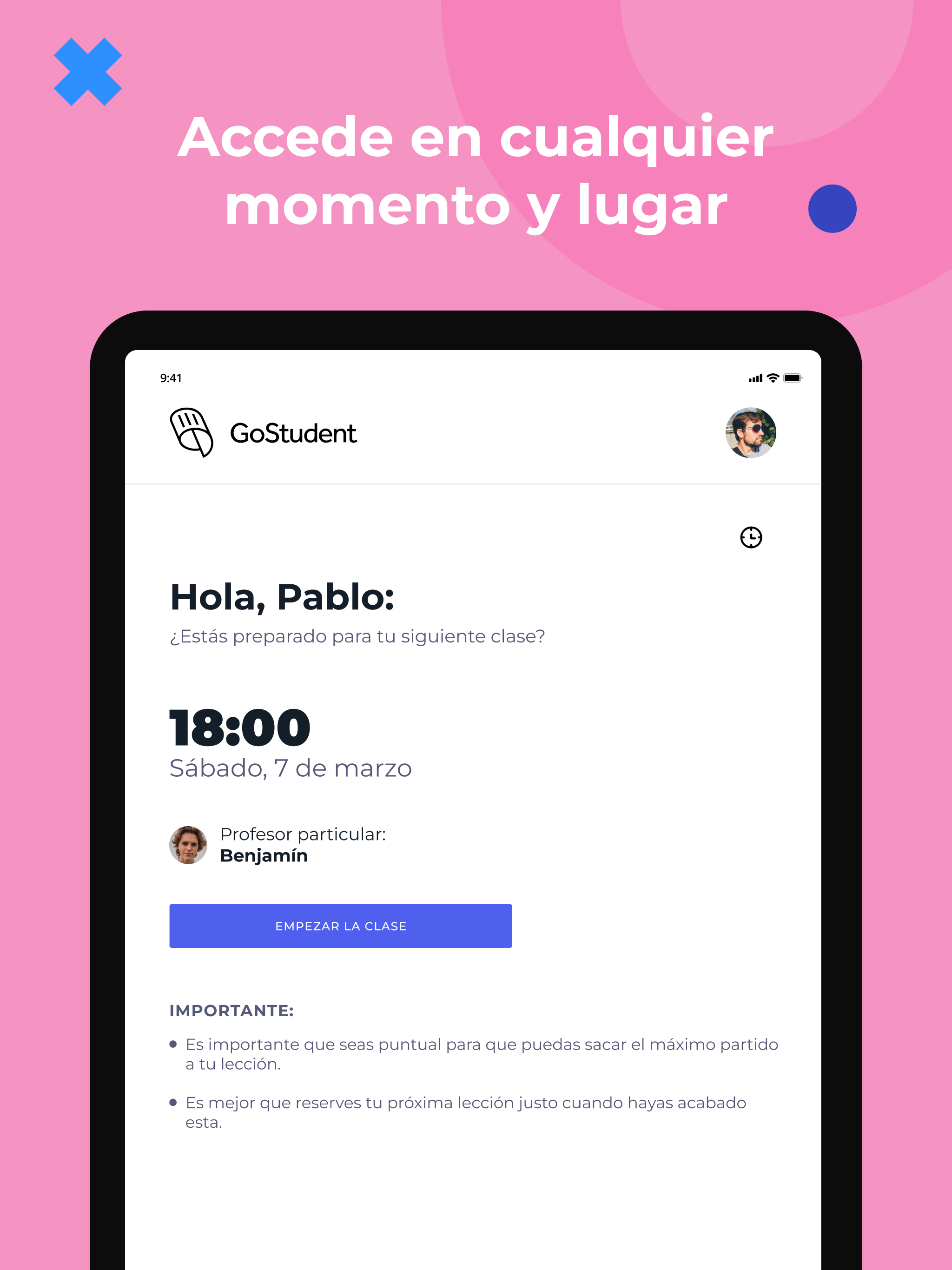 ¿Quieres mejorar tus notas? Las clases particulares de GoStudent son la solución. El objetivo principal de GoStudent es ayudar a los niños y adolescentes de 6 a más de 18 años a alcanzar su máximo potencial académico, haciendo que la mejor educación sea accesible para todos. No importa cuál sea el motivo por el que necesites clases particulares ni tampoco la asignatura o el nivel académico, GoStudent está ahí para ayudarte. Nuestros profesores particulares online ofrecen clases particulares individuales y adaptadas a cada estudiante y están preparados para elaborar planes de estudio personalizados para cada alumno. Con GoStudent puedes tomar clases de matemáticas, inglés, física, español, italiano, química y muchas más asignaturas. ¡Ofrecemos más de 30 materias diferentes en nuestra plataforma! Además, las clases particulares online de GoStudent se adaptan a todos los niveles escolares, desde primaria hasta la universidad, pasando por secundaria y bachillerato e incluso para quien ya se encuentra trabajando y desea tomar cursos de idiomas o de cualquier otra cosa. Pero eso no es todo. Y es que con las clases de apoyo online de GoStudent, estudiar y hacer los deberes ya no será un problema, ni siquiera durante los fines de semana, ya que nuestros profesores están disponibles los 7 días de la semana. Beneficios de las clases particulares online de GoStudent - Clases de alto impacto con precios asequibles - Flexibilidad para estudiar en cualquier momento y en cualquier lugar - Misma suscripción para toda la familia - Plan de aprendizaje personalizado para cada estudiante, adaptado a sus necesidades y óptimo para enseñar online - Tutorías de todas las asignaturas y todos los niveles educativos incluidas en el precio - Profesores particulares online cualificados y especialistas en enseñar a niños y adolescentes - Métodos de enseñanza innovadores - Uso de los últimos avances tecnológicos: aula virtual, pizarra digital, grabación de clases, etc. - Seguimiento de los avances del alumno ¿Para qué sirve la app de GoStudent? Nuestra app para dar clases particulares tiene como objetivo facilitar el acceso y el uso del contenido a todos los usuarios. Es decir, ayuda a que cualquier alumno, profesor o padre logre acceder fácilmente a las diferentes lecciones y clases que tenga desde cualquier dispositivo móvil o tablet. Ventajas de usar la app de GoStudent en tu móvil o tablet - Fácil acceso al contenido - Funcionalidad sencilla e intuitiva - Flexibilidad a la hora de dar las clases particulares online - Cómoda y user-friendly ¿Cómo ser profesor particular online con GoStudent? Si quieres impartir clases particulares online, has llegado al lugar adecuado. GoStudent se encarga de todo lo que necesitas para poder enseñar online. La plataforma es la responsable de encontrar y elegir a los estudiantes que se adapten a tus horarios y requerimientos y así tú solo tendrás que preocuparte de gestionar tus clases a través de la web o la app. Ventajas de dar clases particulares online con GoStudent - Flexibilidad a la hora de dar las clases: Tú eliges cuándo y dónde - Plataforma sencilla y fácil de manejar: Solo necesitas acceso a internet - Soporte y atención personalizados: ¡Te ayudamos con lo que necesites! - No necesidad de buscar alumnos: Nosotros nos encargamos de elegirlos - Ingresos seguros: Según el número de clases que hayas dado al mes ¿Necesitas preparar una materia o un exámen? ¿Quieres mejorar tus notas? ¿Quieres aprender a programar? ¿Quieres aprender un nuevo idioma? ¿O por el contrario quieres ser el que enseñe a los alumnos estas materias? Descarga la aplicación de forma gratuita y podrás programar, cancelar e incluso reprogramar la hora y la fecha de tus clases de refuerzo escolar. ¡Es muy sencillo y estamos seguros de que lograrás tus objetivos!