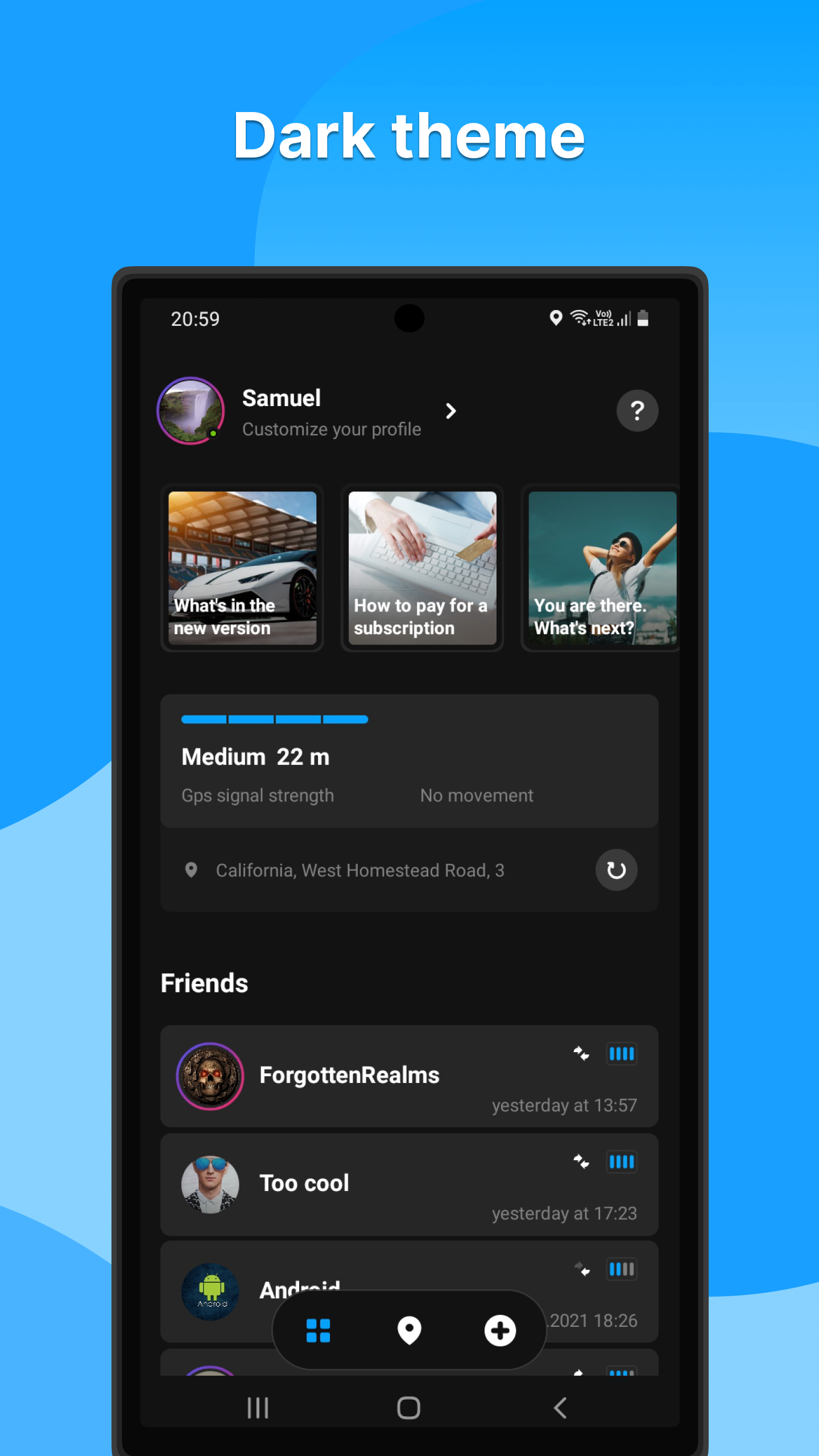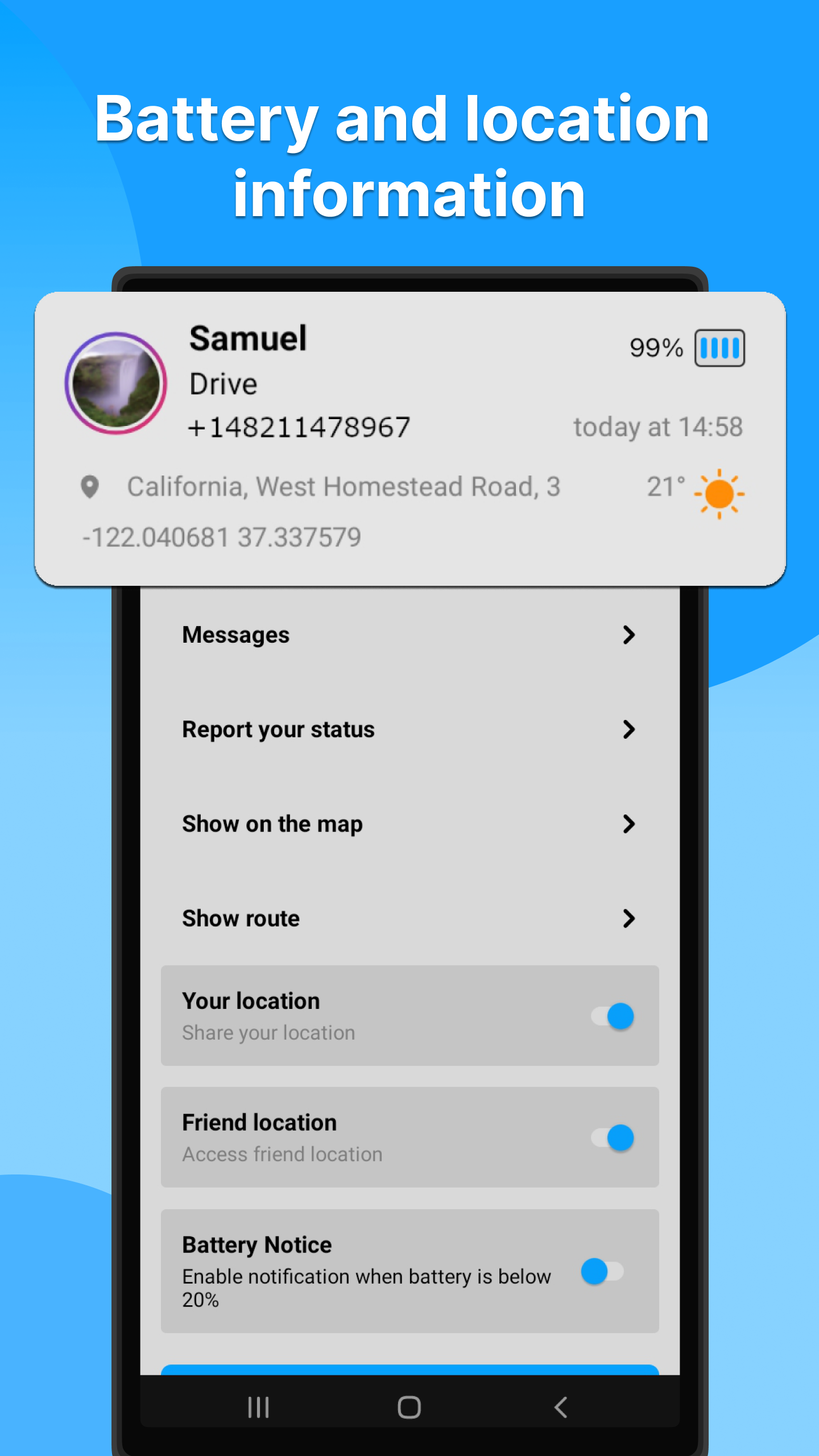 Inicio de sesión simple mediante número de teléfono. Sus seres queridos pueden simplemente suscribirse a su ubicación y rastrear su ubicación en modo de tiempo real, solo con su consentimiento. A su vez, también podrás encontrarlos: ¡mapa conveniente y uso gratuito!
