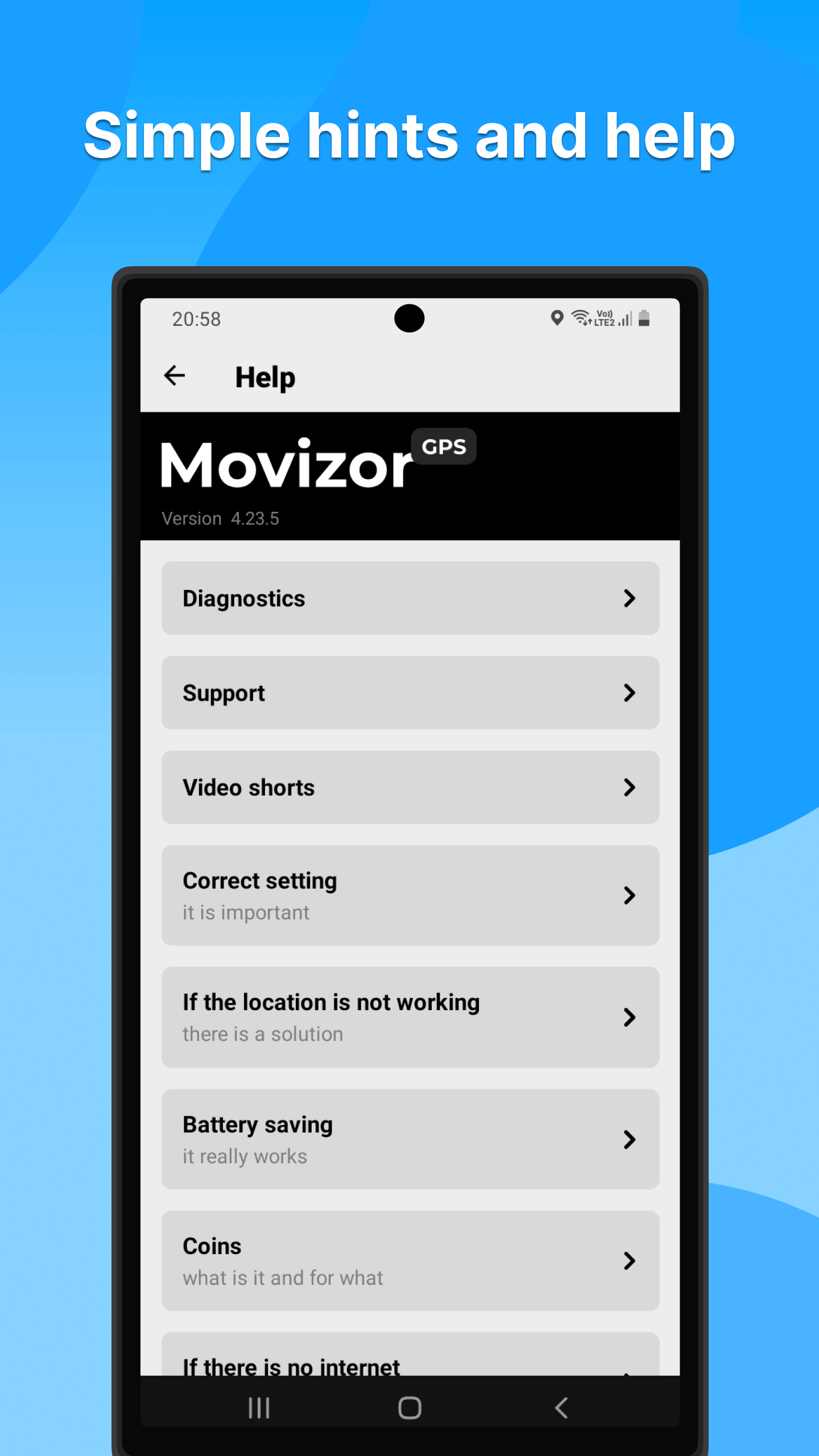 • Movizor puede funcionar sin conexión a Internet: recuerda las coordenadas y las envía al servicio después de que aparece la conexión a Internet. La aplicación se puede apagar y reiniciar; el historial de movimiento no se perderá.
