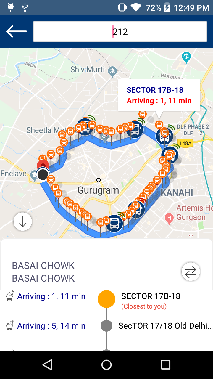 Detalles de la ruta : muestra las paradas de autobús en la ruta y al hacer clic en la parada de autobús, muestra la ETA y la ocupación tentativa del autobús en esa parada.