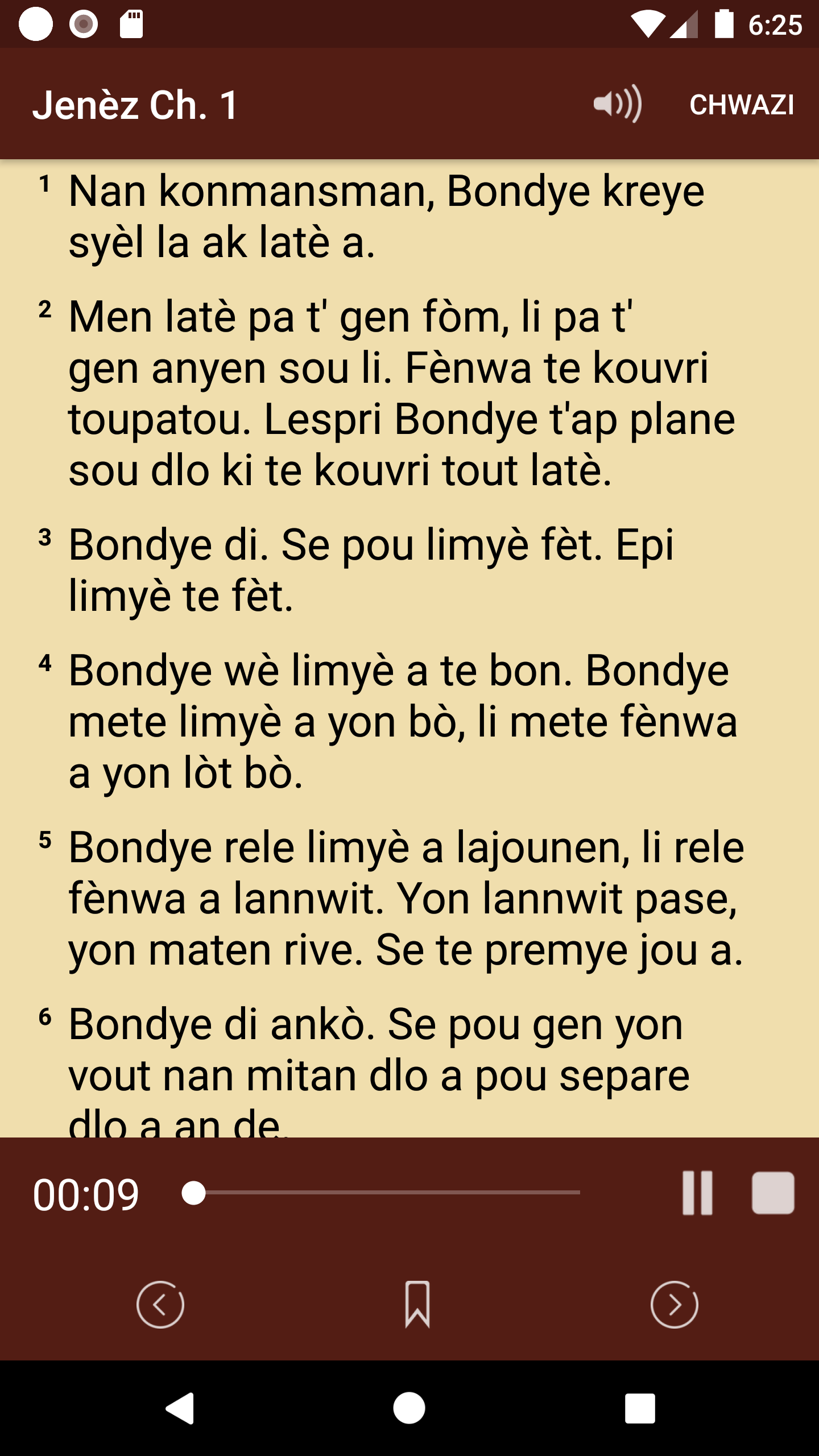 Lleve una aplicación de la Biblia traducida al criollo haitiano. Ahora puedes leer y escuchar la Palabra de Dios en criollo haitiano (Kreyòl Ayisyen). Li Bib La an Kreyòl Ayisyen, vèsè pa vèsè. Biblia en audio criollo haitiano - Biblia haitiana. Caracteristicas - Versículo del día (notificaciones diarias que resaltan el versículo bíblico elegido para ese día). - Reproducción de audio para que pueda escuchar y seguir. - Transmita audio a todos sus dispositivos