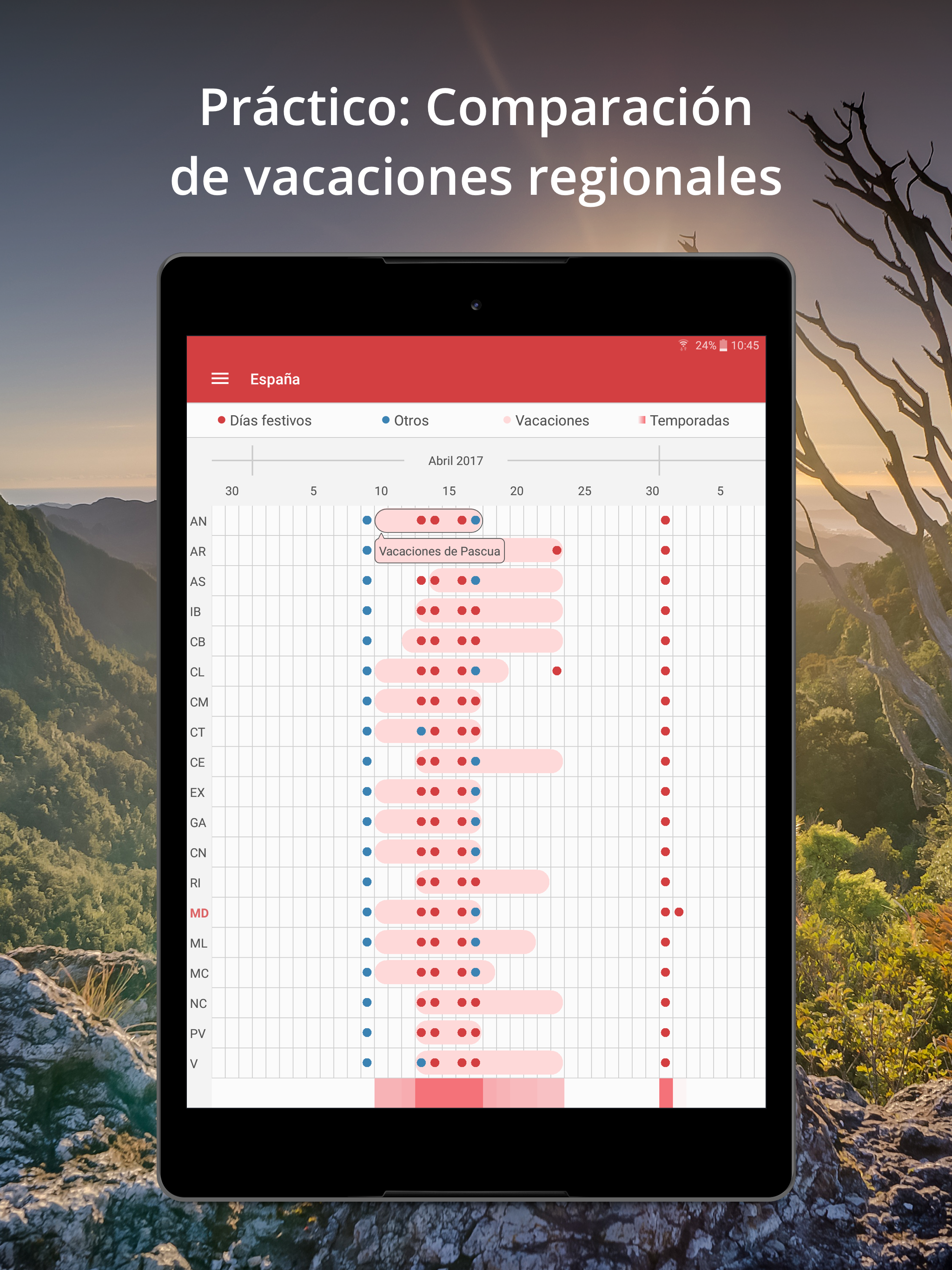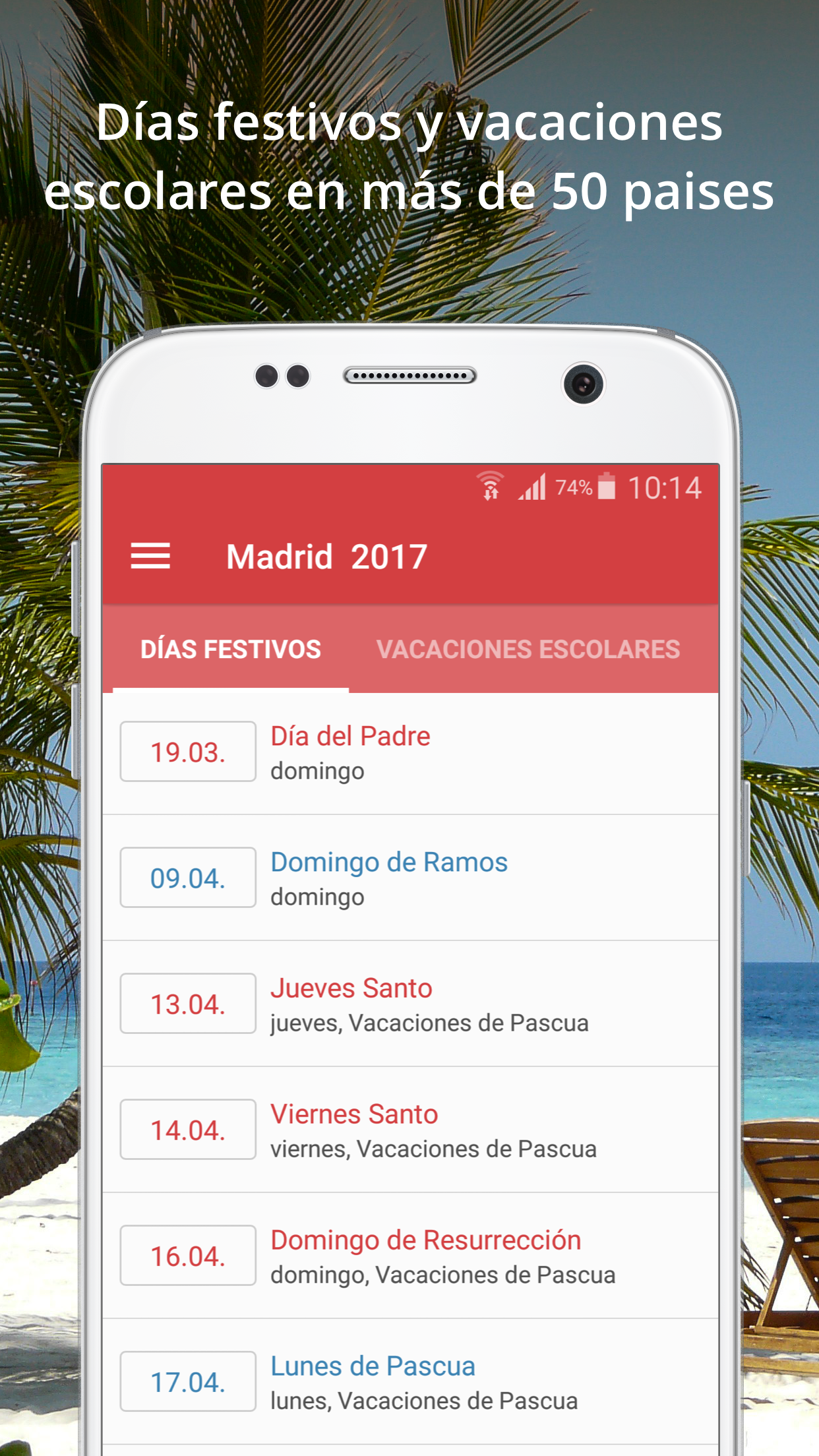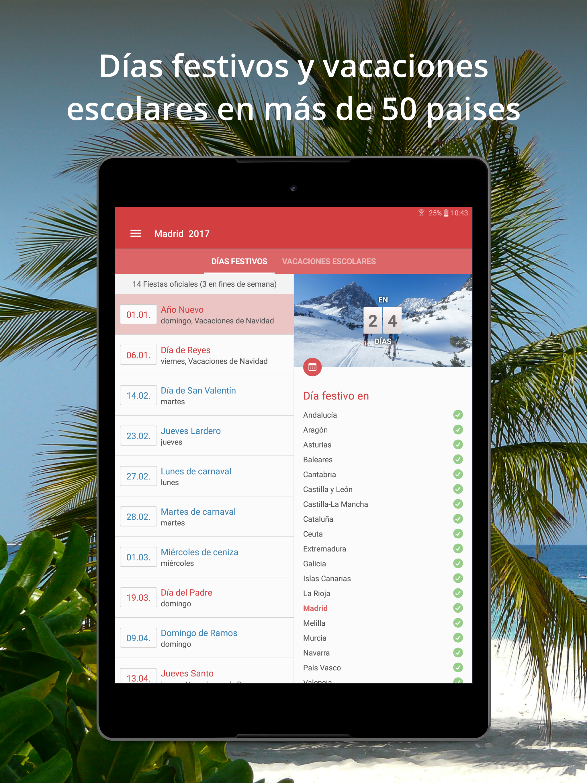Ya sea que quieres ver las vacaciones escolares de tus hijos o estimar cambiso en el tráfico por festividades úblicas, con nuestra App de Días Festivos y Vacaciones pueses acceder fácilmentre a esta valiosa información para distintos paises, incluyendo populares destinos de viaje del mundo entero.