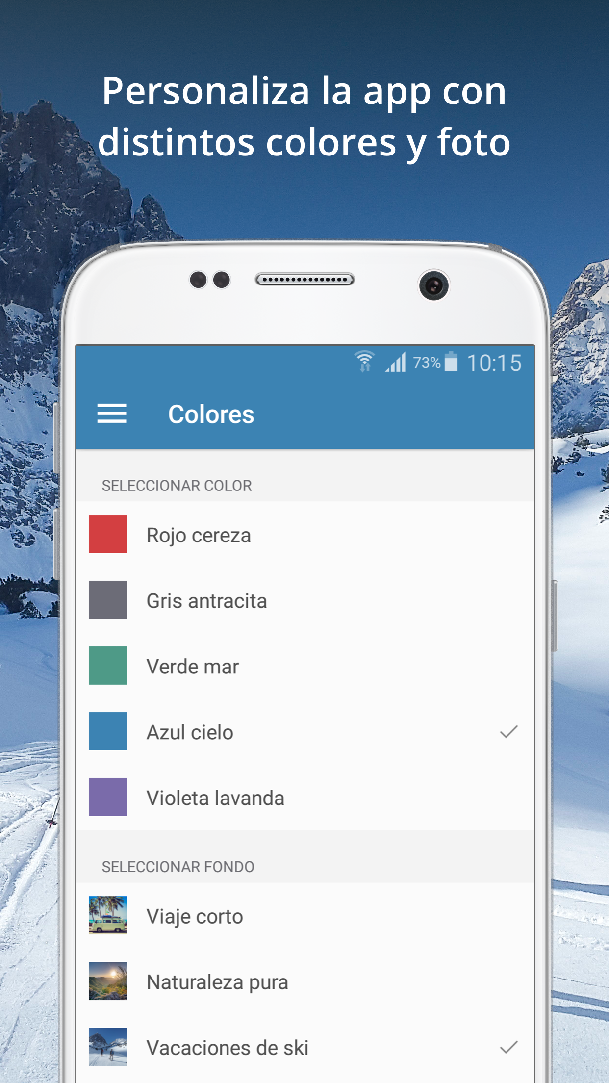 Personaliza la app seleccionando tu color favorito y fotografía de fondo favorita.