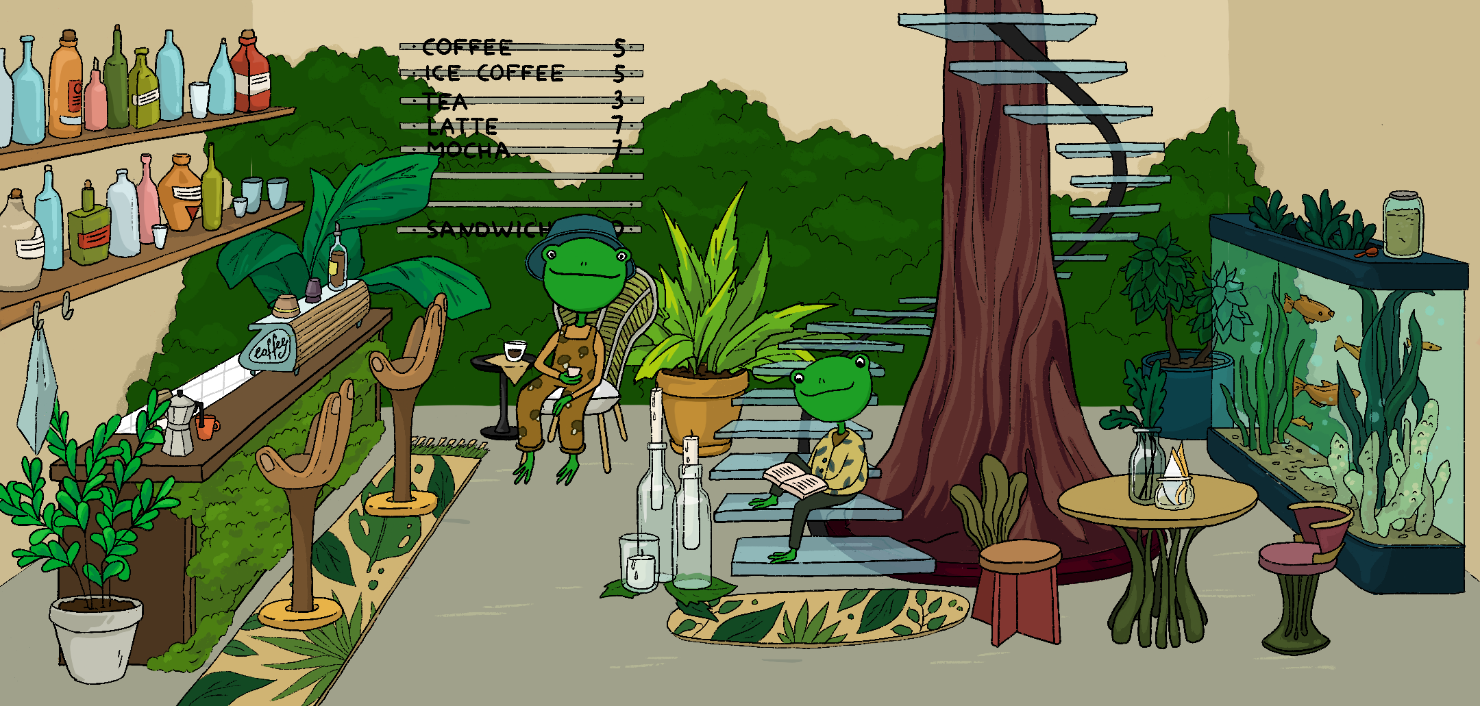 A todas las ranas de tu invernadero les encantan los cafés y cócteles cálidos y aromáticos. Trata a las ranas con tus maravillosas bebidas! 🐸 ¡Se dan nuevas recetas para completar las tareas diarias!