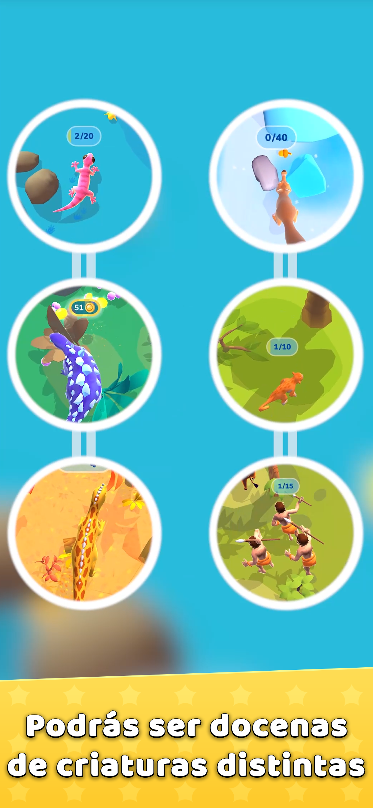 ¡LLEGA LA REVOLUCIÓN DE LA EVOLUCIÓN! 🐟 🦖🐒 Sumérgete en la sopa primordial y ponte a comer en este bonito y entretenido simulador de supervivencia en el que tu objetivo es escalar la cadena alimenticia organismo a organismo. Comienza el juego como un pequeño pez en un océano descomunal y ábrete paso a través de la historia en el largo y rocoso camino 🐾 hacia la civilización. Hay muchos más peces en el mar... y algunos son mucho más grandes que tú, así que mientras te alimentas de tu presa, ten cuidado con no convertirte en la cena de otro animal o dinosaurio 🦕. Solo sobrevivirán los más aptos, así que usa tu intuición animal, activa tu cerebro de reptil o dinosaurio, ponte en contacto con el cavernícola que llevas dentro 🗿 y no bajes la guardia en este juego de aventura darwiniana y despiadada que te dará horas y horas de diversión evolutiva. 🍖 ALGO QUE MASTICAR… 🦴 ★ La evolución está aquí: progresa a través de épocas geológicas enteras en el vasto océano Paleozoico, pasa de ser un pezqueñín primitivo a un tiburón depredador, conviértete en tortuga, sal del caparazón de una vez por todas y emerge en tierra firme cuando seas un lagarto hermoso. ★ Domina la supervivencia en un nuevo entorno y no tardarás en recorrer el camino de los dinosaurios... Todo eso antes de cambiar de clase para perder la cabeza con las nueces cual ardilla, enfrentarte a la tarea descomunal de ser un mamut y pasar la prueba para ver si eres un simio bueno, del montón o impresionante. ★ ¿Empiezas a sentir la humanidad? Todavía no has terminado de evolucionar, así que céntrate en tus actitudes neandertales, saca tu agresividad cavernícola para cazar y, por último, termina el juego dedicándote a la agricultura para convertirte en la estrella de los animales y el as de la cadena alimentaria. ★ Once etapas de evolución con un total de 81 niveles en el juego, cada uno con novedades en las mecánicas básicas. ★ Completa los niveles con puntuaciones altas para desbloquear errores misteriosos de la evolución humana y animal, como sirenas, 🦄 unicornios y dragones para pasarlo todavía mejor. ★ Gráficos sencillos pero con estilo, con diseños de criaturas y animales preciosos y paisajes muy variados que dan vida a las diferentes épocas de la historia del planeta en tu propia tu pantalla. ⏳ DESENTRAÑA EL MISTERIO DE LA PREHISTORIA ⌛ ¿Quieres ver el origen de las especies en acción? ¿No sabes si has evolucionado por completo? Este simulador tan divertido te permitirá ocupar el lugar que te corresponde en la cima de la escala evolutiva y, además, lo pasarás en grande mientras lo haces. Descárgate Hyper Evolution, el juego de supervivencia que da vida a las clases de biología con una experiencia de simulador colorida y satisfactoria y ¡vete a por la evolución humana ya! Privacy Policy: https://say.games/privacy-policy Terms of Use: https://say.games/terms-of-use