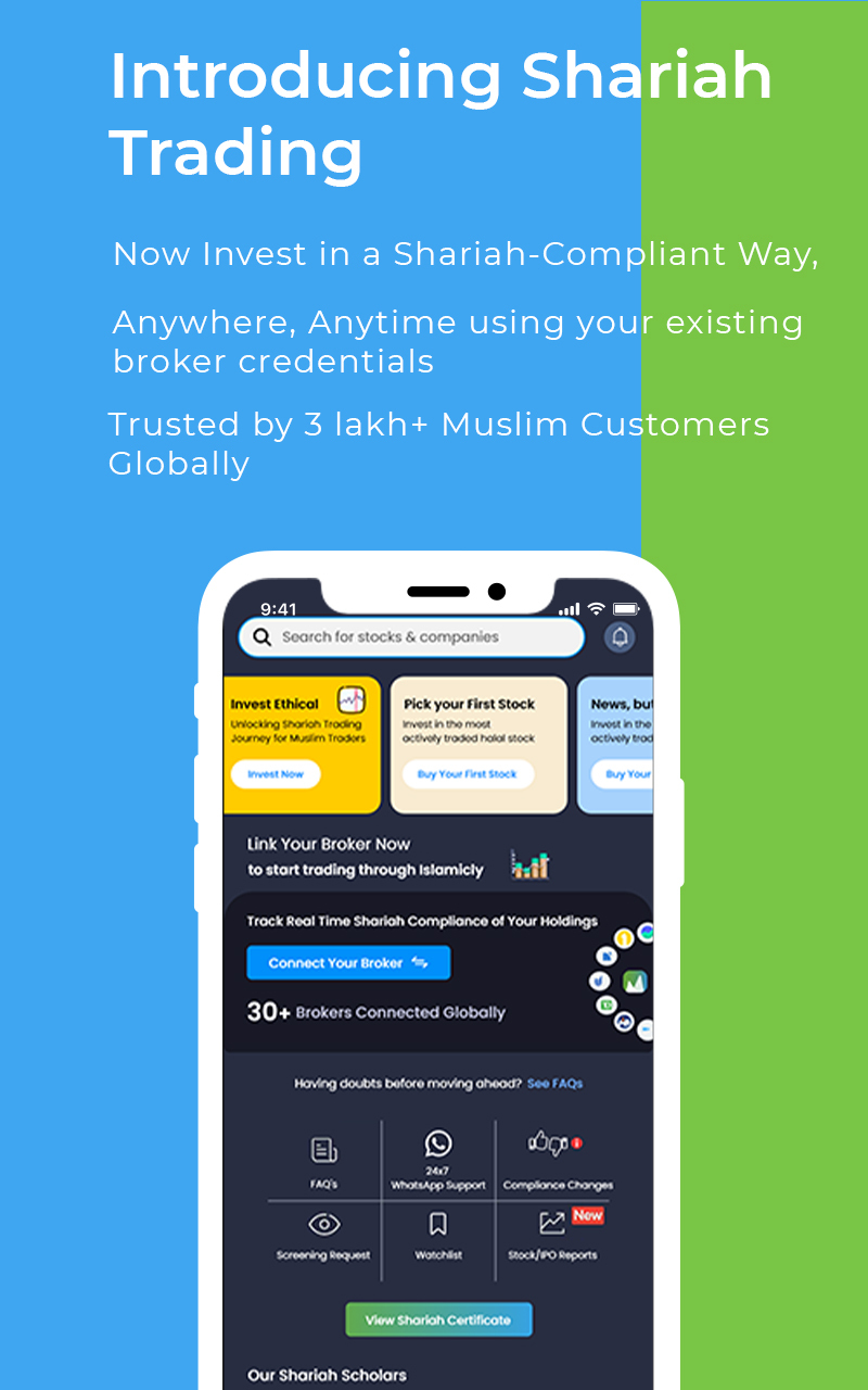 Islamicly is certified for Shariah-compliant trading by Globally Renowned and pioneering Shariah scholars such as Dr Muhammed Elgari of Saudi Arabia, who is also a member of the AAOIFI Shariah Board. Collaboration with over 32+ leading stock brokers globally ensures access to a wide range of global Muslims. Trade right through the App: Islamicly App is now integrated to support trading functions so that all your trades are compliant at the time of execution.