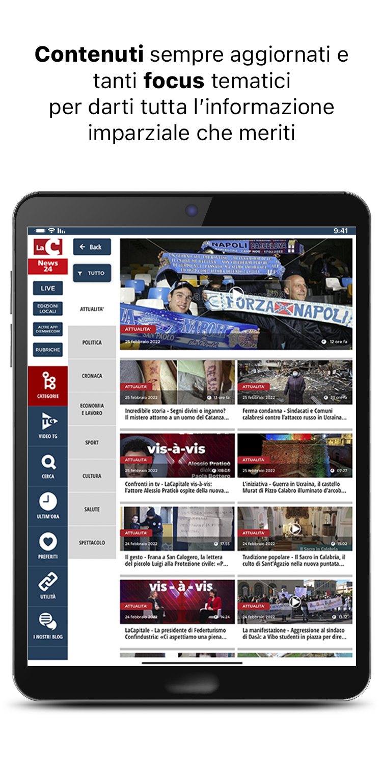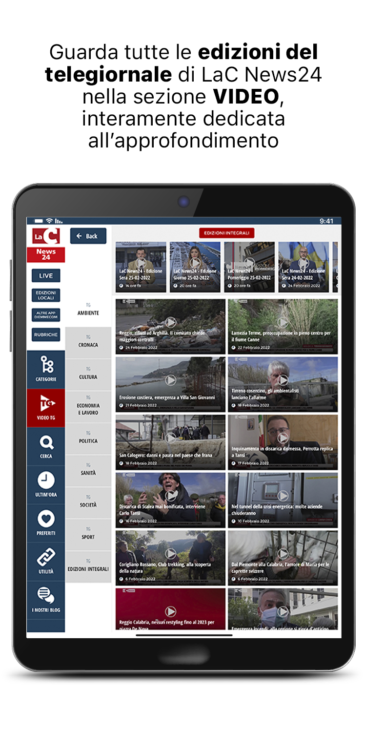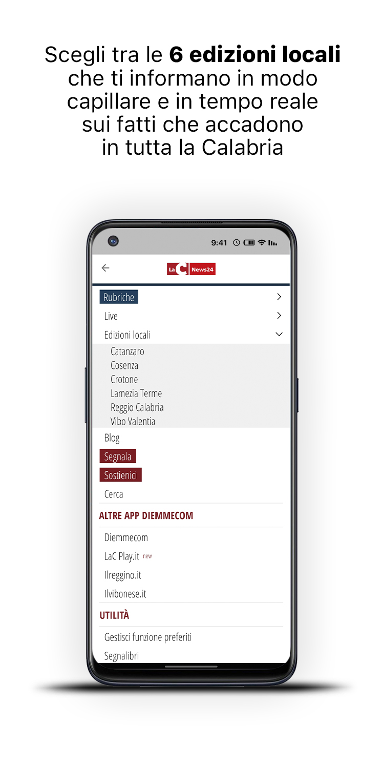 Descargue la nueva aplicación gratuita LaC News24 para mantenerse al día sobre las noticias de Calabria, con una mirada a Italia y el resto del mundo. El diseño gráfico simple e intuitivo hace que su experiencia de navegación sea inmediata y agradable. Encontrarás contenido constantemente actualizado y muchos enfoques temáticos para brindarte toda la información imparcial que te mereces. La página de inicio se actualiza constantemente con el reproductor de transmisión en vivo, noticias, videos, fotos, blogs y mucho más. El nuevo menú lateral, completo y fácil de usar, le permite acceder directamente a todas las noticias actuales, noticias, política, negocios y trabajo, deportes, cultura, salud y entretenimiento para una experiencia de navegación memorable. Elija entre las 6 ediciones locales que le informan de forma capilar y en tiempo real sobre los hechos que están sucediendo en toda Calabria. En la nueva sección ÚLTIMO AHORA encontrarás todas las novedades realizadas en los minutos anteriores. Vea todas las ediciones del programa de noticias de LaC News24 en la sección Video, totalmente dedicada a la información en profundidad. Lea las opiniones y los conocimientos de nuestros expertos en la sección Blog y columnas. Siga la transmisión en vivo de los canales de LaC Tv, LaC News24 y Web Radio directamente a su teléfono inteligente, donde y cuando quiera. Las nuevas funciones Administrar favoritos y marcadores lo ayudan a informarse y agregar a su archivo personalizado solo lo que le interesa. Toque Informar y conviértase en el protagonista de LaCNews24 al informar una historia, un flaco favor, un evento o un problema que cree que es importante contar. Las noticias de LaC News24 están todas verificadas, los hechos son sondeados por el personal editorial que le actualiza escrupulosamente sobre lo que está sucediendo en el panorama calabrés: desde las noticias a la política, desde la economía a la cultura, desde el deporte a la salud a través de consultas, columnas, opiniones. , sátira, especiales y reportajes de noticias.