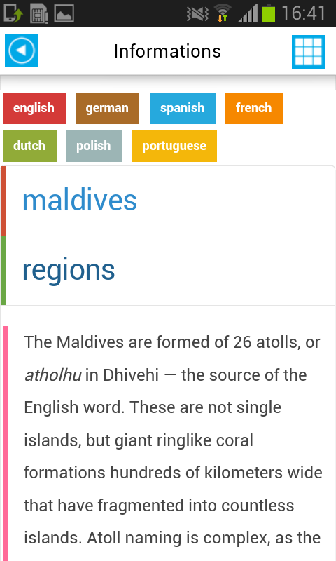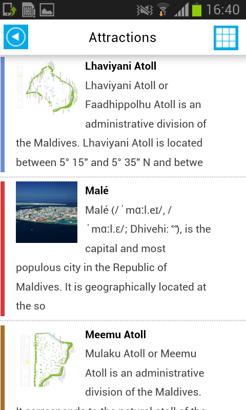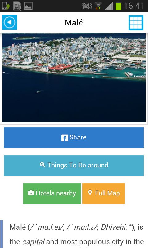 100% Offline Maldives Map & Guide. Descubrir nuevos lugares y ver mapa completo offline funciones en su dispositivo. Nuestro Offline Map es de alta resolución, y se puede utilizar este mapa sin la itinerancia de datos, conexión WIFI y costes ocultos! 10 idiomas soportados: Inglés, alemán, francés, ruso, coreano, portugués, español, japonés, italiano, chino CARACTERÍSTICAS: - Mapa offline completo con geolocalización GPS (100% sin conexión) - Lista de atracciones con la descripción de las fotos (sin conexión) - Información sobre la ciudad multilingüe sobre transporte, comida, historia, aeropuertos y muchos otros datos como la mesa o comer clima y eventos (sin conexión) - Convertidor de divisas: euro, libra esterlina, el dólar EE.UU., chino Youan, Yen Japonés, Won coreano Rupia Rublo ruso (fuera de línea) - Interfaz multilingüe - Hoteles ofertas (módulo de línea) - Actividades y excursiones Descubre ciudades y lugares con nuestra aplicación en línea. Nuestro Offline Map & Guide le proporciona una manera fácil de encontrar nada. Busque un mapa offline con todas las funciones de su dispositivo para encontrar el camino. HECHOS: - Más de 450.000 excursionistas utilizan nuestras aplicaciones (iPhone, And & BB). - Medios de comunicación social plugin de intercambio - No hay costes de itinerancia - Interfaz multilingüe y descripciones - Disponible en 7 idiomas - Agrega libre Listo tableta de la pantalla y la retina - HERRAMIENTAS INTELIGENTES: - Interfaz y descripciones Mutilingual la mejor manera de explorar las atracciones de la ciudad. - Simple Currency Converter. Encuentra las tasas de cambio de divisas y convertir monedas del mundo con nuestra herramienta. - Las listas de los lugares de interés turístico. Lista completa con la mayoría de las atracciones turísticas más populares, monumentos y lugares de interés. - Compartir rápida. Comparte tus viajes, recomendar lugares de interés turístico con el plugin de medios sociales. - Hoteles de la reserva. Buscar, guardar, administrar y reservar mejores hoteles y hostales. Encuentra las tarifas de hotel más baratas en todo el mundo. - Descripciones detalladas. Ahora tienes todo lo que necesitas en tu teléfono. Descripciones detalladas, mapas, hoteles cercanos y cosas que hacer alrededor lugar seleccionado. - Tareas. Visita de la ciudad, lugares de interés, excursiones, cosas que hacer y actividades divertidas Las Maldivas (Dhivehi Raajje) son un archipiélago de 1.192 islas coralinas agrupadas en 26 atolones coralinos (200 islas habitadas, además de 80 islas con centros turísticos) en el Océano Índico. Se encuentran al sur-suroeste de la India y se consideran parte de Asia meridional. Las Maldivas tienen una política muy fácil visa - Todo el mundo tiene un visado de 30 días a la llegada, siempre que cuenten con un documento de viaje válido, un billete de salida y la prueba de solvencia económica, definida como una reserva confirmada en cualquier estación o EE.UU. $ 100 + $ 50 diarios [2] en efectivo. Esto se puede extender hasta 90 días en el Hombre, pero usted tendrá que indicar dónde te vas a quedar por mucho tiempo. Consulte al Departamento de Inmigración y Emigración página web [3] para más detalles. Importación de alcohol, carne de cerdo o la pornografía (muy en sentido amplio) en las Maldivas está prohibido y todo el equipaje es una radiografía a la llegada. A la salida, tenga en cuenta que la arena de exportación, conchas o coral también está prohibido.