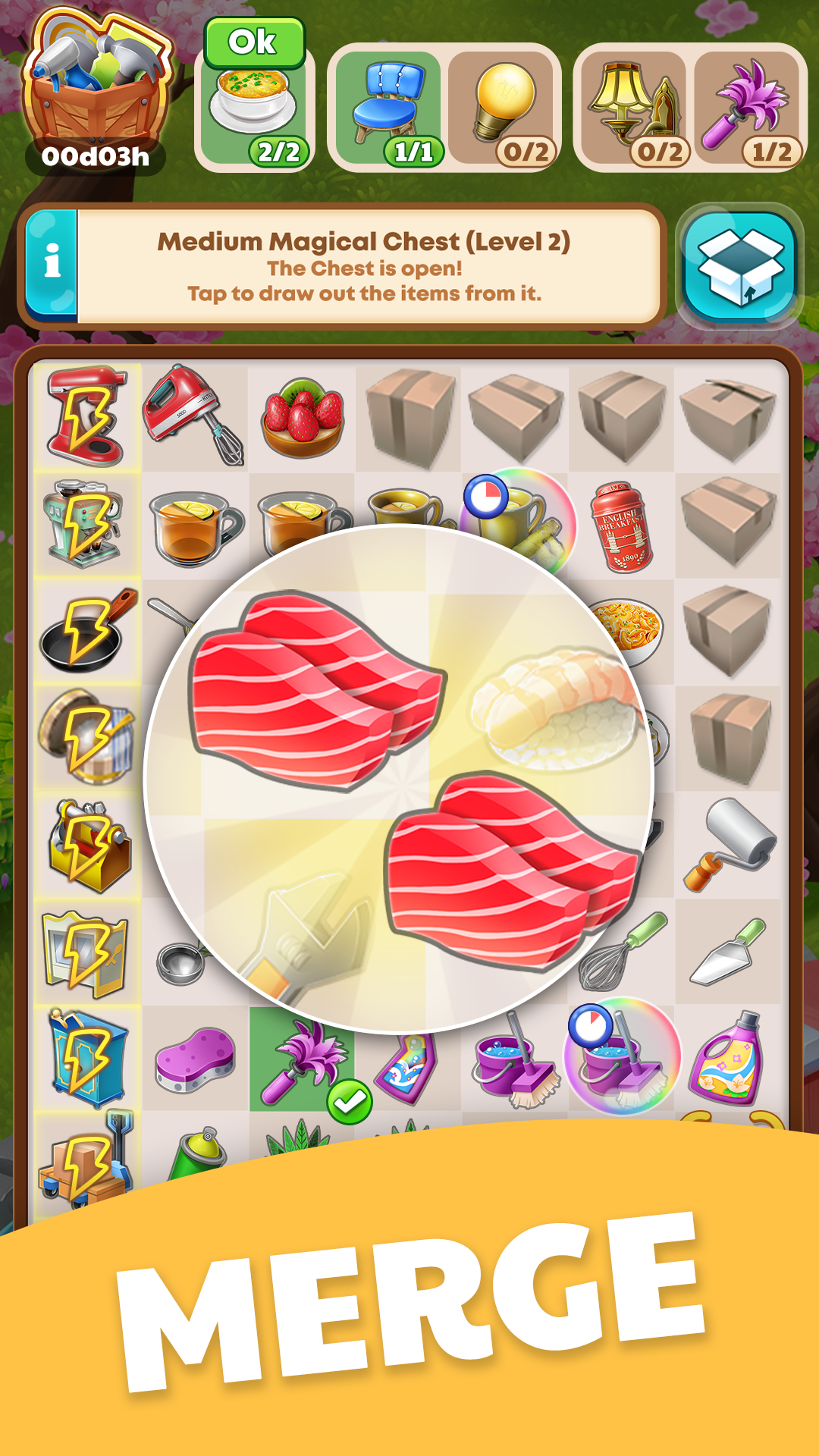 ● Fusión Emocionante: Combina objetos interesantes de herramientas, equipo de cocina, decoraciones y comida. ¡Fusiona para obtener lo que necesites!