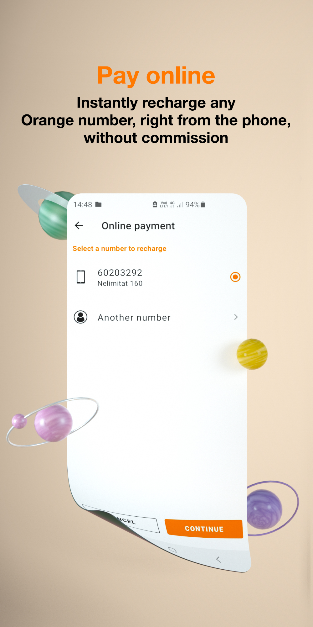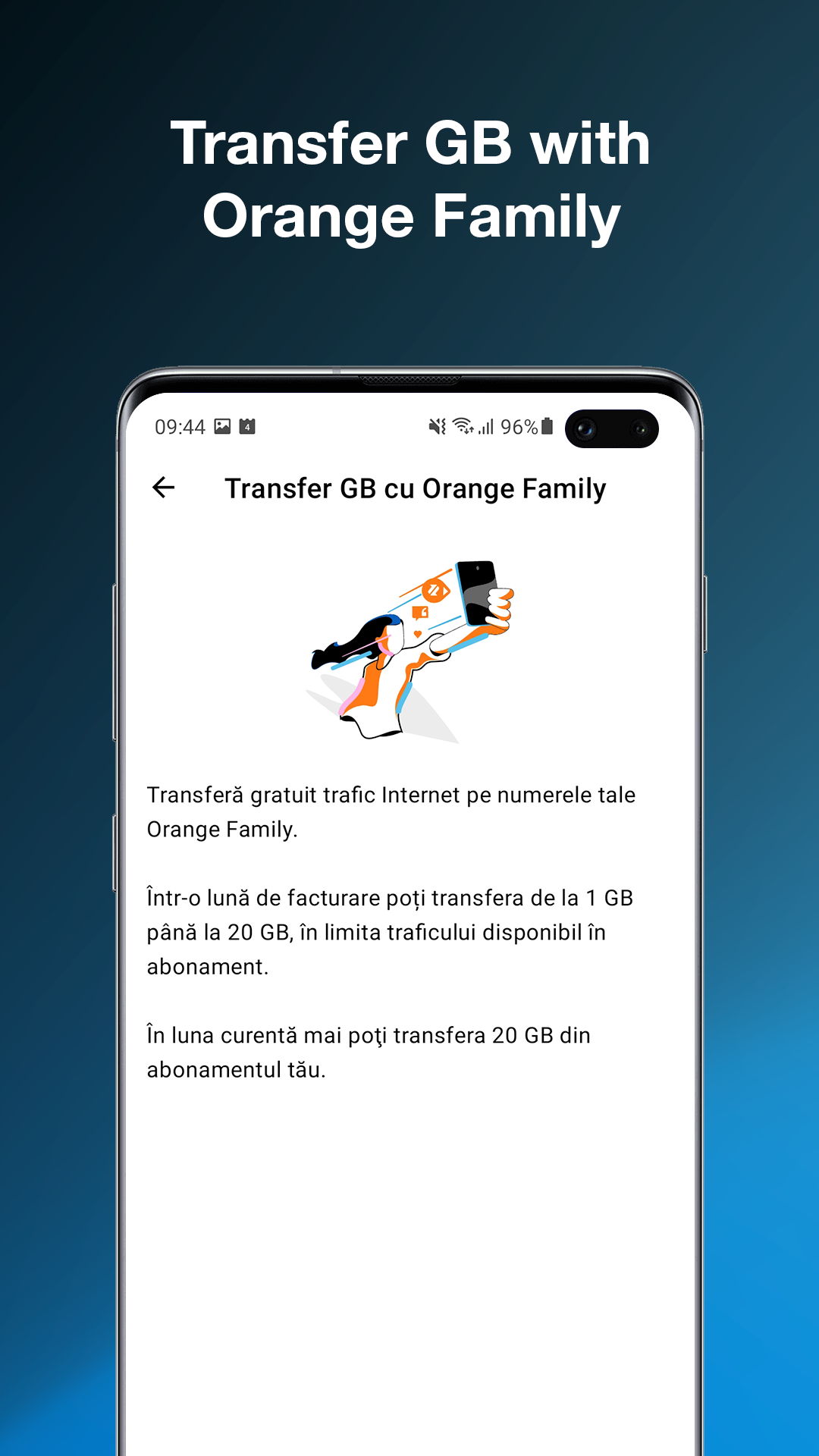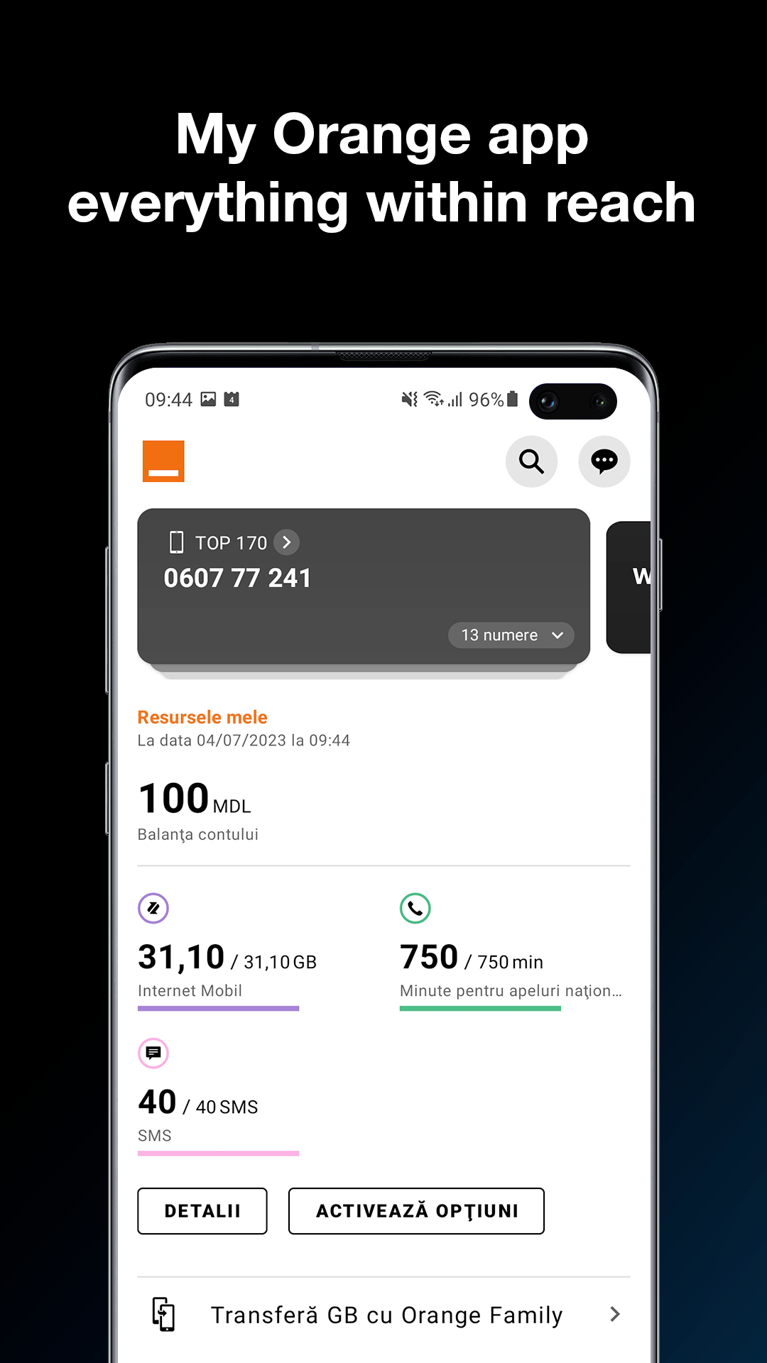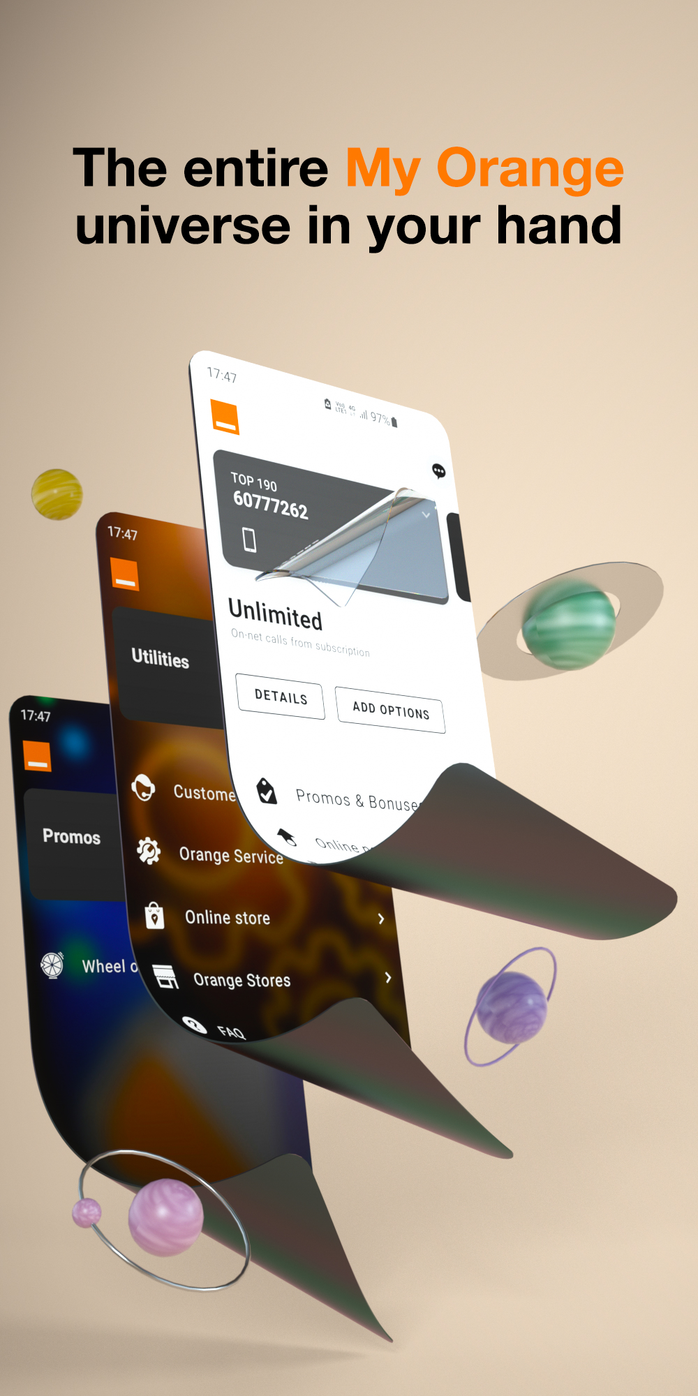 Con My Orange puede verificar el saldo de su cuenta, agregar opciones y servicios, administrar Números favoritos, recargar en línea cualquier cuenta Orange con una tarjeta bancaria y cambiar su plan de tarifas sobre la marcha, dondequiera que esté, con solo un clic. Hay más por venir. Tenemos un montón de funciones adicionales planeadas para My Orange durante los próximos meses, así que esté atento a las actualizaciones. Lo que necesitas saber: · La aplicación está disponible para todos los clientes de Orange Abonament, PrePay e Internet Acum PrePay; · Necesita una conexión a Internet 3G / 4G para autenticarse con éxito en My Orange; · Una vez autenticado, puede utilizar cualquier conexión de datos, incluido Wi-Fi; · La sesión de autenticación es válida por 14 días y se reiniciará automáticamente por otros 14 días cada vez que abra la aplicación usando una conexión Orange 3G / 4G; · Además, puede autenticarse a través de WiFi con una cuenta de Orange; · El tráfico utilizado para descargar la aplicación se cobrará a su tarifa estándar; · El tráfico utilizado dentro de la aplicación es gratuito, excepto las secciones "Orange Stores" y "Orange Chat"; · Cuando utilice My Orange en roaming, el tráfico de datos se cobrará de acuerdo con sus tarifas y opciones de roaming. Más detalles en https://www.orange.md/?l=1&p=1&c=11&sc=1111