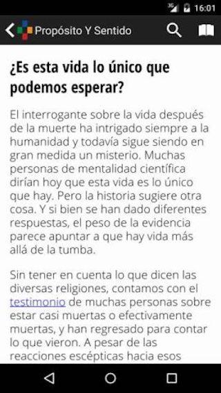 Esta es tu aventura de descubrimiento, de modo que te invitamos a excavar. Explora de qué se tratan Dios, la fe, y el cristianismo. Lee la Biblia cuando lo desees, dondequiera que estés. Y no importa lo que hagas, no dejes de buscar las respuestas a los interrogantes más profundos que todos tenemos. Mediante este app de uso sencillo, puedes comenzar en CUADRO UNO y explorar temas tales como “la existencia de Dios”, “el propósito de la vida”, “qué es la verdad”, “la moral”, “la Biblia”, y “el cristianismo”. O puedes saltear todo eso y pasar directamente a la sección DIME MÁS, donde explorarás temas como Jesucristo, la fe, el pecado, la oración, la iglesias, entre otros. A lo largo del app encontrarás lecturas sugeridas para cuando quieras profundizar en algún tema en particular. Si haces clic sobre el título del libro te llevará a una breve sinopsis de la obra y a una sugerencia para la compra del mismo. Desde allí puedes volver atrás y continuar la exploración. Este app también presenta una sección de índice temático titulada RESPUESTAS BÍBLICAS, con asuntos que comúnmente la gente quiere encontrar en la Biblia. Por ejemplo, puedes encontrar versículos bíblicos para cuando tienes miedo, cuando piensas en casarte, cuando necesitas paz, o cuando te sientes maltratado. También encontrarás pasajes importantes como el relato de la Navidad o de la Pascua, algunos de los milagros de Jesús, o una selección de los salmos más populares. ¿Te preguntas cuáles son las virtudes cristianas cardinales? Explora la lista y lee los versículos bíblicos que se aplican, sea en forma aislada o en su contexto. Cuando estés DISPUESTO A CAMBIAR, el app te acompañará a través de los pasos que darás para comenzar una nueva vida basada en las enseñanzas de Cristo. LA BIBLIA COMPLETA El app NewLife incluye la Biblia completa en la versión Nueva Traducción Viviente, en la que podrás buscar y explorar —¡incluso sin estar en línea! La NTV es una traducción sumamente confiable de los manuscritos antiguos, en un lenguaje popular claro, actual, y de fácil lectura. OTROS CONTENIDOS * Respuestas a los grandes interrogantes de la vida * Los Diez Mandamientos * Personajes destacados en el Antiguo Testamento * Términos bíblicos y sus definiciones * Cómo comenzar una nueva vida CARACTYERÍSTICAS DEL APP: * Fácil uso interfaz * Toda la Biblia incorporada en el app * Modalidad de luz baja para leer en ambientes menos iluminados