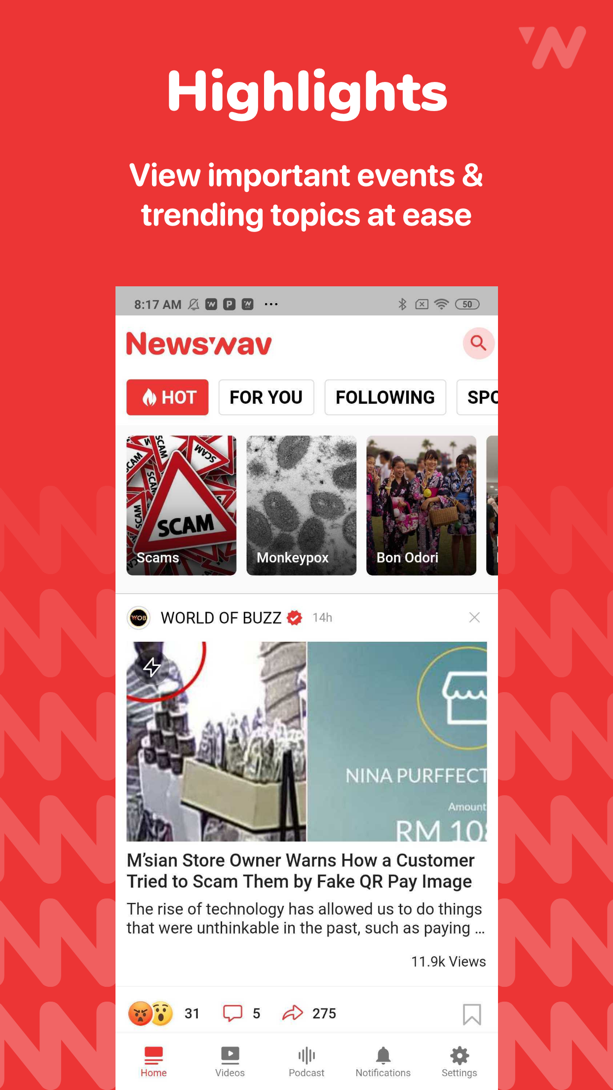 El mejor agregador de contenido en Malasia. ¡Sigue la corriente y descarga gratis! ¿Por qué Newswav? • 💪🏼 Contiene noticias y contenido de más de 400 editores, sitios web y creadores de contenido independientes importantes en Malasia y en todo el mundo. Lea The Straits Times, The Sun Daily, The Edge, Malay Mail, BFM 89.9, SCMP, The Vibes, The Borneo Post, La Liga, The Rakyat Post, World of Buzz y más, todo en un solo lugar • 🌐 3 idiomas para elegir: inglés, chino, malayo • 🤩 Varios artículos, podcasts y videos que se actualizan en tiempo real: noticias locales, noticias mundiales, política, negocios y finanzas, comida, entretenimiento, tecnología, deportes, estilo de vida, salud y bienestar, hogar y vida y más • 🔥 Póngase al día fácilmente sobre el desarrollo de las historias de moda en la sección Destacados de nuestra fuente HOT • ⚙️ 3 configuraciones de notificaciones push para elegir, manteniéndolo informado y sin perderse ningún titular local o internacional • 👀 Eche un vistazo a las últimas noticias agregando nuestro widget a la pantalla de inicio de su teléfono • 😍 Interfaz fácil de usar y fácil de usar • 🌙 El modo nocturno está disponible para una mejor visibilidad en entornos con poca luz • 🍱 Pase menos tiempo desplazándose y obtenga más información de un solo vistazo con el modo compacto Un lector de noticias imprescindible para todos los malayos. No esperes jaja. ¡Descarga y disfruta todo el contenido gratis hoy! — Newswav es un agregador de contenido en línea y obtiene su contenido de diferentes fuentes en línea. El contenido de la aplicación no pertenece a Newswav ni refleja las opiniones de Newswav y su personal. Su uso de esta aplicación indica su comprensión y aceptación de esta información. • Condiciones de uso: https://newswav.com/terms