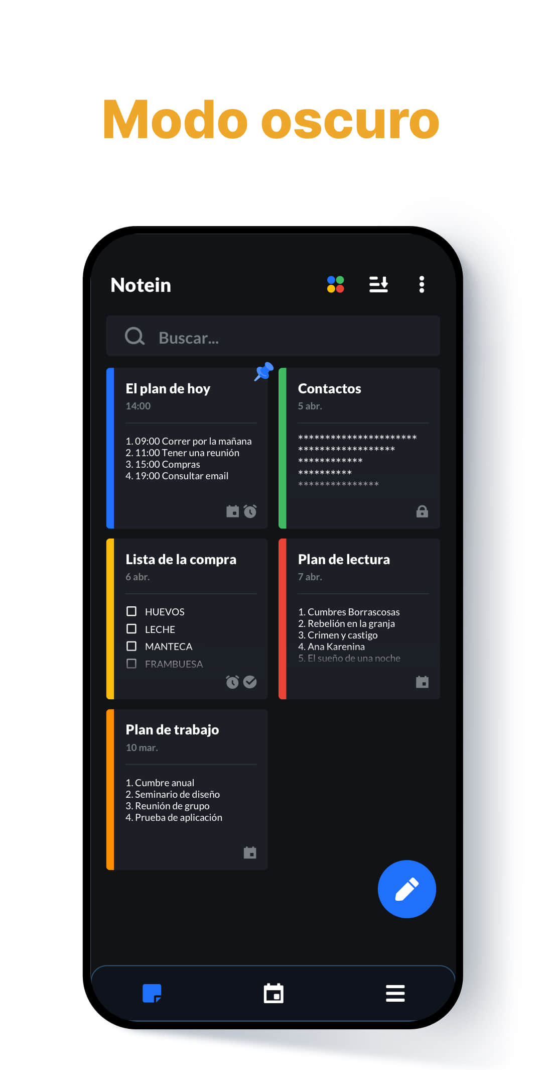 - Modo calendario para programar mejor tu tiempo y gestionar tus notas.