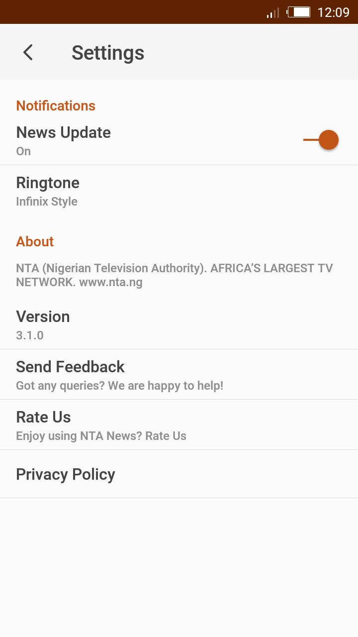 La aplicación NTA News lo mantiene actualizado con las noticias donde quiera que vaya con una excelente experiencia de usuario y sus programas de TV favoritos se le ofrecen EN VIVO. Obtenga las últimas noticias de Nigeria, noticias de última hora, noticias de actualidad de Nigeria, noticias de actualidad, noticias de actualidad, noticias de actualidad, noticias de negocios, noticias nacionales, noticias de política, noticias principales, noticias nacionales, noticias de entretenimiento, noticias económicas, noticias de celebridades, noticias extranjeras, noticias deportivas, noticias de fútbol, noticias mundiales y acontecimientos de Nigeria y de todo el mundo y muchos más, agrupados en categorías para que pueda recibir las noticias que le interesan. Características principales: • Ver en vivo: vea la transmisión en vivo de las noticias de la red NTA y sus programas de televisión favoritos. • Función UReport: envíe videos, imágenes, audio y texto desde su teléfono como sucede en su área. • Comparta las noticias en sus plataformas de redes sociales desde nuestra aplicación. • Notificación push (con opción para habilitar / deshabilitar): reciba notificaciones sobre las últimas noticias a medida que suceden. • Almacenamiento sin conexión: lea las noticias de su categoría favorita sin conexión sin conexión a Internet. • La aplicación NTA News agrupa las noticias en categorías para facilitar la navegación: Titulares, Nacional, Extranjero, Economía, Seguridad, Política, Tecnología, Deportes, Estilo de vida, Entretenimiento, Acontecimientos, Infraestructura. • Los titulares le brindan noticias de última hora e historias destacadas las 24 horas directamente del establo de la Autoridad de Televisión de Nigeria (NTA). Más funciones importantes próximamente en la aplicación NTA News ... Recuerde estar al día con NTA, Nigeria y la red de televisión más grande de África.