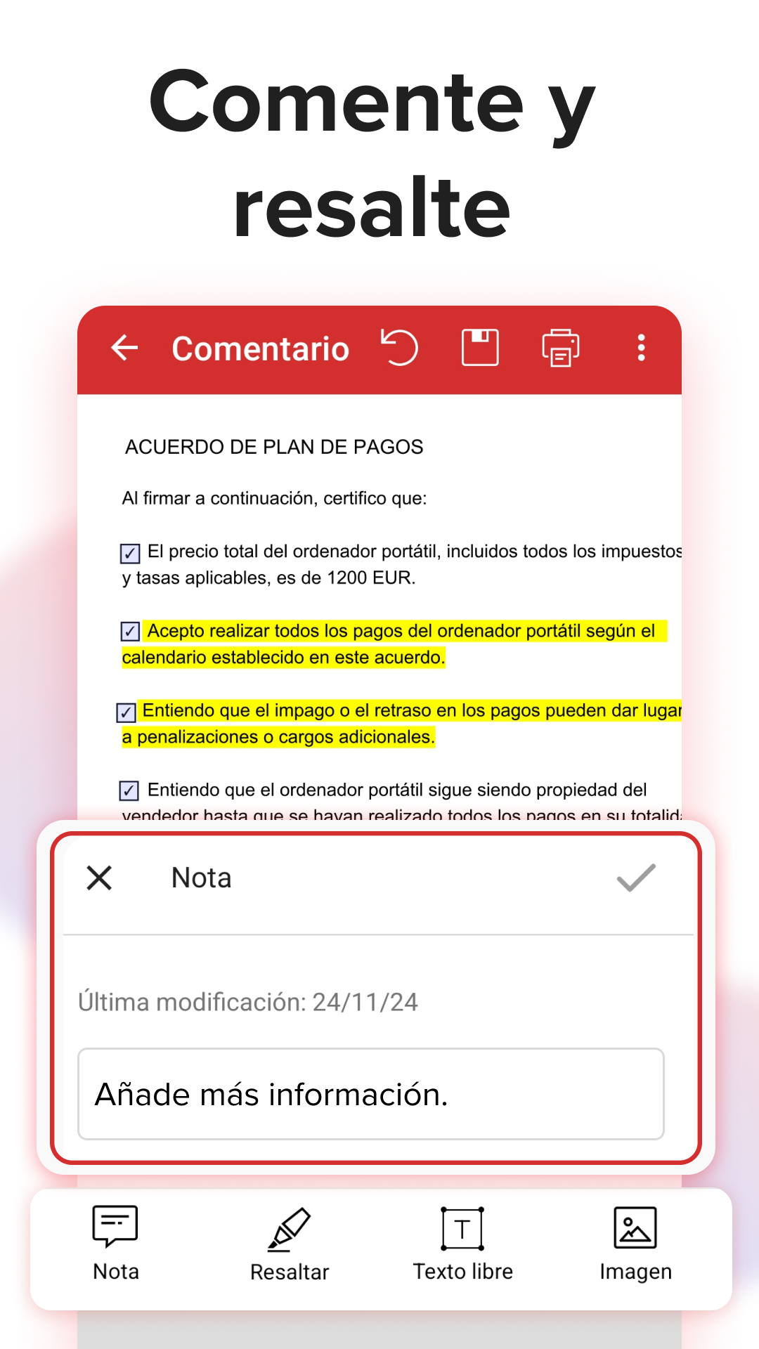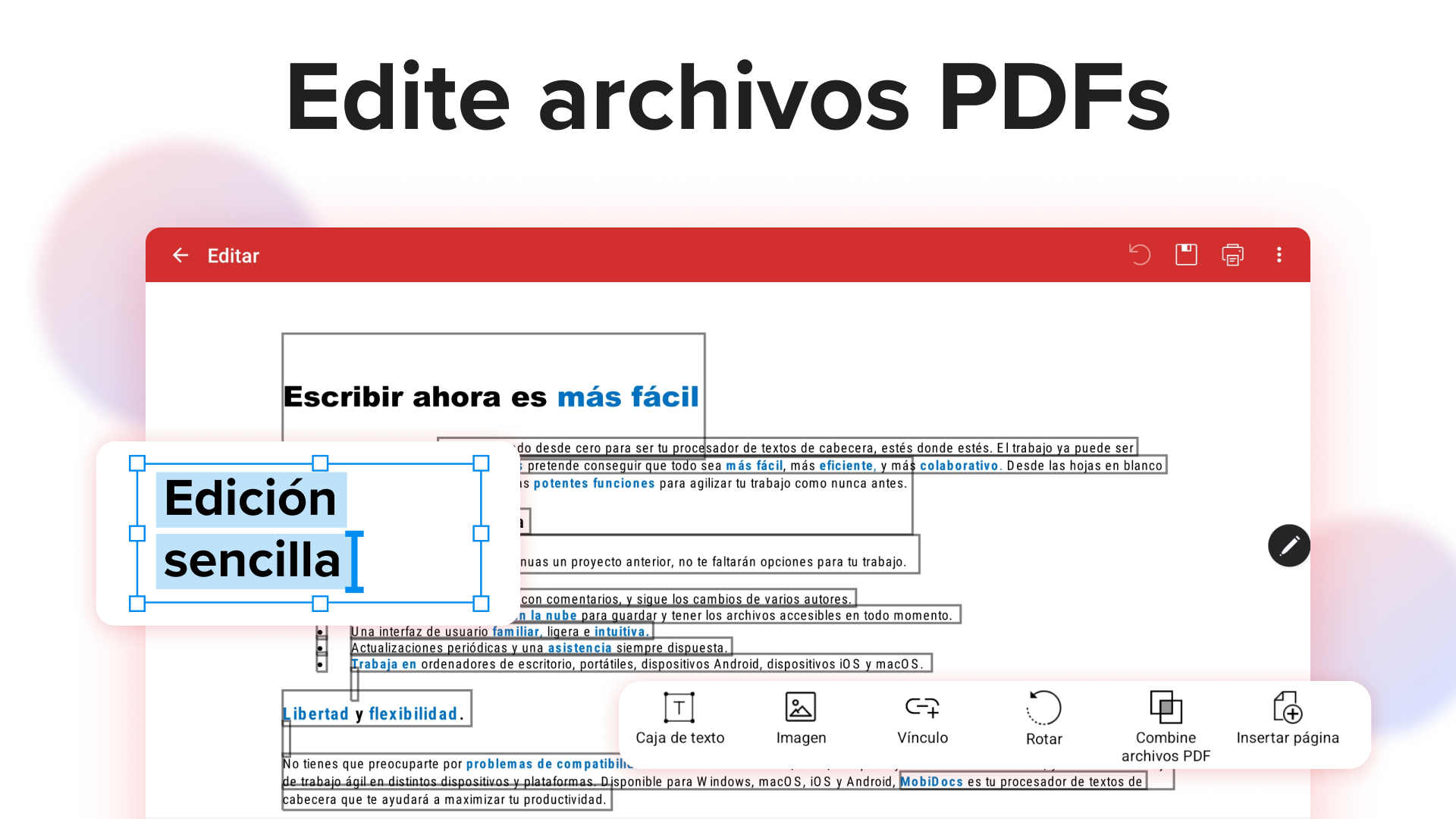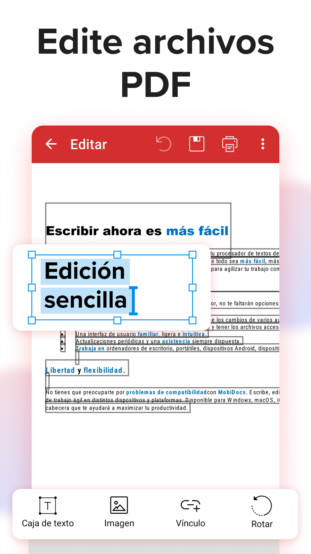 El editor y escáner de MobiPDF te ofrecen una potente colección de herramientas especializadas para ver, revisar, editar, crear y proteger archivos PDF de forma rápida y sencilla en tu teléfono, estés donde estés. MobiPDF se enorgullece de formar parte de PDF Association. 📃 Escaneo a PDF con IA Descubre el escaneo con ayuda de la tecnología de la inteligencia artificial, que mejora la detección de bordes y captura imágenes nítidas de tus documentos en papel y los convierte en archivos PDF editables. Desde recibos y contratos hasta facturas, notas, certificados, informes, identificaciones y pasaportes, MobiPDF ofrece un escaneo rápido y confiable. 👁️ Reconoce texto (OCR) Aprovecha la tecnología de reconocimiento óptico de caracteres (OCR) para reconocer texto tras escanearlos o de imágenes, y comparte fácilmente el texto reconocido por correo electrónico, aplicaciones de mensajería o subiéndolo a la nube. ✏️ Edita archivos PDF Accede a uno de los editores de PDF para móvil más avanzados del mercado y edita PDF, crea PDF en blanco e inserta, elimina o modifica diversos aspectos del documento, como texto, imágenes, firmas, comentarios, dibujos, certificados y mucho más. ✒️ Rellena y firma Rellena y comparte formularios, y firma documentos estés donde estés, aprovechando la compatibilidad avanzada con archivos PDF rellenables, que te permite dibujar tu firma directamente en los documentos o reutilizar las firmas electrónicas guardadas, además de realizar todos los cambios que necesites. 🖨️ Imprime archivos PDF Imprime documentos PDF de forma inalámbrica directamente desde tu teléfono. ➕ Convierte archivos PDF Convierte documentos PDF a archivos Word, Excel, PowerPoint o ePub conservando el diseño y el formato originales, y guarda archivos Word, Excel, PowerPoint y ePub como PDF para compartirlos fácilmente. Disfruta de una conversión fiable de imágenes PNG y JPEG en archivos PDF editables o utiliza el conversor gratuito de PNG y JPEG dentro de MobiPDF para convertir fácilmente documentos PDF en imágenes. 🔐 Protege archivos PDF Protege tus documentos confidenciales con contraseñas para bloquear, encriptar y restringir el acceso de los usuarios, y utiliza certificados digitales para validar la autenticidad. ☁️ Haz copias de seguridad de tus escaneos y PDF Inicia sesión en tu cuenta para acceder a 5 GB de almacenamiento gratuito en la nube en MobiDrive. Sube de categoría a MobiPDF Premium para obtener 50 GB adicionales de almacenamiento. 🗨️ Visualiza y comenta Mejora tu experiencia de lectura con el visor avanzado de PDF incluido en MobiPDF y cambia fácilmente entre distintos modos de página, o activa el modo de lectura para poder leer sin distracciones. Añade fácilmente comentarios, resalta y marca texto, inserta sellos o adjunta archivos a tu PDF. 📚 Organiza las páginas de los PDF Disfruta de un control total sobre tus documentos PDF: visualiza, reorganiza, inserta, elimina, extrae, duplica y rota páginas, o combina varios archivos PDF en uno solo para darles a tus PDF un diseño perfectamente organizado. Utiliza las compras desde la aplicación para desbloquear la mejor experiencia de escáner y editor móvil. Ten en cuenta lo siguiente: • Todos los pagos son cargados por Google Play Store después de confirmar la compra. • Si no cancelas al menos 24 horas antes de que finalice el período actual, se cargará la renovación automáticamente en tu cuenta. • Puedes administrar tus suscripciones desde la configuración de tu cuenta de Google Play. ¿Necesitas más? Échale un vistazo a nuestra versión gratuita de MobiPDF para el escritorio de Windows: https://mobisystems.com/en-us/mobipdf Centro de ayuda: https://support.mobisystems.com/hc/en-us/sections/20794400214045-Android Política de privacidad: https://mobisystems.com/en-us/privacy-policy Condiciones de uso: https://mobisystems.com/en-us/terms-of-use