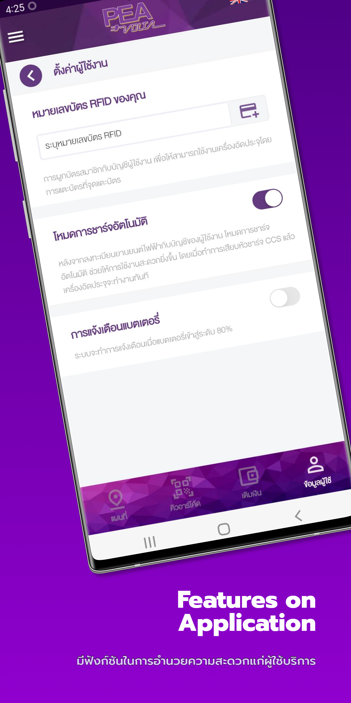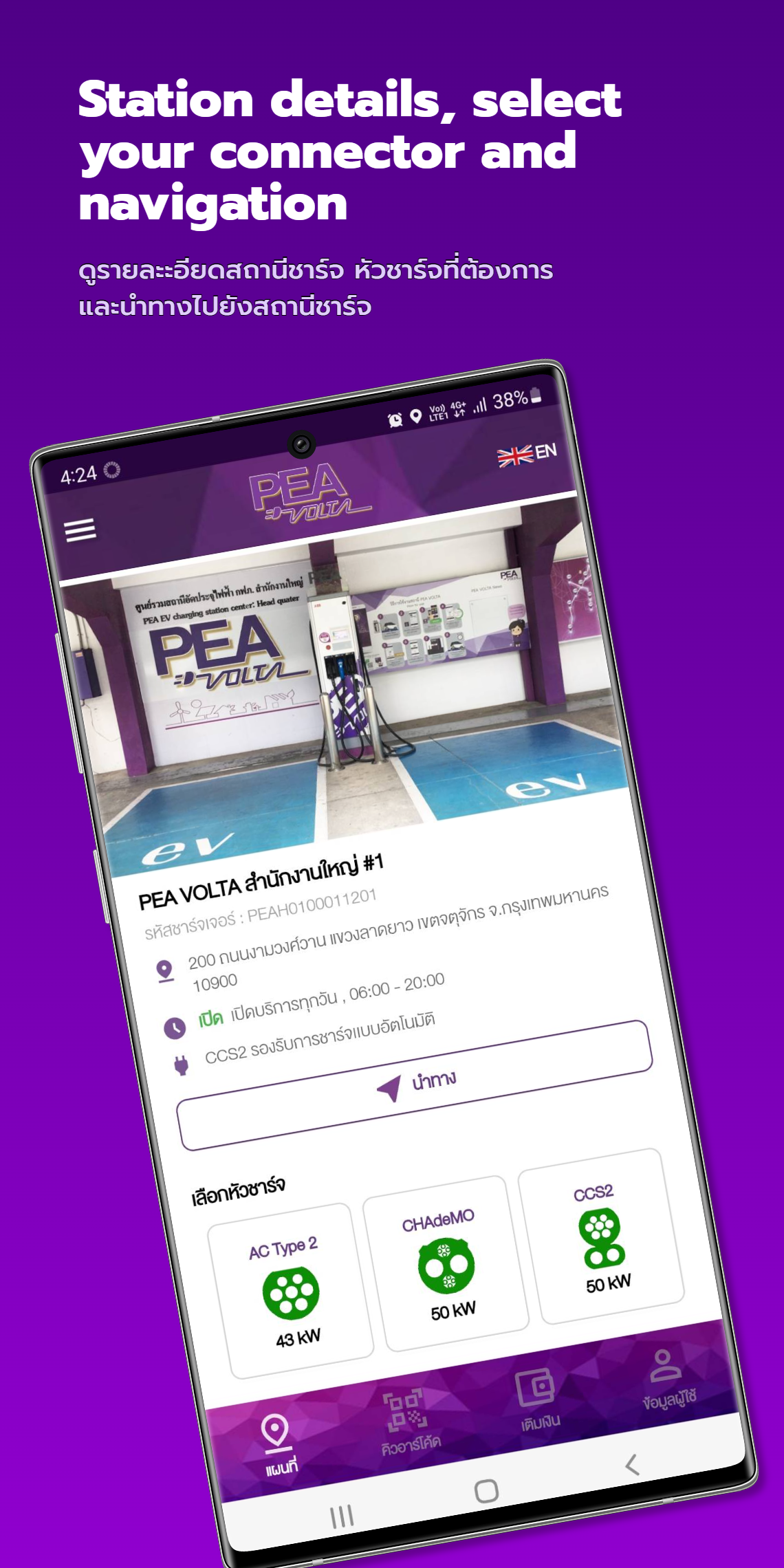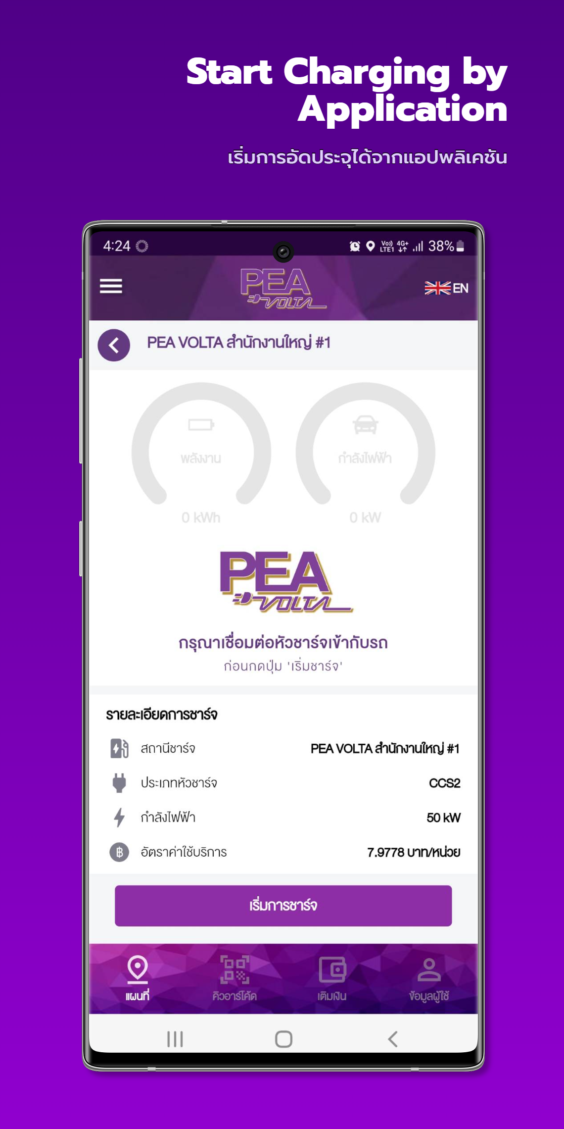 PEA VOLTA te hace la vida más fácil. Autoridad Provincial de Electricidad Abierto para servicio Apoya el uso de vehículos eléctricos. Para electrodos estándar 1. Ayuda a encontrar una estación para cargar vehículos eléctricos. Dentro de la red de la Autoridad Provincial de Electricidad Además de mostrar la ubicación de la estación Dirección más cercana al usuario 2. Muestre los resultados de la búsqueda de estaciones en formato de mapa. Mientras navega a la estación con GPS Calculando la distancia desde la posición actual Listo para mostrar el tiempo Y el número de viajes automáticamente 3. Los clientes pueden elegir ver los cabezales de carga que están disponibles para su uso. Y puede optar por reservar con anticipación para acceder a la estación de carga 4. Existe un cómodo servicio de recarga. Mediante código QR 5. Capaz de verificar el historial de uso histórico Como recargar, usar dinero y cobrar. 6. Hay un servicio de escaneo de códigos QR frente al quiosco de carga para un uso conveniente. Y no tienes que llevar tarjetas 7. Puede editar la información del usuario usted mismo. Y aún tener un recibo enviado a su dirección registrada 8. Hay una actualización de las noticias de la estación de carga de vehículos eléctricos. De la Autoridad Provincial de Electricidad