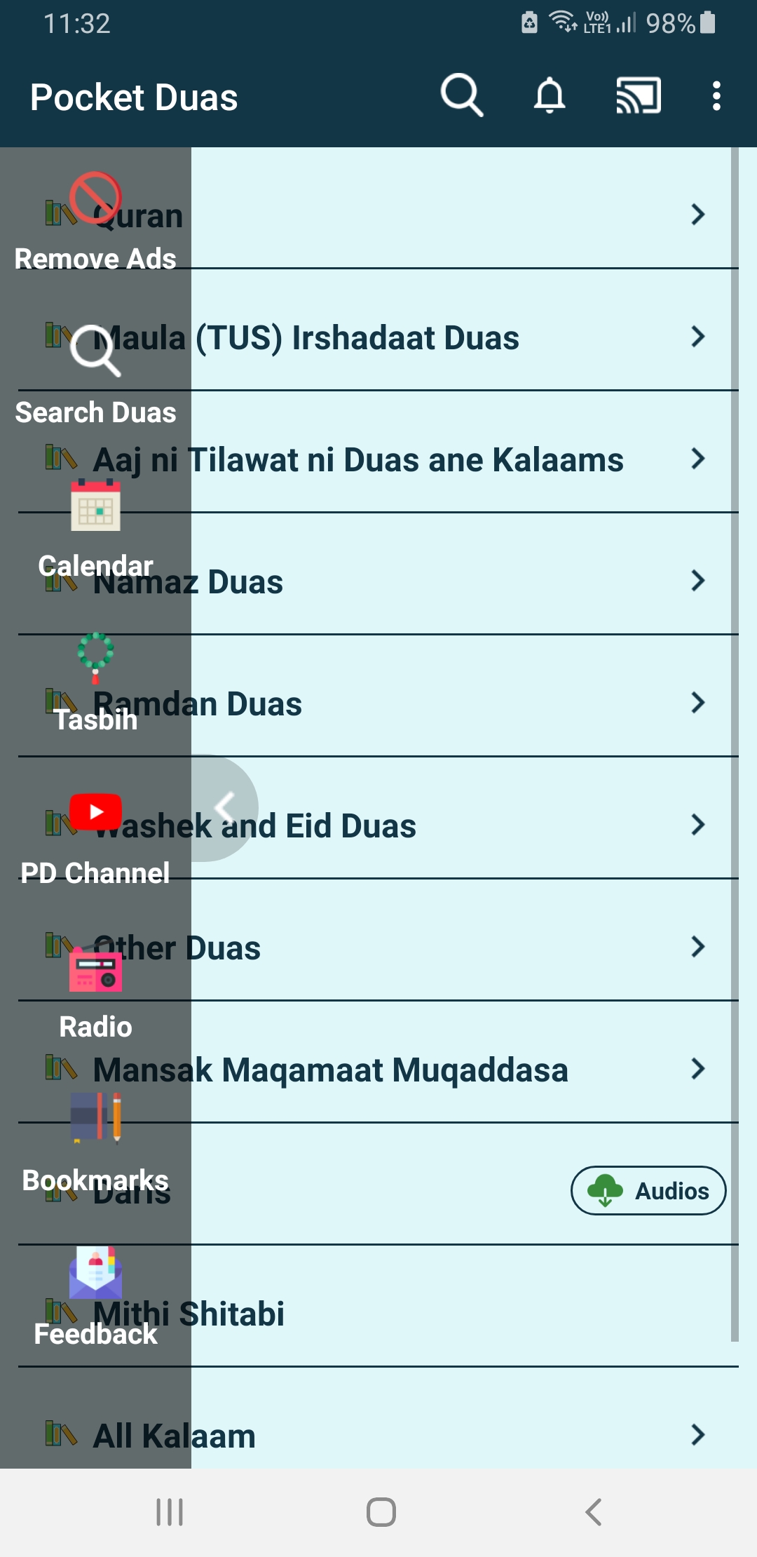 * Tiene la colección de todas las Duas como Dua e Yamani, Dua Kamil, Nasr wal Mahaba, Dua Kumail, etc. y Duas específicas para ocasiones especiales como Ramdan Duas, Washek y Eid Duas, Jumua Duas, Ashara Ayyam Duas, Daris, etc.