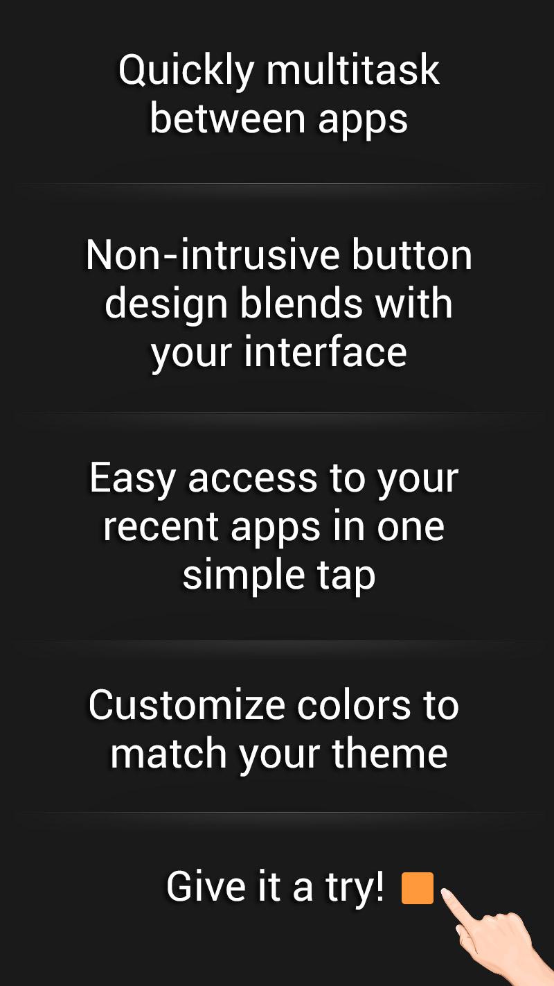 Did we mention you can customize it! Customize the color of the button & multitask overlay to match your theme. Switch to one of the 25 preset icons for the button or keep it simple with a solid color of your choice. Choose between straight or rounded corners. After you find a good spot for the button, set the transparency to zero and hide the button for a nice clean and effortless multitasking experience.