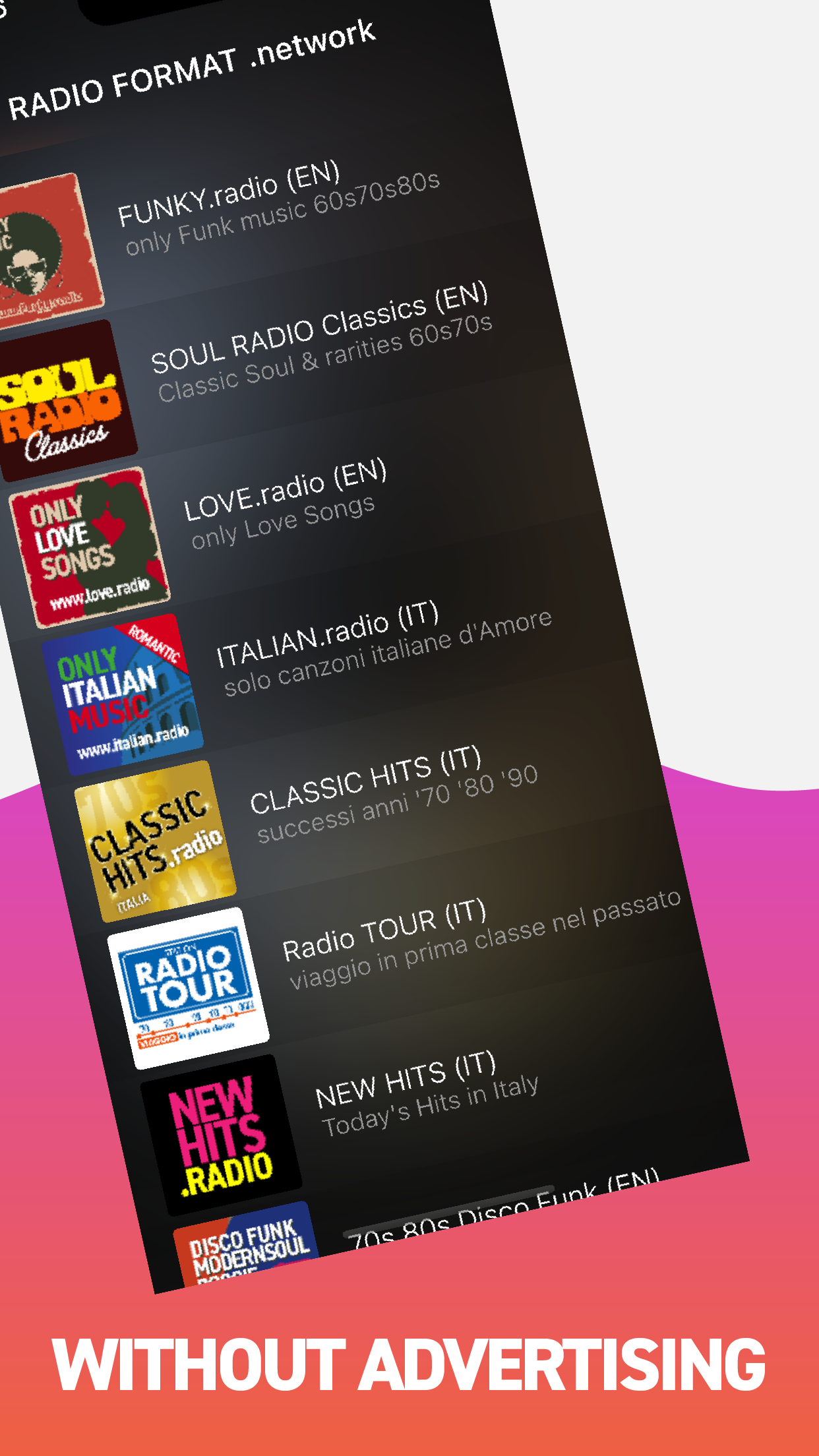 Esta es la aplicación oficial de Radio Format, la primera asociación comercial del mundo que representa estaciones de radio digitales solo temáticas. Descarga la APP Formato Radio, para escuchar sin interrupciones comerciales: - Funky Radio (solo música Funk de los 60, 70 y 80 = funky.radio), - 70s 80s Disco Funk, Modern Soul y Boogie (2º canal temático de Funky Radio = funky.radio/disco), - Radio italiana (solo canciones de amor italianas = italian.radio), - Love Radio (solo canciones de amor en inglés = love.radio), - New Hits Radio (solo los éxitos de hoy en Italia = newhits.radio), - Éxitos clásicos de los 70, 80 y 90 (solo música de los 70, 80 y 90 = classichits.radio/italy), - Soul Radio Classics (solo música soul de los años 60 y 70 y rarezas = soulradio.us), - Radio Tour (viaje en primera clase al pasado de 1970 a 1980, 1990, 2000, 2010 y hoy = radiotour.fm), - Radio New Country (solo hits country de hoy = radionewcountry.com), - Station Dance (sets de DJ solamente = station.dance), - Trap Radio (solo trap music = trap.radio), - Solo Canzoni Napoletane (la historia y el presente de la música napolitana = solocanzoninapoletane.it) Las estaciones de radio temáticas de todo el mundo pueden suscribirse a nuestra asociación desde el sitio web oficial RadioFormat.network