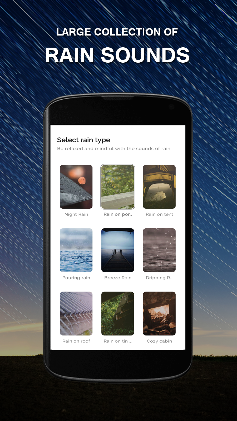 Puede elegir entre más de 30 paisajes de lluvia, cuidadosamente seleccionados y dominados profesionalmente para calmarlo. Los niveles de sonido y el espectro están especialmente ajustados para ayudarlo a refrescarse y ahogar cualquier ruido de distracción del exterior.