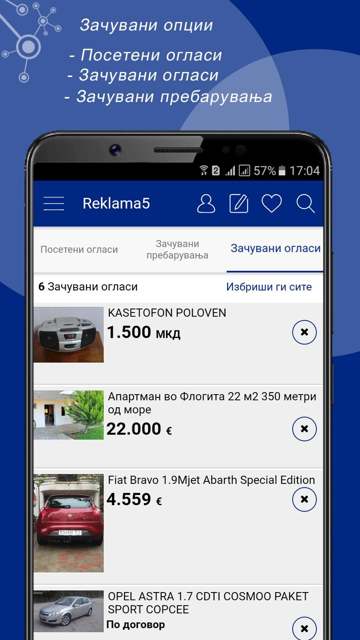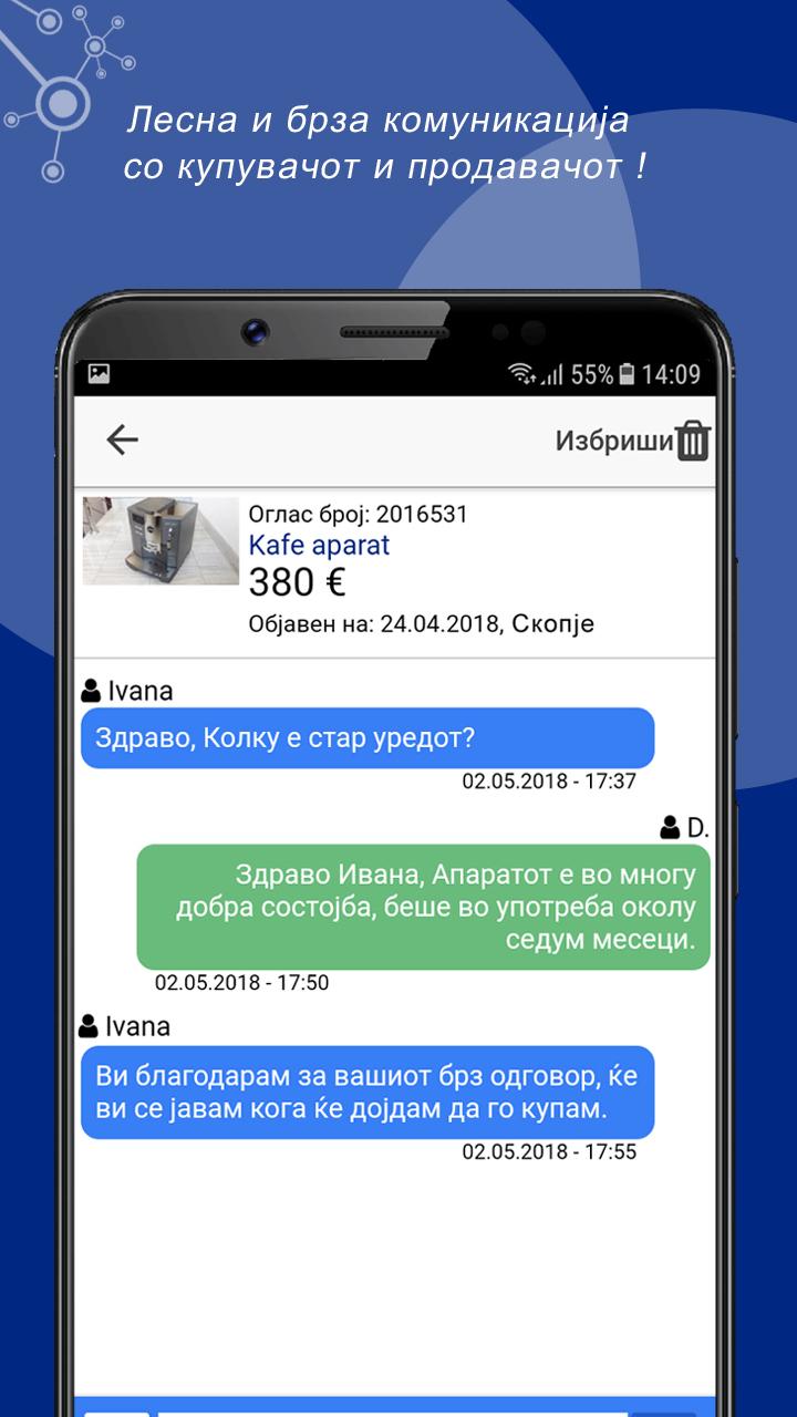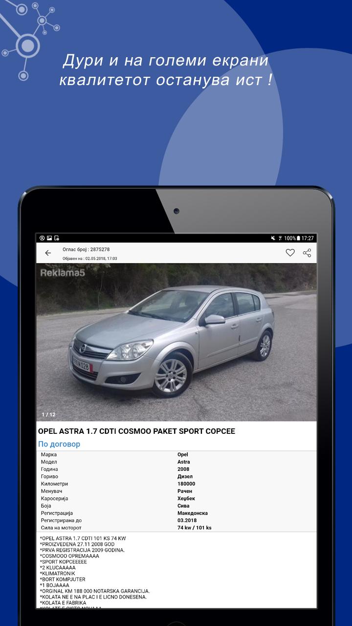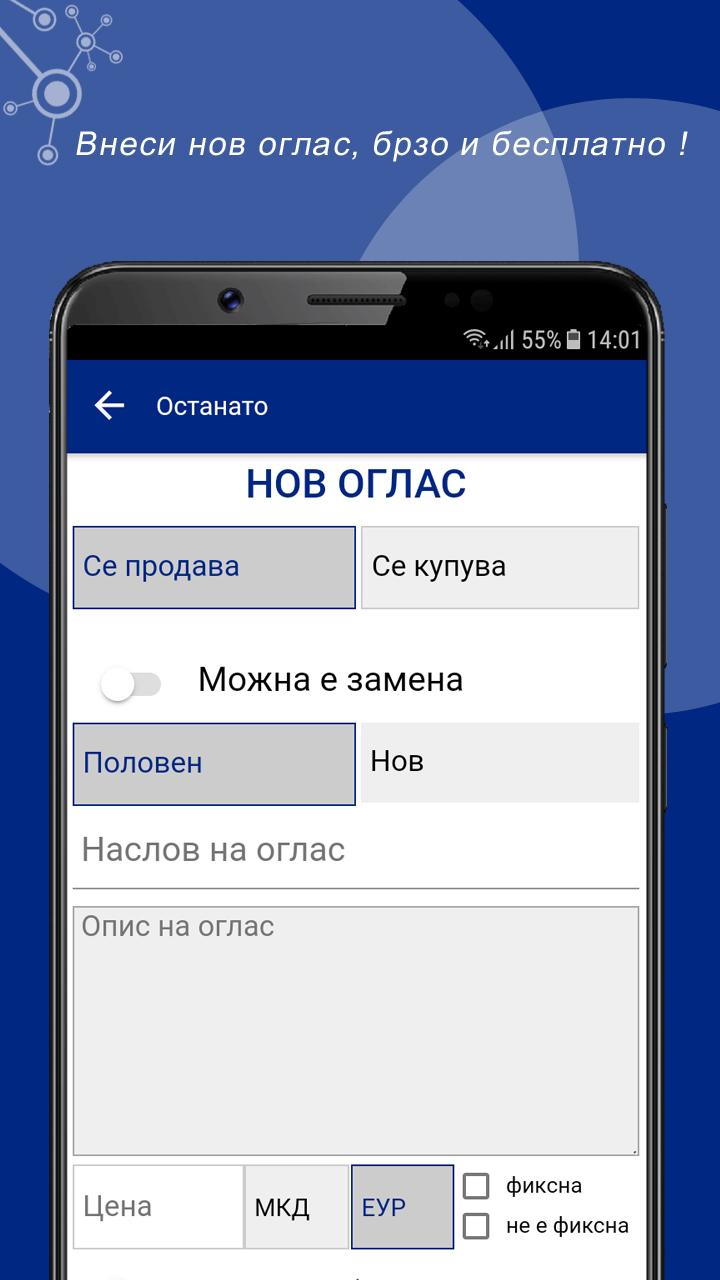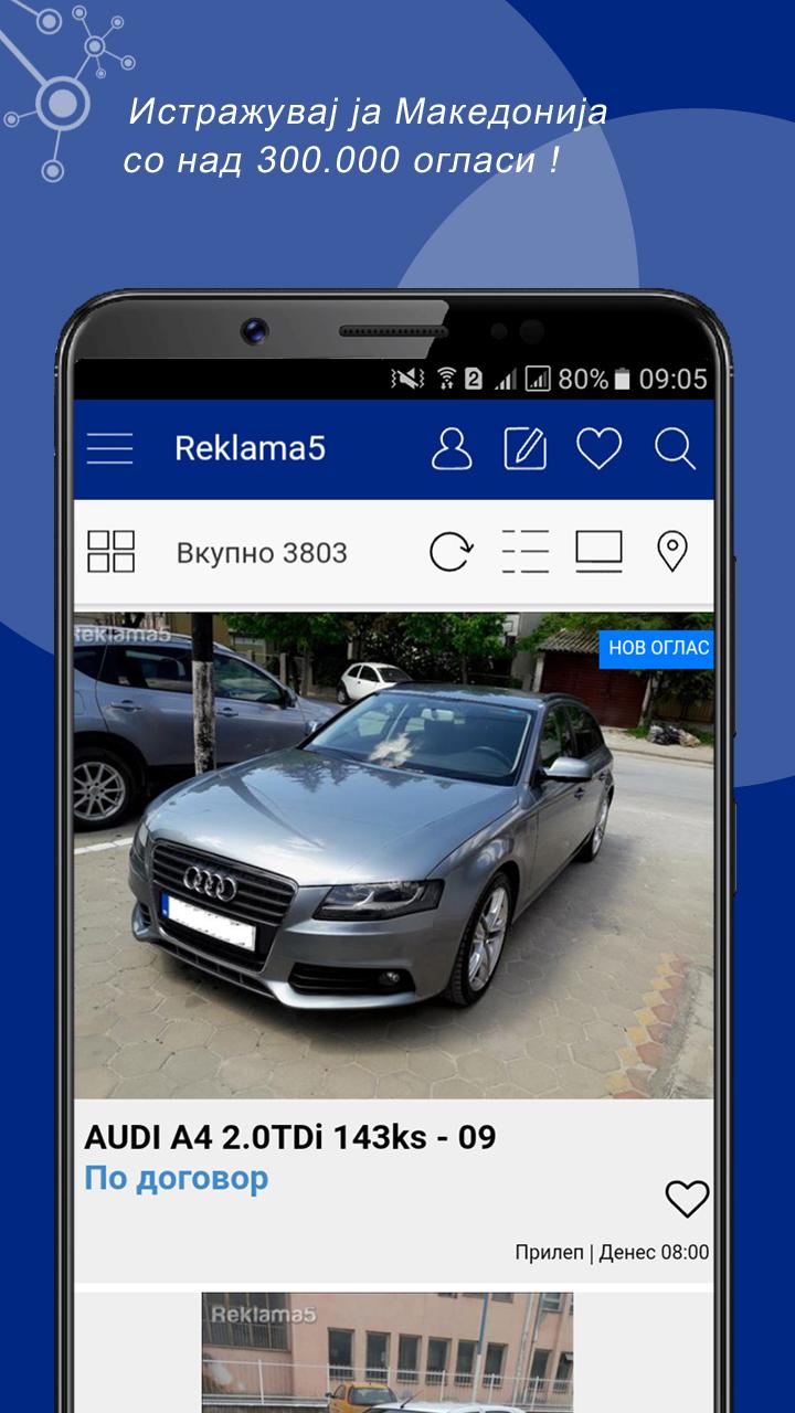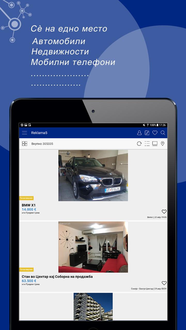 Un promedio de más de 300.000 anuncios, con más de 3,5 millones de visitantes / mes y un total de más de 60 millones de páginas vistas al mes, Reklama5 actualidad es la mayor plataforma de comercio en Macedonia, así como el sitio web más visitado en Macedonia. En Reklama5 particulares y empresas pueden comprar y vender productos nuevos y usados y para ofrecer servicios también sirven para la presentación de su empresa. Si usted quiere vender su coche, si estás interesado en los motores, en busca de trabajo, o si desea publicar un evento, categorías oferta para casi todos los deseos. ► Vehículos Motorizados ► Inmobiliaria ► Hogar y Jardín ► ropa y calzado ► Los teléfonos móviles ► Salud ► TV, vídeo, fotos y multimedia ► Instrumentos musicales y equipos ► relojes y joyas ► para bebés y productos para niños ► Salud, Belleza Doda. y equipo ► CD, DVD, VHS Música, Películas ► Libros y literatura Material escolar y de oficina ► ► Tiempo libre y aficiones Animales ► equipos y actividades deportivas ► Antigüedades, colección de arte. ► negocios y actividades, máquinas herramientas ► Sabores y cocina ► Tiendas, Tienda ► Servicios, administradores ► Empleo ► eventos, vida nocturna, Exposiciones ► fiesta, viaje, pasajeros en ► Los contactos personales ► Otros listas de búsqueda! Encontrar exactamente lo que busca una aplicación Reklama5 puede ver y filtrar todos los anuncios fácilmente. -Prebaruvanje por categorías y subcategorías -Prebaruvanje por Región palabra clave -Prebaruvanje -Prebaruvanje el número de anuncio Añadir nuevo listado, rápido y gratis! Instalar la aplicación Reklama5 e inmediatamente comenzar a vender sus artículos. Comparte listados favoritos con amigos en las redes sociales: Facebook, Instagram, Viber, Twitter, SMS, correo electrónico ... Por nuestra parte siempre se esfuerzan por ofrecer la más alta productividad. Estamos trabajando constantemente en desarrollar aún más el portal de anuncios deseos de los usuarios. Reklama5 garantizar anuncios de contenido de alta calidad. De ahí que comprueban todos los anuncios antes de su publicación. Casi todos nuestros anunciantes se han verificado los usuarios. Los representantes de los medios de comunicación o persona jurídica / física, que son capaces de correo electrónico para establecer contacto con nosotros. Por favor, deje sus preguntas y su número de teléfono. Le responderemos tan pronto como sea posible. Agradecemos sus comentarios en nuestra aplicación. Nos ayuda a mejorar aún más. Gracias por su confianza en el uso de nuestros servicios y le deseamos mucho éxito con sus anuncios.