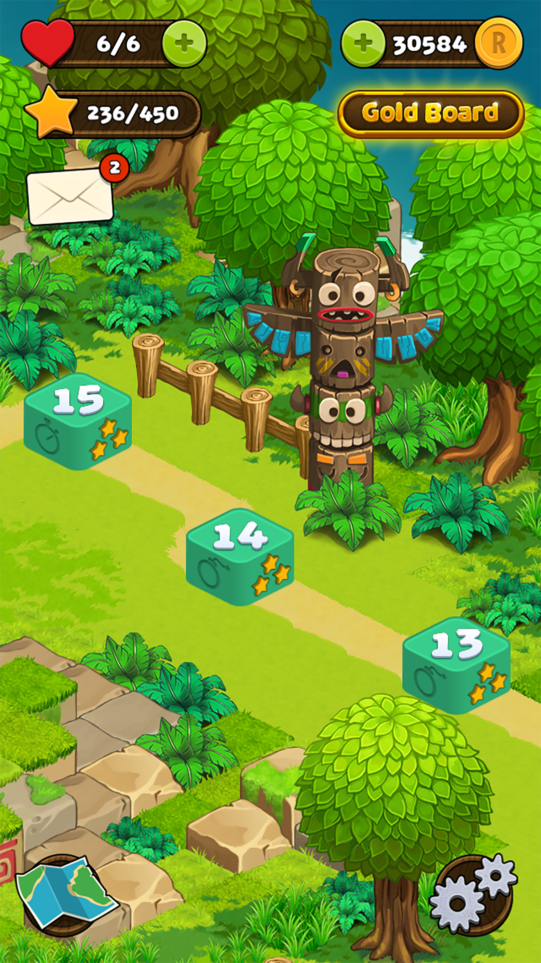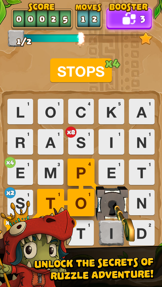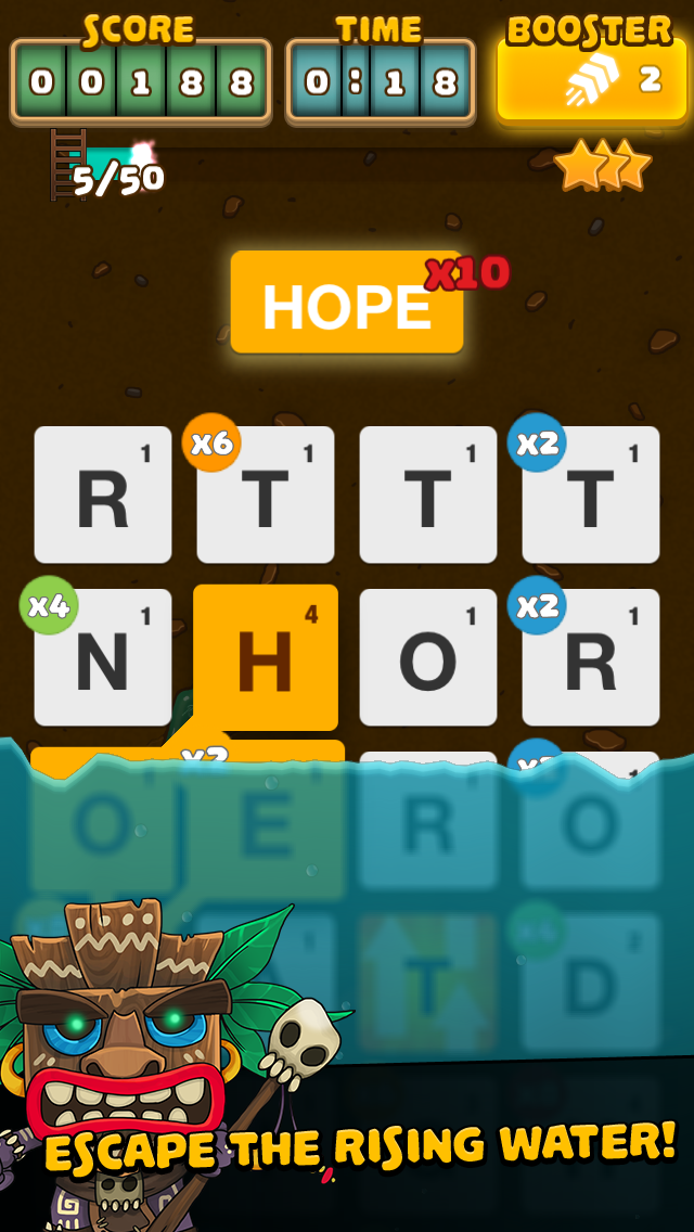 Swipe your finger across the game board and make words; with every word you will be able to crush stones, escape rising water and gain as many points as possible to achieve one, two or three stars! Longer words can give you more points and free boosters.