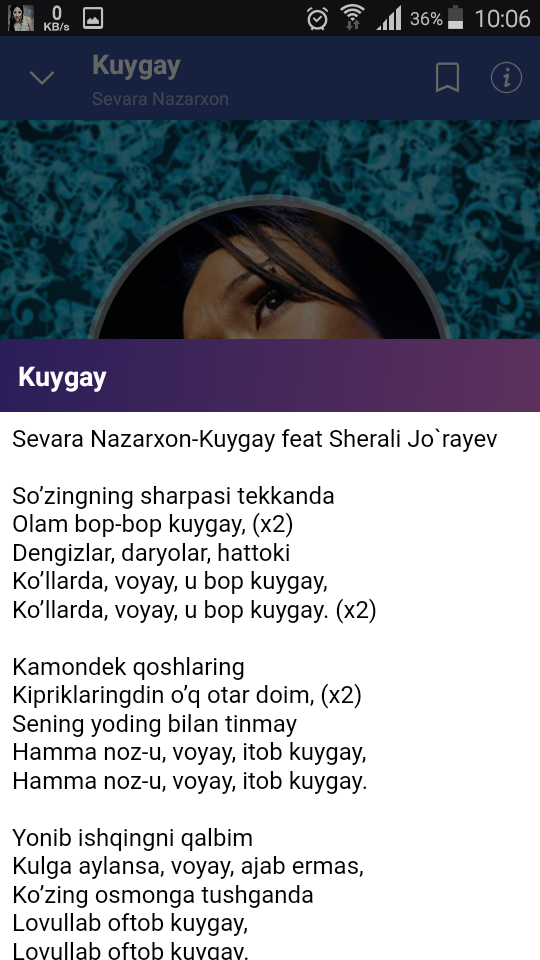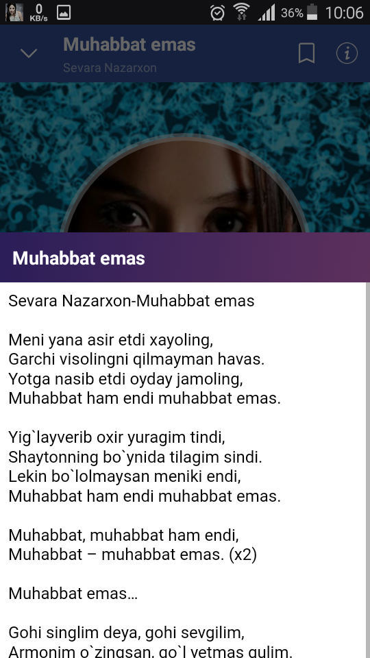 Sevara Nazarxon oʻzbek qoʻshiqchisi, aktrisa, musiqachi va qoʻshiqlar muallifi. Andijon viloyati Asaka shahrida dunyoga kelgan. Shou-biznesdagi ilk faoliyatini taniqli produser va musiqachi Mansur Toshmatov boshchiligidagi Sideris guruhida boshlagan. Toʻrt qizdan iborat guruh tezda tanilgan, ammo u yakkaxon qoʻshiqchi sifatida koʻproq muvaffaqiyat qozondi. Oʻzbek estradasida Sevara Nazarxon nomi 1999 yilda kirib keldi. Muhammad Yusuf sheʼriga bastalangan "Yur muhabbat" qoʻshigʻi unga omad olib keldi. 2000 yildagi ilk "Ko'rgim kelar" albomidan joy olgan qoʻshiqlari hamon katta ahamiyatga ega. 2001 yil boshidagi "Tushim" va "Unutgin" qoʻshiqlariga ishlangan kliplari oʻzining zamonaviyligi bilan barchaning diqqatini tortdi. Setora guruhi bilan kuylangan "Dugona", Abdulaziz Karim bilan kuylangan "Yagonam oʻzing" qoʻshiqlari haqiqiy mashxurlik keltirdi. 2000 yil sentabr oyida birinchi marta "Nihol" Davlat mukofotiga Tohir Sodiqov, Dilfuza Rahimova, Setora guruhi qatorida sazovor boʻlib, tantanali marosimda "Millatlar" qoʻshigʻini ijro etdi. 2001 yil 31 avgust kuni Mustaqillik maydonida boʻlib oʻtgan Istiqlolning 10 yillik tantanalarida Muhammad Yusuf qalamiga mansub "Ulug'imsan Vatanim" qoʻshigʻini ijto etib, haqiqiy isteʼdodini namoyon etdi. 2002 yilda ijro etilgan "Vatan bu" kompozisiyasi ham olqishlarga sazovor boʻldi. Sevara Nazarxon 2000 yildan boshlab Lindondagi Universal Music studiyasi hamda dunyoga mashxur xonanda va produser Piter Gabriel bilan hamkorlik qilib kelmoqda. 2003 yildan boshlab xalq qoʻshiqlarini pop-folks yoʻnalishida ijro eta boshladi. Sevara Nazarxon 2004 yili BBC Radio 3 tomonidan taqdim etiladigan Osiyolik Eng Yaxshi Qoʻshiqchi Unvoniga sazovor boʻlgan. 2000 yilda suratga olingan "Tohir va Zuhra" yangi talqin filmida rol ijro etib, Abdulaziz Karim bilan "Yagonam oʻzing" duetini ijro etgan. Sevaraning Rossiya Fedratsiyasining vokal ijrochiligi boʻyicha eng asosiy "Golos" yaʼni "Ovoz" loyihasidagi ishtroki hamma oʻzbeklar uchun kutilmagan hol boʻldi. Shundan keyin u "Вышка", "Точь в точь", "Танцы со звездами" kabi loyihalarda ham qator yutuqlarga erishdi. Hozirda u oʻz oilasi bilan Angliyaning London shahrida istiqomat qilsada, London - Moskva - Toshkent yoʻnalishida muntazam qatnab turadi. Bahor va kuzda asosan Toshkentda istiqomat qiladi. Deniz ismli oʻgʻli bor. Oʻzbekiston Respublikasi Prezidentining 26.08.2002 yildagi Farmoni bilan Sevara Nazarxonga Oʻzbekistonda xizmat koʻrsatgan artist unvoni berilgan. Ushbu ilovada Sevara Nazarxonning: - Bilarsan - Bir kam dunyo - Izhori ishq - Jetaime - Jonginam - Ko`rgim kelar - Kuygay feat Sherali Jo`rayev - Любимые глаза - Mani tilagim - Menga ham o`rgating - Meni sev - Muhabbat emas - Oq qushlar - O`rik gullaganda - Orzuim - Otajonimsiz - Quyoshga qarab oqqan suv - Sevgi alam - Seni deb - Ulug`imsan vatanim - Vatan bu - Yor-yor - Yur muhabbat nomli taronalari joy olgan. Tags: sevara nazarxon, sevara nazarxon biografiya, sevara nazarxon tarjima holi, sevara nazarxon hayoti, sevara nazarxon oilasi haqida, sevara nazarxon konsert sevara nazarxon mp3, sevara nazarxon 2017, sevara nazarxon 2018, sevara nazarxon haqida, sevara nazarxon yur muhabbat, sevara nazarxon ulugimsan vatanim, yangi taronalar, uzbek mp3, uzbek musics, , yangi qo`shiqlar, yangi taronalar, sevara nazarxon klip, sevara nazarxon kliplari to`plami, klip skachat, klip 2018, sevara nazarxon 2019, konsert 2019, qo`shiqlari toplami, uzbek musics, uzbekcha qoshiqlar, uzbekcha skachat.