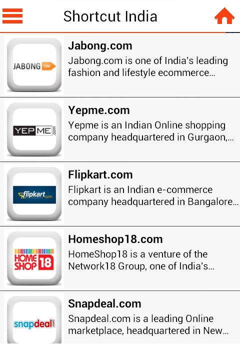 Shortcut india : Name of the application , signifies its meaning - 1.Connect with all your favorite websites in finger tips . 2 .Watch national and regional Indian TV Channels (News, Entertainment , Business News, Regional channel( viz .. Assamese, Bengali , Bhojpuri ,Marathi, Tamil , Telugu etc ) 3.Update yourself with popular Indian News papers . 4.Find your dream Tourist destination from the 28 States and 7 Union Territories of India .(connect with statewise tourism websites of India) .This app will guide you in your visit of famous temples , historical places , national parks from different states across the country . You can call it virtual tourist guide . 5.Check your railway PNR status . 6.Buy the product of your choice from online shopping website . 7.Find your dream JOB. 8.Get your life partner with marriage portal . 9.Refresh yourself with Life-style website . 10.Find android hidden secret codes . 11.Get Live Cricket score 12. Pay Electricity Bill . 13.Mobile recharge from your android device Benefits of this app : “Chhota sa app bheem jaisa kam ”, means installing this Free android application you can save your valuable time, memory space of your device and find almost all your requirement within this app. Only important thing is that to run this application you should have internet connection . Tags : Sochi 2014 , winter olympics sochi ,winter olympics in russia , Mobile TV, Live TV,NEWS, Movies, Talk shows, Free India Live TV, Sport, Music, Online TV, Live TV for Android Cricket Live TV, Watch Indian TV Channel live on your mobile free. 2G Live TV , 3G Live TV Hindi,Telugu,Tamil,Odia,Regional,Kannada, Marathi, South Indian, Assamese Tv , Bengali Tv etc Disclaimer :: • All the logos, trademarks and other symbols are the properties of their respective owners. We do not support or endorse any channel or any company. • This application only provides the links to the respective mobile version of particular popular website or live streaming TV channels . • We collect all TV channels video url from various sources published on internet and from the users. Hence despite of our best effort we can't guarantee its correctness and other legal information . If the owner or publishers of the channel do not want display their channels appear in our application , please contact us .We will remove that corresponding channels immediately from our list . We value your feedback :: If you have any issues, contact us before leaving a bad review . When you get force to close message or if you see a channel that does not work , at first check your internet connection speed , if the problem still persist , please send us an email about the issue. For improving the app; add your comments and give stars on the play store! If you want us to add a new TV channel, send us email with channel name and a link to the channel. We will try to live upto your demands .
