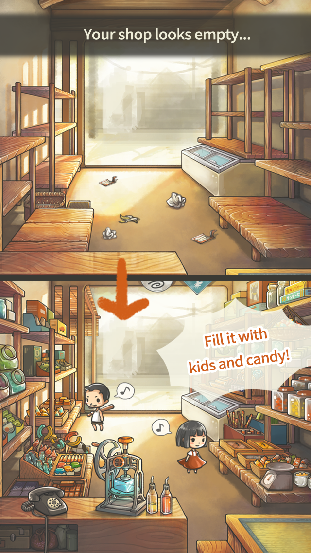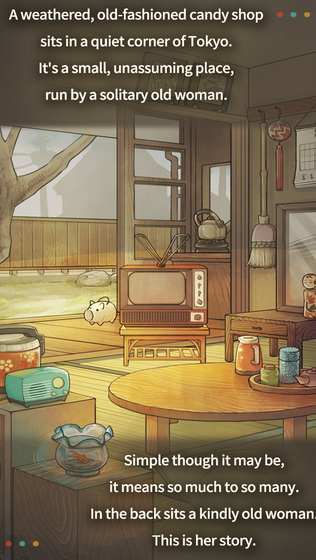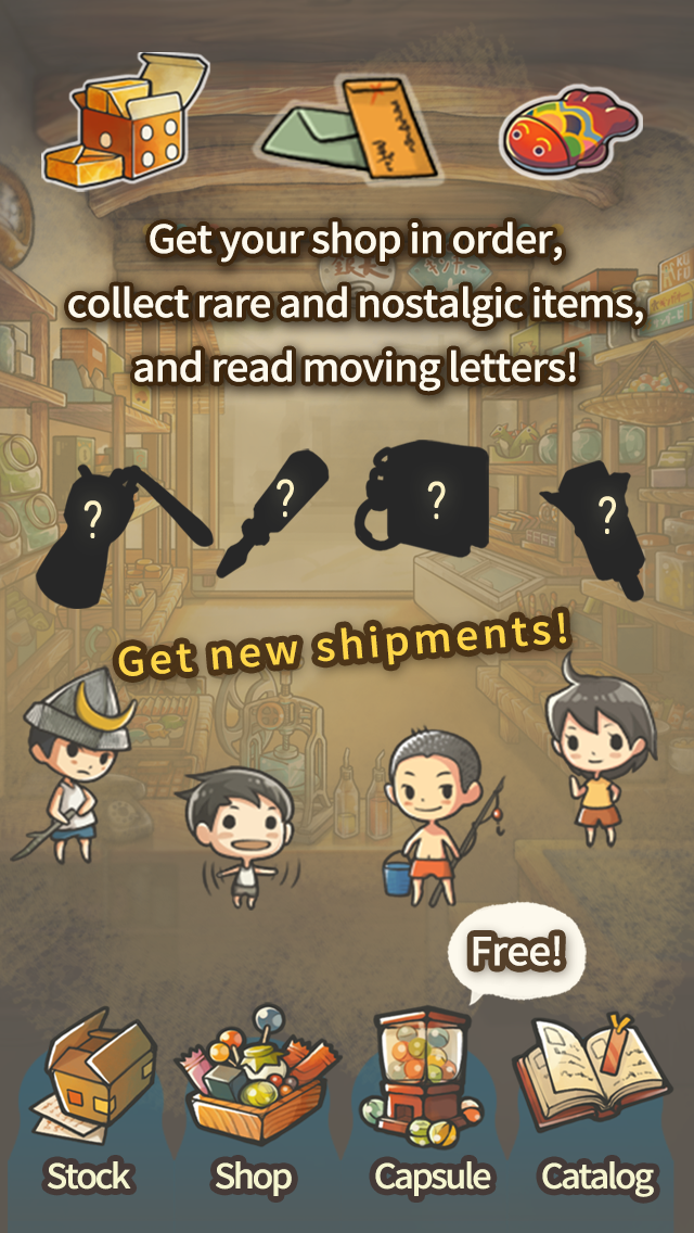 Back by popular demand! The sequel to Showa Candy Shop! Experience nostalgia with a Japanese twist in this moving game. Uncover the story of a small, old-fashioned candy shop in rural Japan with this leisurely game. Raise the reputation of your tiny shop, and build a collection of retro Japanese toys! Collect amusing snacks and toys such as Yoogurt, a Glowing Skeleton, and the Pickled Plum as you discover the things that brought a smile to the face of every little boy and girl in Japan! The story unfolds bit by bit with every item you collect, and is sure to keep you playing until the very end! We have also added a (completely free!) capsule toy machine that we think you'll find just as pointless as any you've ever tried—but you won't be able to stop! So come on in! This little candy shop just received a huge shipment of junk, and somebody's got to buy it! Did we say "buy"? Don't worry, we won't charge you a single cent for any of it. Check back each day to play through the entire story free of charge! The candy shop is always open, waiting for you to stop by for a refreshing snack! ■The Story Welcome to an inconspicuous street corner in Showa-era Japan. All of Tokyo is positively buzzing ahead of the 1960 Olympics, but this little nook is home to an unassuming candy shop run by a sweet, unassuming old woman. As yet another day comes to a close, she watches the setting sun bathe Tokyo Tower in a soft glow and reflects. A lot happened today—some of it good, and some of it not. Join this sweet old woman on her journey, and experience a bygone era. A lone trumpet scores the sunset as she writes a letter...but to who? Marbles, Balls, and Balloons... Gooey Candies, Seasoned Seaweed, and Kaleidoscopes... These are halcyon days. No smartphones, no internet distractions. Just peace, solitude, and a summer break that stretches out endlessly before you. This is the exceptional story of an ordinary old woman. ■How to Play Goal ・Use the money you receive from customers to improve your store. ・See if you can collect all the items in the Catalog! ・Experience the entirety of the game's story! ・Use special tokens to spin the capsule toy machine—try to collect them all! Basic Rules 1. Stock your store. 2. All the neighborhood children will stop by the shop. 3. Tap or swipe the children to collect their money. 4. Use the money you collect to upgrade the shop in the Shop Menu. 5. Upgrade your shop to unlock new merchandise! 6. New merchandise attracts new customers. 7. Fill up your catalog by attracting a variety of customers! Repeat steps 1-4 to earn money even faster. More money means more upgrades! Keep playing until you've completed your collection and finished the story! Different Days, Different Customers Some customers may only appear on certain days. Check the Catalog to see which customers appear on which days, and check in on the shop every so often to see what day it is! And remember, the days of the week don't follow the real world's clock! Mementos Mementos will sometimes appear in the room at the back of the shop. Collect them to advance the story. And don't forget to check in from time to time and see what's new! Capsules Spin the capsule toy machine and collect simple, useless toys. The toys you get vary from day to day. You will get duplicates, but don't let that get you down! The capsule toy machine only takes special tokens. Earn these tokens by collecting mementos or completing other tasks. ---------- Translation: Jeff Wilson Gavin Greene