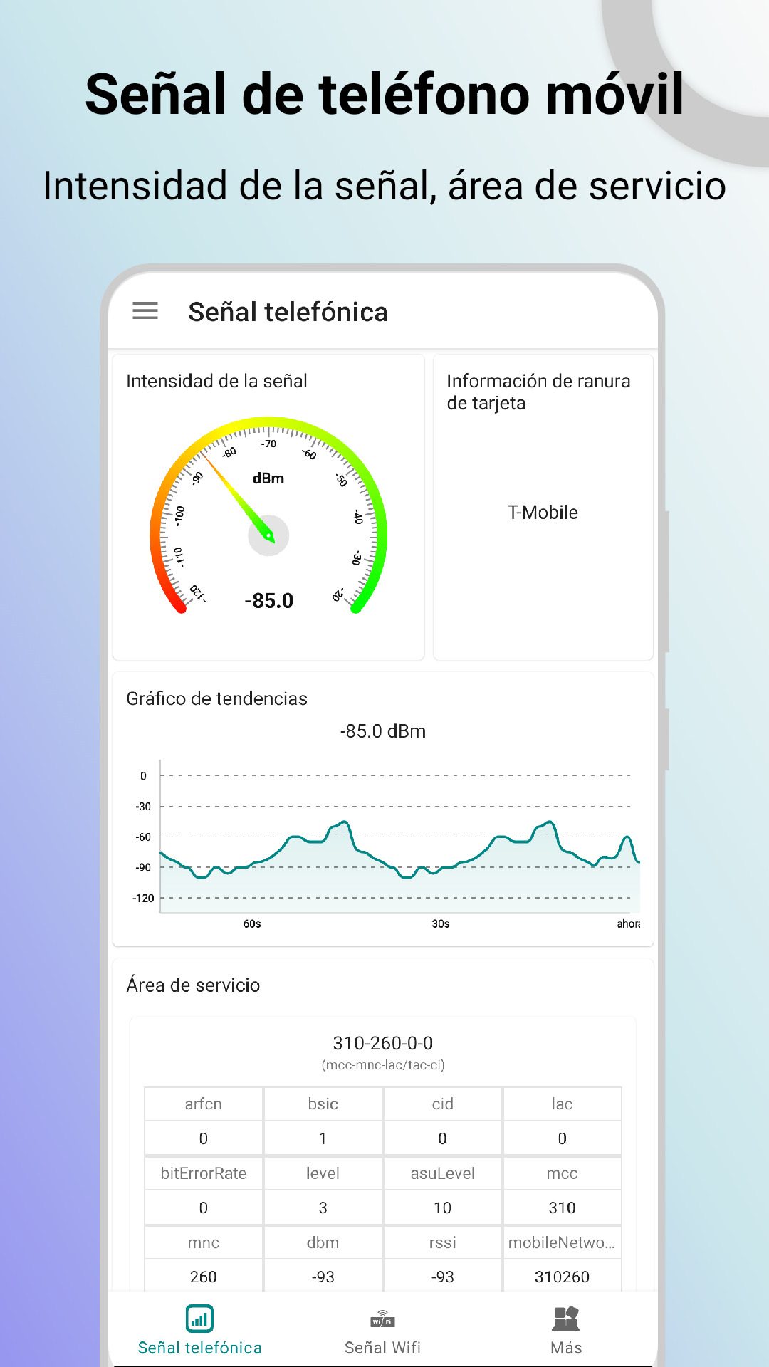 1. Señal de teléfono móvil: detecta la intensidad de la señal del teléfono móvil en tiempo real, consulta información de la tarjeta SIM, operador y otra información, obtiene información de ubicación de la estación base, consulta información de la comunidad del servicio, obtiene intensidad de la señal de la comunidad, lac/tac/ci y otra información de la comunidad. , buscar información de comunidades cercanas, etc. Servicios de detección de señales;
