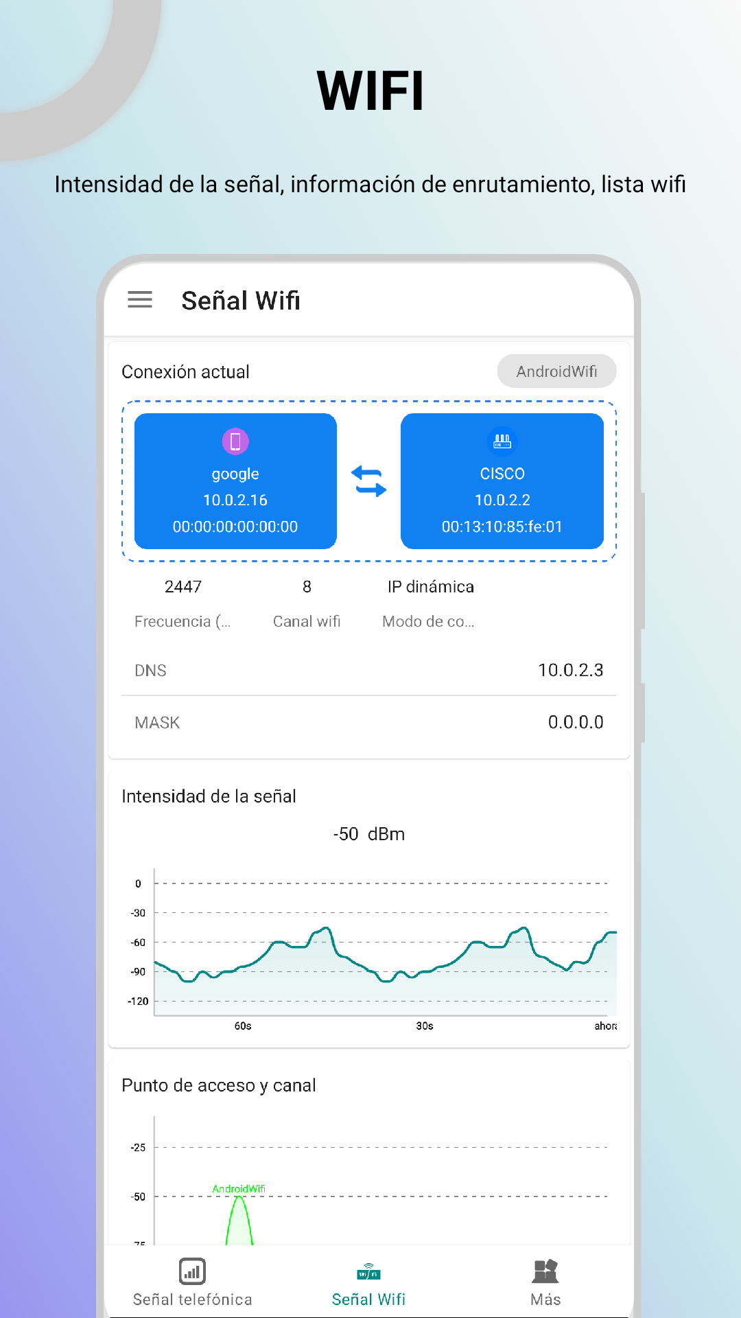 2. Señal WIFI: detecta la intensidad de la señal WIFI en tiempo real, consulta información WIFI, como intensidad de la señal, dirección mac, canal, configuración IP, velocidad de conexión y otra información relacionada, y obtiene información de la señal wifi y del canal, detección de seguridad wifi;
