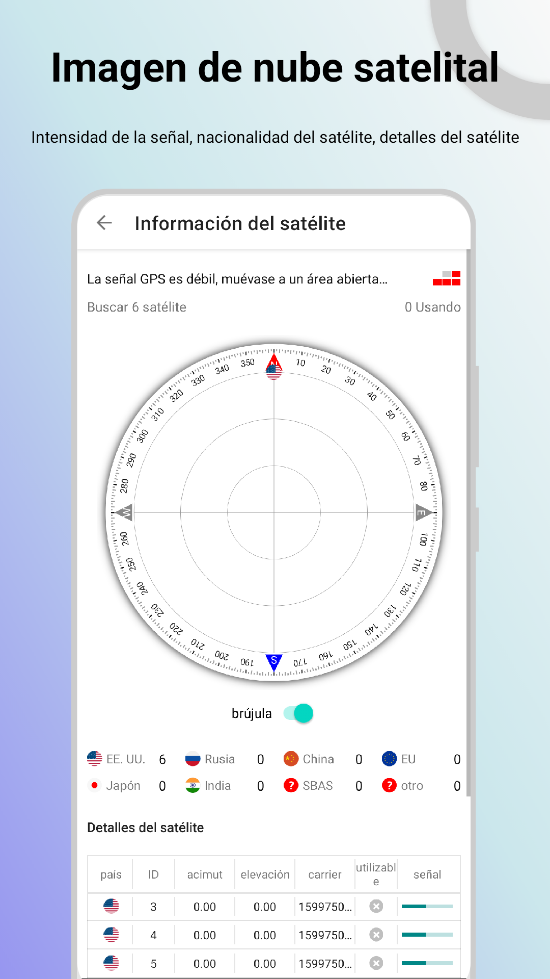 3. Señal GPS: detecte información de la señal GPS en tiempo real y obtenga información satelital, incluido el nombre de nacionalidad (GPS de EE. UU., Beidou chino, Galileo de la UE, GLONASS ruso, sistema de satélites Quasi-Zenith japonés, IRNSS indio), número de satélites, real. tiempo satélite Ubicación, disponibilidad, latitud y longitud, dirección y otra información;