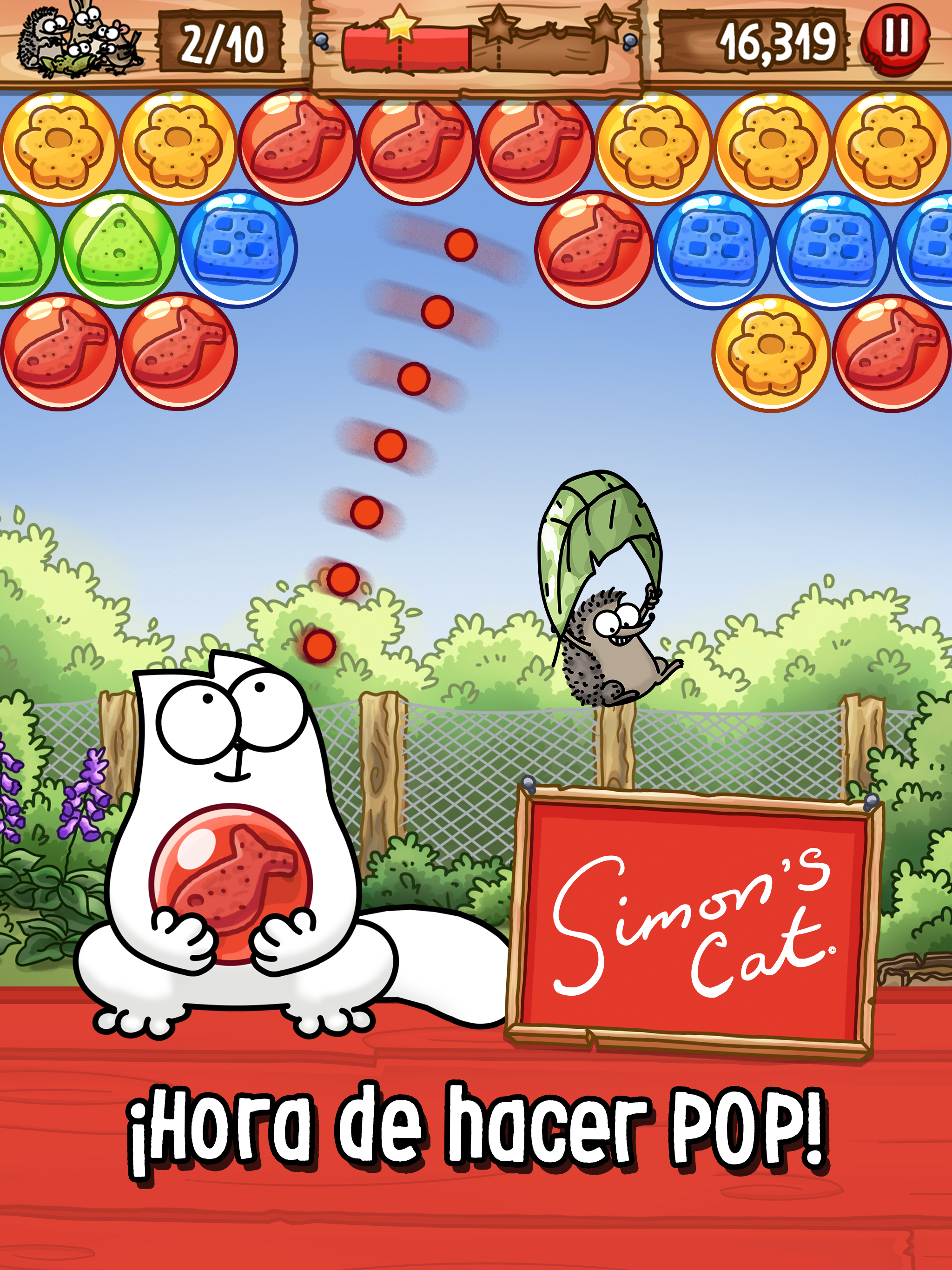 ¡Simon’s Cat in POP Time! - Una aventura de disparar burbujas Publicado por Tactile Games Ltd. ¡Mr. Potts ha llegado y está persiguiendo al gato de Simon y a su grupo de invasores de jardín! ¡Las adorables criaturas están atrapadas en burbujas y solo TÚ puedes liberarlas! ¡Únete al gato de Simon, Maisy, Chloe, Kitten, Jazz y a un sinfín de adorables criaturas en una divertida aventura a través de GATOTÁSTICOS lugares nuevos repletos de dulces esperando a que te los comas! ¡Prepárate para explotar un arcoíris de burbujas en este juego de puzles GRATIS que es totalmente ZARPAvilloso! ¡Mecánica de juego simple y adictiva! ¡Ábrete paso haciendo POP a través de niveles repletos de deliciosos dulces para rescatar a los adorable gatitos! • ¡Completa cientos de niveles vibrantes y desafiantes! • ¡Juega en eventos diarios para conseguir montones de monedas y potenciadores gratis! • ¡Disfruta de un elenco de encantadores personajes y nuevos escenarios creados por Simon y el equipo! ¡Estamos trabajando mucho para actualizar el juego con nuevos niveles que estamos convencidos que te dejarán ronroneando de felicidad! ¿Ya has jugado y te has divertido mucho? Estate al tanto de las nuevas actualizaciones y dedica un miaumento para dejarnos tu opinión :) También nos encontrarás en: Facebook: facebook.com/SimonsCatPopTime Instagram: instagram.com/SimonsCatOfficial YouTube: youtube.com/c/SimonsCat ¡GRACIAS Y MIAU!