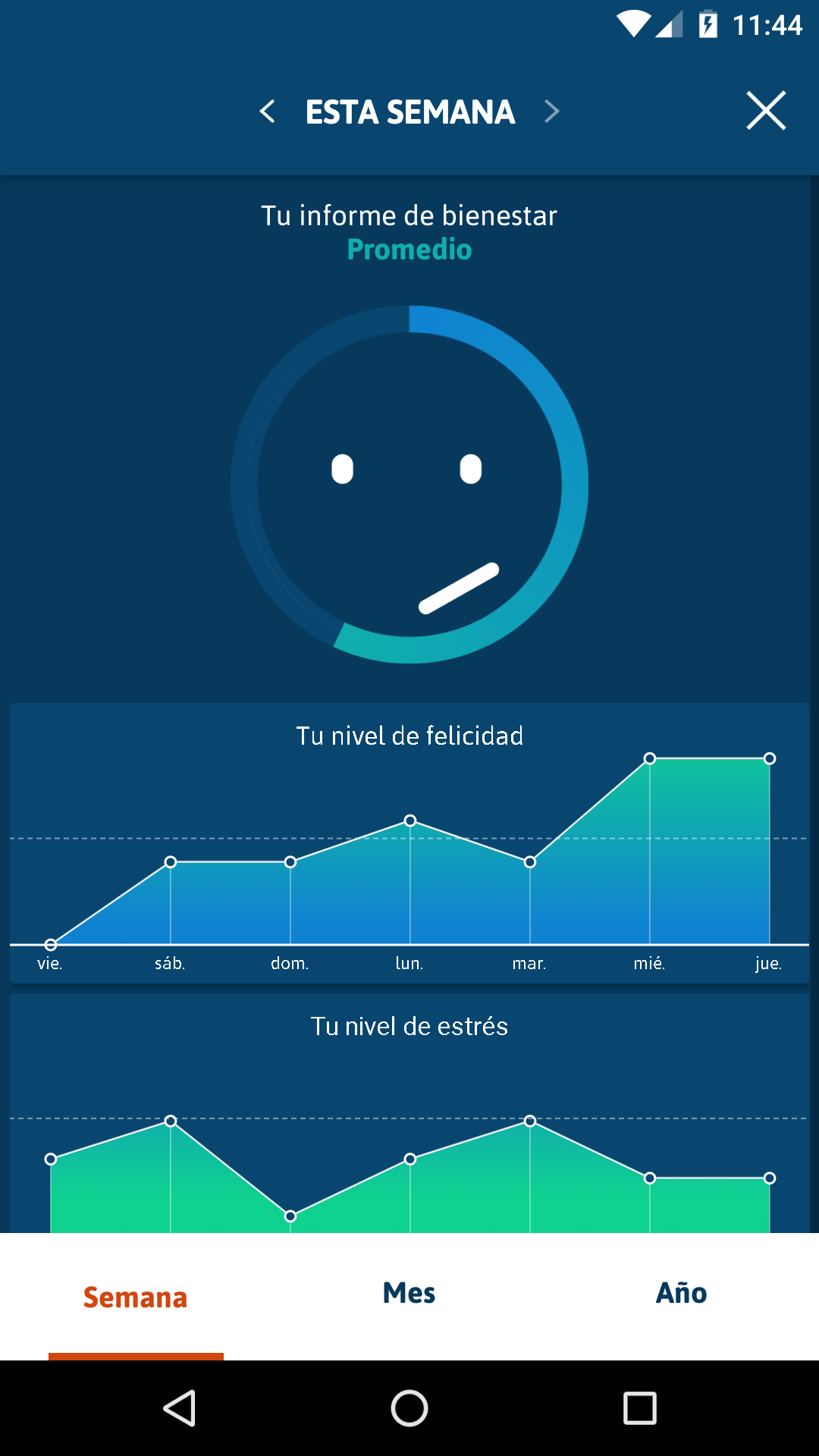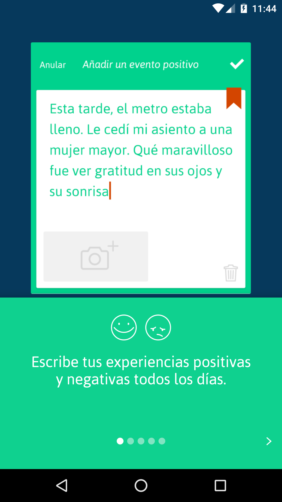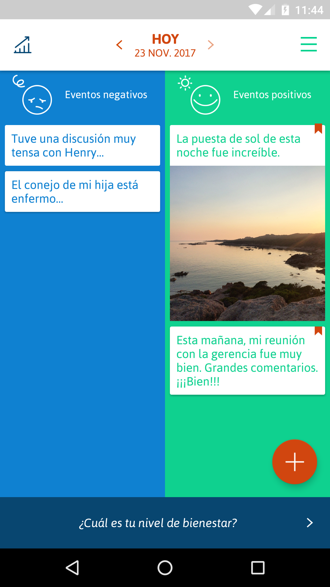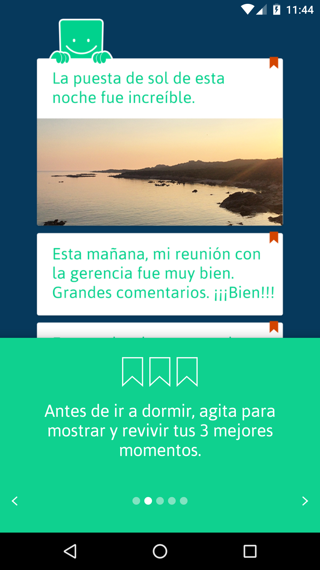 Smylife, una aplicación sencilla para mejorar tu bienestar. Usada diariamente, la aplicación Smylife ayuda a reforzar tu positividad y a aumentar significativamente tu bienestar. Sentirás sus efectos después de 2 o 3 semanas, reduciendo la tensión y la ansiedad. Inspirada en un ejercicio simple utilizado por muchos entrenadores y practicantes de psicología positiva, esta aplicación te ayuda a bajar tu nivel de estrés. Cada noche: - Anota las experiencias negativas y positivas del día. - Concéntrate en las tres mejores antes de ir a dormir. Smylife: un método comprobado y testado, facilitado digitalmente. Con Smylife, tu teléfono inteligente reemplaza la agenda: - Escribe las experiencias del día a medida que avanza - Clasifícalas por importancia - Recuérdalas para rememorar las mejores También puedes: - Ilustrar tus positivas (o negativas) experiencias con fotos sacadas en el momento - Comparte las mejores con tus amigos en las redes sociales, a través de mensaje de texto o por correo electrónico. - Los recordatorios te ayudan a organizarte y practicar el ejercicio diariamente - Un práctico barómetro mide tu bienestar y su progresión Usar Smylife es ser parte de la comunidad de Smylife, así como participar en su evolución y en una fascinante aventura humana. Con Smylife, sonríele a la vida, a tu vida: la que construyes, proteges y tomas el control. Smylife, ¡es tu vida! Más concretamente: Todos los días, escribe en Smylife las experiencias positivas y negativas que vives – sean las que pasen en el trabajo, en el colegio o en tu vida personal. Puedes ilustrarlas sacando fotos directamente en la aplicación, o vinculándolas a través de tu álbum. Hazlo en tu tiempo libre, tu viaje diario o en un tiempo específico del día. Para ayudarte, ¡programa tus recordatorios! ¡La felicidad crece cuando se comparte! Con solo un toque, envía una emoción de Smylife a tus familiares, en las redes sociales, a través de un mensaje de texto o por correo electrónico. Todas las noches, antes de irte a dormir, lee de nuevo tus anotaciones y selecciona los eventos positivos del día. ¡Si no has escrito nada, piensa en tu día y anótalos! Agita tu teléfono y concéntrate en esos momentos agradables antes de irte a dormir. Proporciona tus niveles de felicidad y estrés de un período determinado a la frecuencia que elijas, para medir el estado de tu bienestar. Sigue la evolución de su estrés, felicidad y bienestar a través del tiempo con el barómetro Smylife. Al hacer tus pequeños ejercicios con regularidad, encontrarás que tu bienestar está creciendo y, finalmente, se estabilizará a un alto nivel. ¡Estarás mejor preparado/a para el estrés diario!