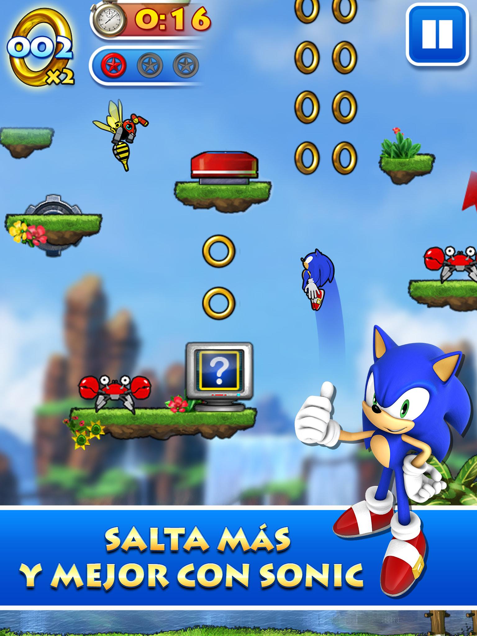 ¡Salta, rueda y machaca hasta el cielo mientras te enfrentas al Dr. Eggman con Sonic y sus amigos! En Sonic Jump correrás nuevas aventuras al estilo arcade. Inclina y toca la pantalla para superar los niveles del modo historia y los modos infinitos de Arcade. Visita nuevos y legendarios niveles de Sonic y diviértete durante horas. Desafía a tus amigos de todo el mundo para ver quién salta más lejos. JUEGA CON TUS PERSONAJES FAVORITOS Juega con tus personajes favoritos, incluyendo Sonic, Tails, Knuckles, Amy, Rouge, Silver y Blaze, cada uno con sus propias habilidades únicas. MUNDOS INCREÍBLES Salta y corre por la legendaria Zona Green Hill o visita mundos nuevos como las Zonas Mountain, Jungle, Blue Sky y Mechanical. MODO ARCADE E HISTORIA Explora 48 diferentes niveles para detener al malvado Dr. Eggman o salta hasta el final en el infinito modo Arcade. DIVERTIDOS DESAFÍOS Y AVENTURAS Tienes que ir a tope para superar cada nivel y ganar. Cada nivel y ambos modos de juego tienen recompensas especiales por completar misiones especiales. DESBLOQUEA PODEROSAS HABILIDADES Recoge Rings mientras juegas o cómpralos en la tienda. Con ellos podrás desbloquear más personajes, mejoras y mucho más. DESAFÍA AL MUNDO Compite con jugadores de todo el mundo por ver quién salta más alto en el modo Arcade o consigue la mejor puntuación en los marcadores. RESEÑAS DE LOS JUGADORES - 4/4 “Tanto si creciste con Sonic o no, Sonic Jump is de lo más divertido”. - Slide to Play - 4/5 “El modo historia y las misiones son lo mejor. Siempre tienes una razón para llagar a lo más alto”. - Digital Spy - 8/10 “Sonic Jump es una joyita que no me esperaba”. - App Gamer - 4/5 “SEGA ha hecho de Sonic Jump un juego independiente de gran valor tanto para los fans como para aquellos ajenos al universo de Sonic the Hedgehog.” - TouchGen - - - - - - Política de privacidad: https://privacy.sega.com/en/soa-pp Condiciones de uso: https://www.sega.com/EULA SEGA, the SEGA logo, SONIC THE HEDGEHOG and SONIC JUMP are either registered trade marks or trade marks of SEGA CORPORATION. or its affiliates. All rights reserved.