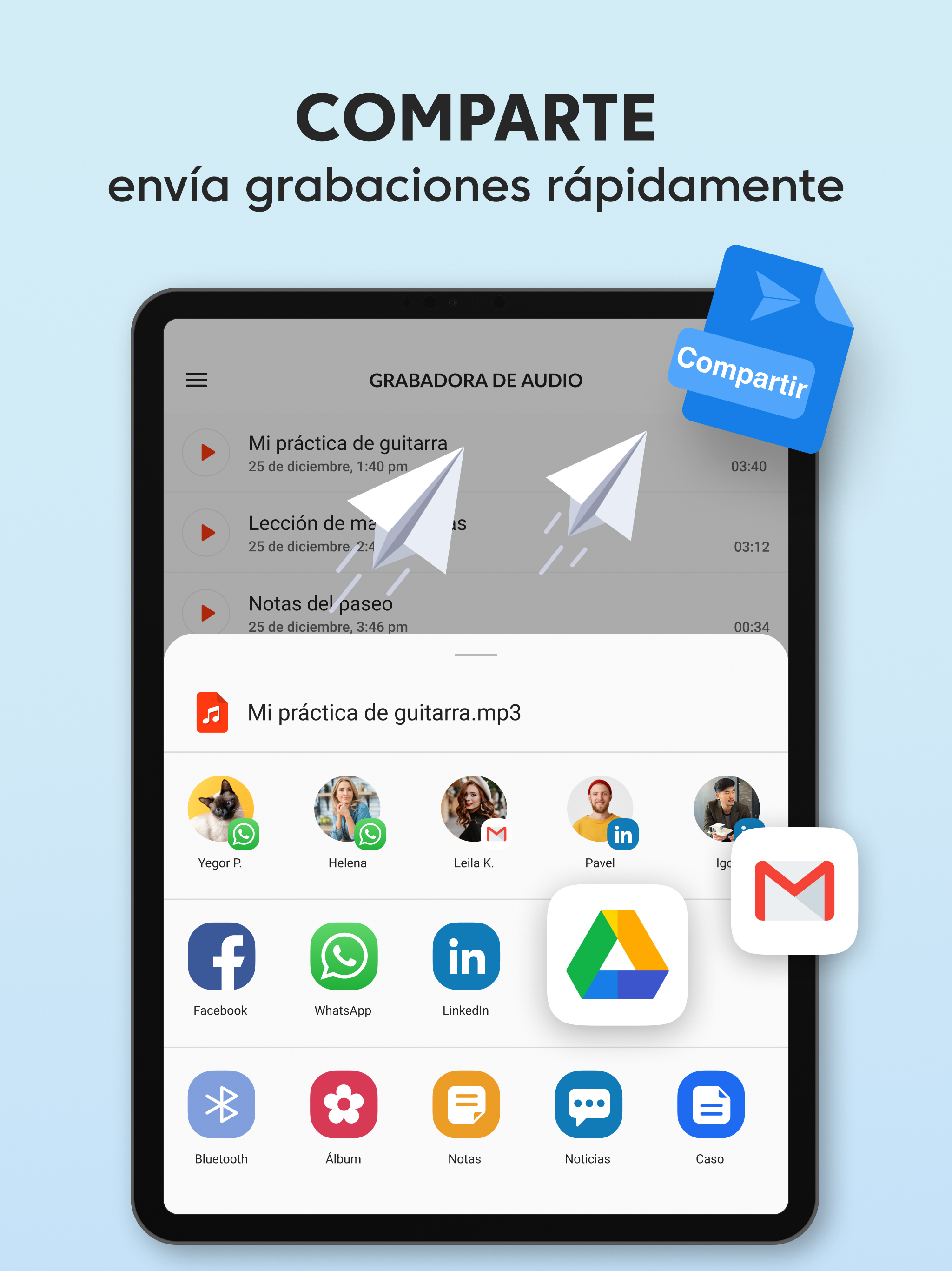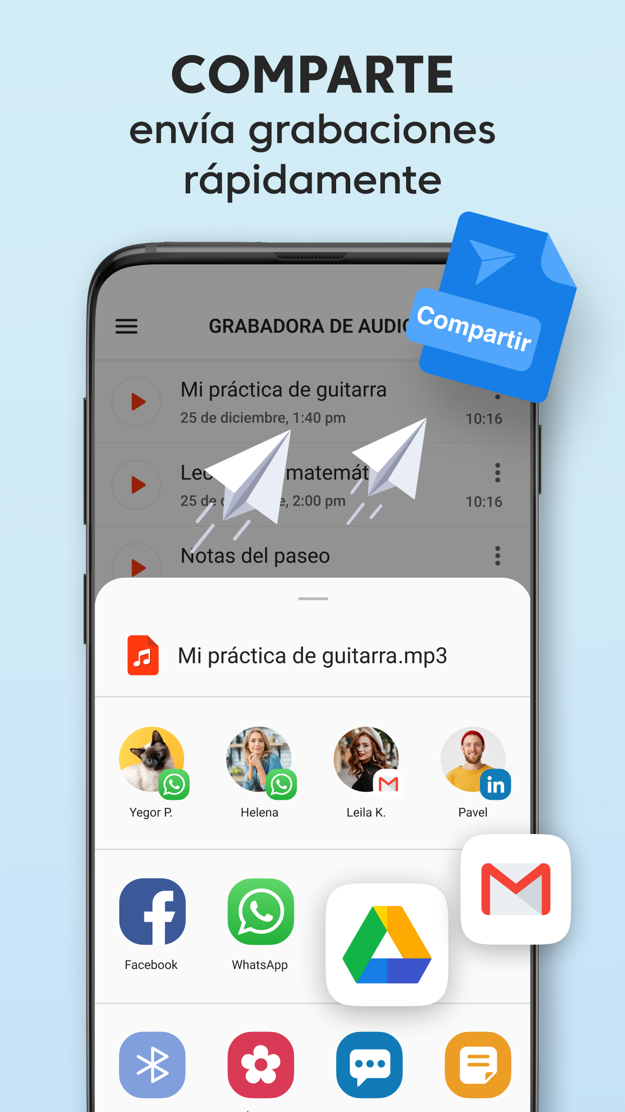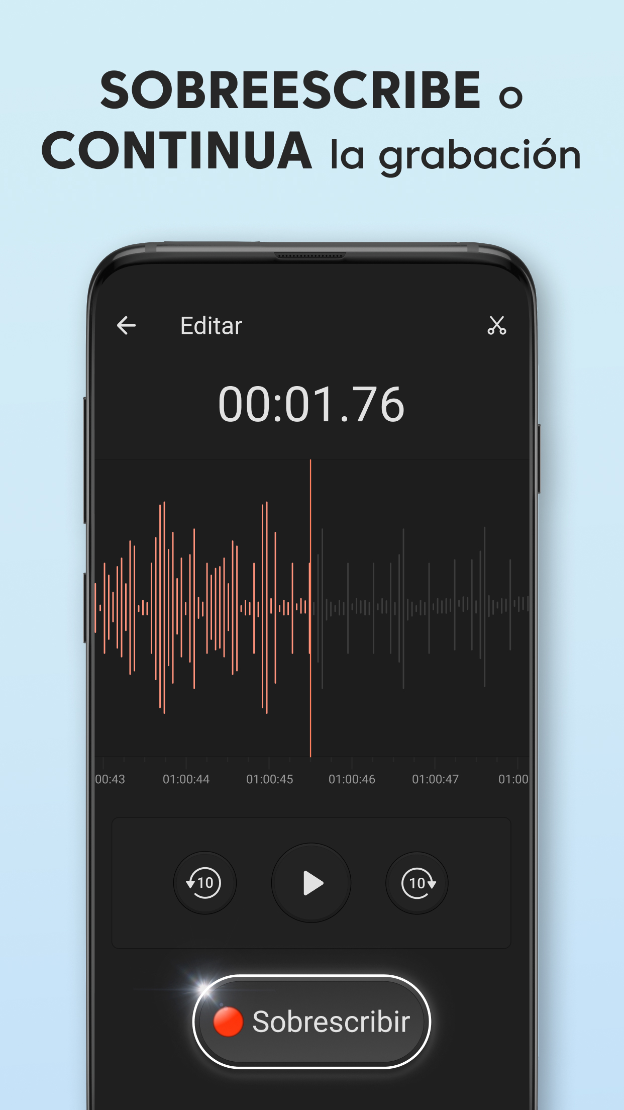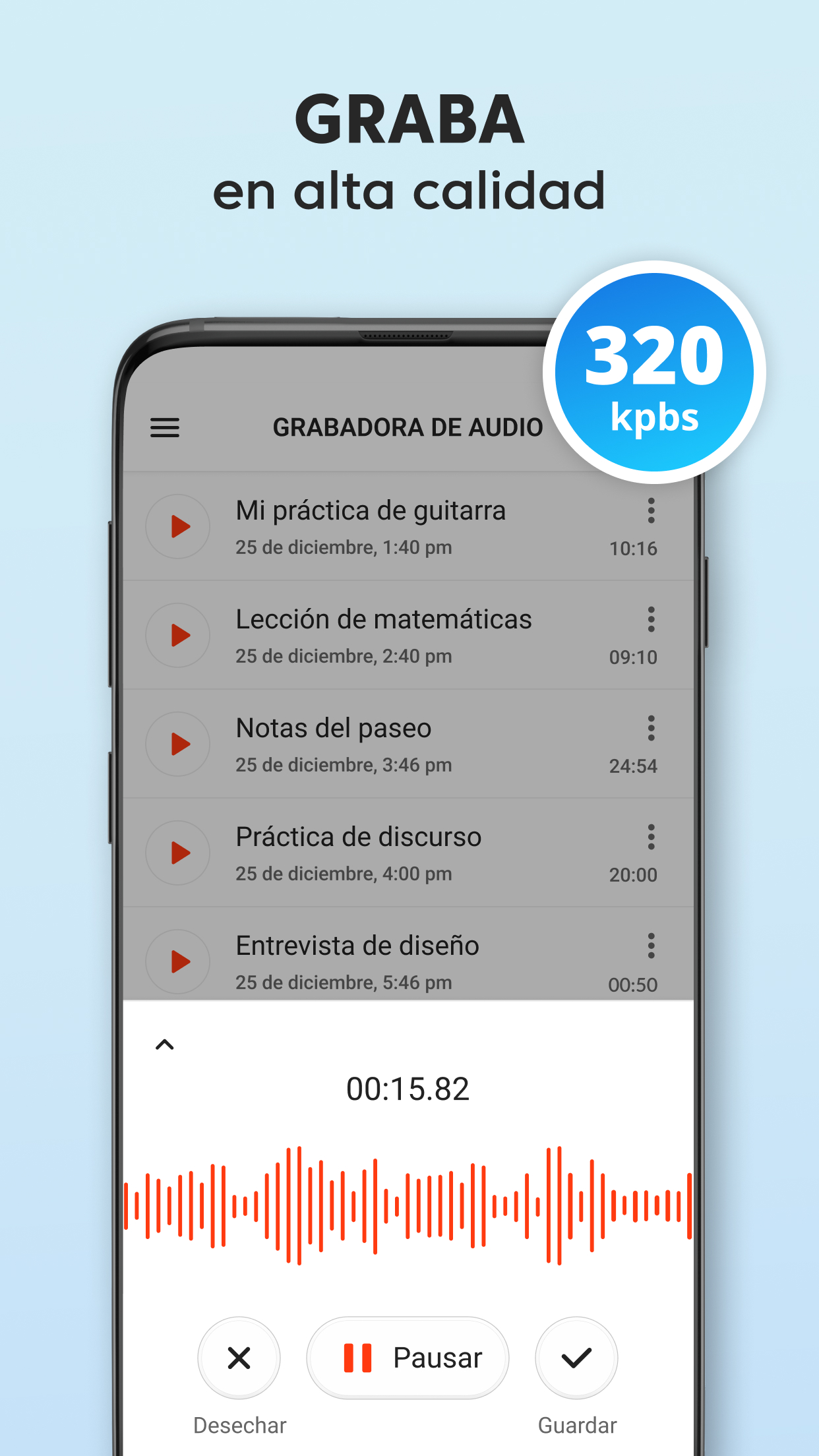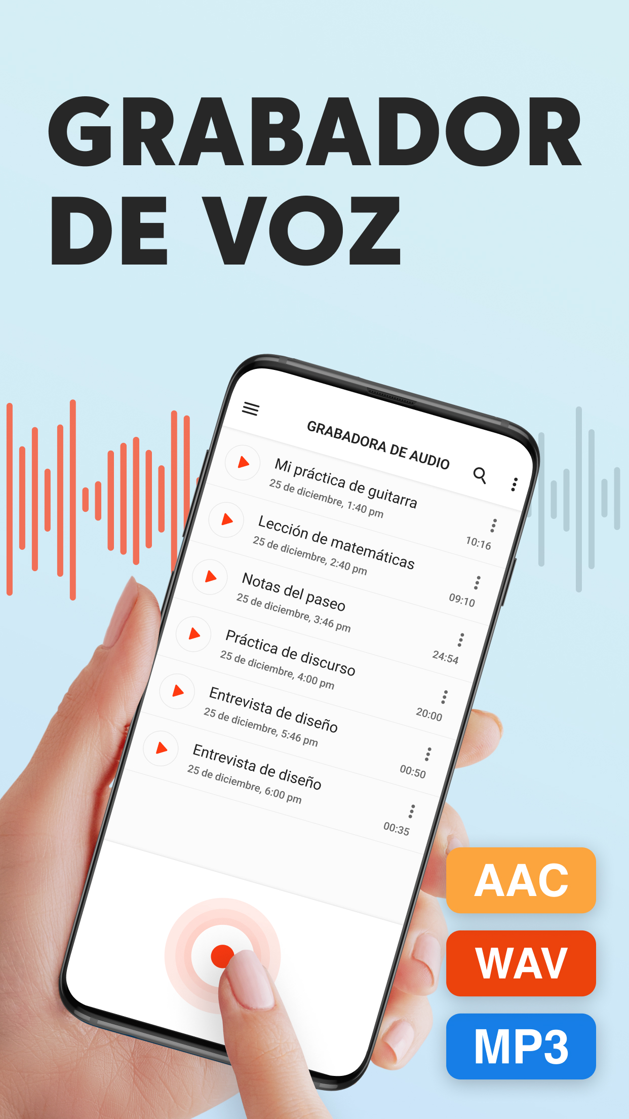 Grabadora de Voz Plus gratis es una aplicación de grabación de audio limpia y bien diseñada que es fácil de usar y captura un sonido increíble. Grabar un mensaje de voz, un recordatorio, una canción encantadora, una nota de audio o hasta el canto de los pájaros siempre estará al alcance de tu mano con nuestra grabadora de audio. Grabadora de Voz Plus tiene un conjunto de funciones robustas para grabar, reproducir y compartir en redes sociales: GRABACIÓN Sobrescribe grabaciones al instante Solo pon en pausa la grabación actual, regrésala al inicio, arrastrando hacia atrás la línea de avance, y sobrescribe el audio desde el punto seleccionado. Impresionante calidad de audio con opciones de sonido mono y estéreo La Grabadora de Voz Plus es compatible con los formatos AAC y WAV de grabación de voz. Grabación en segundo plano Sigue grabando aunque la pantalla esté apagada, cuando presionas el botón Inicio, los controles de grabación se moverán a la barra de notificaciones para tener un acceso rápido. Guardado automático Si la grabación es interrumpida, se guarda automáticamente con el nombre predeterminado, así no perderás la voz o música que capturaste. Alternativamente, también puedes guardar la grabación bajo tus términos, o desechar la grabación si quieres volver a intentarlo. Tiempo de grabación ilimitado Captura archivos de audio de cualquier tamaño, el único límite para el tamaño de tu grabación es tu deseo y el tamaño de la memoria de tu teléfono. REPRODUCCIÓN Un minirreproductor y un reproductor de pantalla completa Un minirreproductor disponible en la lista de grabaciones te permite escuchar la grabación de inmediato, y el reproductor de pantalla completa ofrece una conjunto de funciones avanzadas de reproducción. Velocidad de reproducción ajustable Reduce la velocidad hasta 0.25x, y acelera al doble de la velocidad de reproducción normal hasta 2.0x usando el reproductor de audio integrado. Compartir en redes sociales Comparte con otros tus momentos especiales, notas, talentos e ideas. Controles convenientes para la reproducción de audio Arrastra la línea de avance para saltar a un punto específico de la grabación. Puedes usar la Grabadora de Voz Plus para una amplia variedad de actividades que involucran la grabación de audio y la reproducción de la voz o música capturadas: Para el trabajo Graba reuniones importantes en la vida real y en zoom Practica tus discursos antes de presentarlos en público. Crea recordatorios de voz para capturar ideas brillantes que salen de la nada. Graba entrevistas o conversaciones para transcribirlas más tarde. Para estudiar Obtén las calificaciones más altas con las grabaciones de lecciones y seminarios en tu bolsillo. Incluso si el orador está legos y hay ruido de interferencia, las configuraciones del micrófono en la aplicación garantizan una alta calidad del audio. Para practicar música Grábate y a otros tocando instrumentos musicales y cantando, ya sea una sesión de práctica, una lección, una audición o un concierto en vivo. Captura melodías antes de que las olvides para compartirlas con el mundo. La Grabadora de Voz Plus remplazará perfectamente tu micrófono en esta situación. Para situaciones cotidianas Usa la Grabadora de Voz Plus en situaciones donde es importante tener grabados los detalles importantes, como una visita al médico. Captura el sonido de momentos especiales de tu vida o diviértete haciendo tonos de llamadas. Si buscas una aplicación gratis de grabación de voz, pero no quieres tener que usar funciones complicadas, la Grabadora de Voz Plus es lo tuyo. Es rápida, receptiva y útil, y te permite grabar en prácticamente cualquier situación sin tantos problemas.